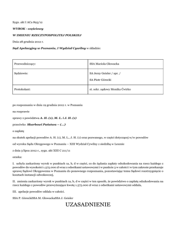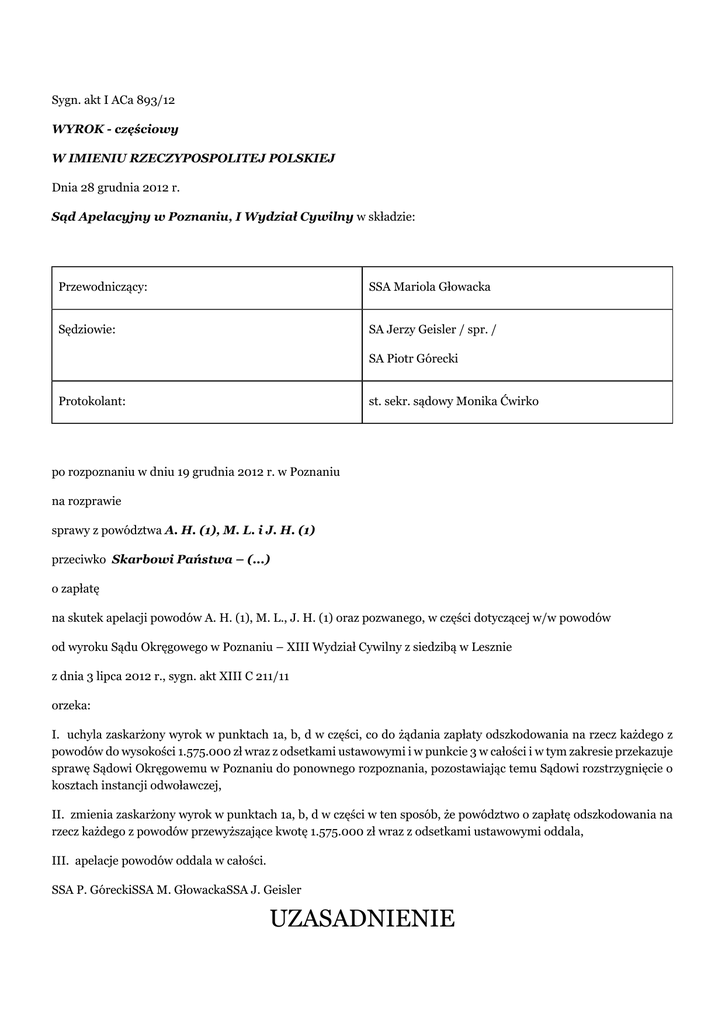 Sygn. akt I ACa 893/12 WYROK - częściowy W IMIENIU RZECZYPOSPOLITEJ POLSKIEJ Dnia 28 grudnia 2012 r. Sąd Apelacyjny w Poznaniu, I Wydział Cywilny w składzie: Przewodniczący: SSA Mariola Głowacka Sędziowie: SA Jerzy Geisler / spr. / SA Piotr Górecki Protokolant: st. sekr. sądowy Monika Ćwirko po rozpoznaniu w dniu 19 grudnia 2012 r. w Poznaniu na rozprawie sprawy z powództwa A. H. (1), M. L. i J. H. (1) przeciwko Skarbowi Państwa – (...) o zapłatę na skutek apelacji powodów A. H. (1), M. L., J. H. (1) oraz pozwanego, w części dotyczącej w/w powodów od wyroku Sądu Okręgowego w Poznaniu – XIII Wydział Cywilny z siedzibą w Lesznie z dnia 3 lipca 2012 r., sygn. akt XIII C 211/11 orzeka: I. uchyla zaskarżony wyrok w punktach 1a, b, d w części, co do żądania zapłaty odszkodowania na rzecz każdego z powodów do wysokości 1.575.000 zł wraz z odsetkami ustawowymi i w punkcie 3 w całości i w tym zakresie przekazuje sprawę Sądowi Okręgowemu w Poznaniu do ponownego rozpoznania, pozostawiając temu Sądowi rozstrzygnięcie o kosztach instancji odwoławczej, II. zmienia zaskarżony wyrok w punktach 1a, b, d w części w ten sposób, że powództwo o zapłatę odszkodowania na rzecz każdego z powodów przewyższające kwotę 1.575.000 zł wraz z odsetkami ustawowymi oddala, III. apelacje powodów oddala w całości. SSA P. GóreckiSSA M. GłowackaSSA J. Geisler UZASADNIENIE Powodowie A. H. (1), M. L., J. H. (2) i J. H. (1) wystąpili z roszczeniem przeciwko pozwanemu Skarbowi Państwa (...) domagając się zasądzenia od pozwanego na rzecz każdego z powodów kwoty po 9.000.000,00 złotych ( dziewięć milionów złotych ) wraz z ustawowymi odsetkami od dnia 1 kwietnia 2005 r. do dnia zapłaty, a nadto obciążenia kosztami procesu pozwanego z uwzględnieniem kosztów zastępstwa procesowego każdego z powodów według norm. Powodowie wnieśli również o zwolnienie ich od kosztów sądowych w sprawie. Żądanie swoje powodowie oparli na decyzji Ministra (...) z 17 sierpnia 2004 roku stwierdzającej nieważność decyzji z 2 listopada 1950 roku o przejęciu przedsiębiorstw na rzecz Państwa, w związku z przejęciem przez Państwo przedsiębiorstwa (...) w(...) Pozwany - Skarb Państwa(...) reprezentowany przez (...) w odpowiedzi na pozew wniósł o oddalenie powództwa w całości, oddalenie wniosków dowodowych, przeprowadzenie dowodu z dokumentów powołanych przez pozwanego i zasądzenie od powodów na rzecz Skarbu Państwa kosztów postępowania, w tym kosztów zastępstwa procesowego według norm. Pozwany podniósł zarzut przedawnienia roszczenia powodów, nie wykazania przez powodów szkody, braku podstaw do zasądzenia na rzecz powodów utraconych korzyści. W trakcie procesu - po sporządzeniu opinii przez biegłego, pismem procesowym z dnia 27 lutego 2012 r. powodowie rozszerzyli swoje żądania wnosząc zasądzenie na rzecz każdego z powodów kwoty po 11.714.385, 25 zł z odsetkami jak w pozwie z tytułu odszkodowania za utracone mienie oraz z tytułu braku możliwości korzystania i czerpania korzyści z wywłaszczonego mienia po 823.521,25 zł rocznie wraz z odsetkami ustawowymi od dnia 1 stycznia 1998 r. i odpowiednio od 1 stycznia 1999 r. przez kolejne lata do roku 2012. Wyrokiem z dnia 3.07.2012 r. Sąd Okręgowy w Poznaniu zasądził od pozwanego na rzecz każdego z powodów po 11.714.385,25 zł z odsetkami ustawowymi od dnia 1.04.2005 r., w pozostałym zakresie powództwo oddalił i orzekł o kosztach procesu. – k. 454 Pisemne ustalenia i motywy rozstrzygnięcia Sąd Okręgowy przedstawił na kartach 464-473. Sąd Okręgowy ustalił w sprawie, co następuje: Orzeczeniem numer 54 Ministra Przemysłu Lekkiego z dnia 2 listopada 1950 roku o przejęciu przedsiębiorstw na własność Państwa - zostało przejęte z dniem ogłoszenia orzeczenia Przedsiębiorstwo (...). H. iS. L., ul. (...). Kolejnym zarządzeniem Ministra Przemysłu Lekkiego z dnia 26 kwietnia 1951 roku w sprawie objęcia przedsiębiorstw firmy (...). H. i S. L., ul. (...) zarządzone zostało objęcie przedsiębiorstwa przejętego na własność Państwa. Do objęcia przedsiębiorstwa wyznaczono (...) Zakłady (...) w K.. W dniu 23 maja 1951 r. sporządzony został protokół zdawczo - odbiorczy dotyczący przejęcia spornego przedsiębiorstwa i wszelkich jego składników. Kolejny protokół zdawczo - odbiorczy wraz z załącznikami sporządzony został w dniu 26 lipca 1951 r. Powodowie i ich poprzednicy prawni do chwili niniejszego procesu nie uzyskali jakiegokolwiek odszkodowania za znacjonalizowane mienie, mimo iż nacjonalizacja miała odbywać się za odszkodowaniem. A. H. (2) i Z. H. utracili faktyczne władztwo nad znacjonalizowanym przedsiębiorstwem zimą 1945 roku. Dowód: - orzeczenie numer 54 z załącznikiem (k. 12), - zarządzenie Ministra Przemysłu Lekkiego z dnia 26 kwietnia 1951 r. (k. 13), - protokoły z załącznikami zdawczo - odbiorcze ( k. 43 - 64 ), - bilans otwarcia G. (...) (k. 66 - 79 ), - orzeczenie ministra Przemysłu Lekkiego z dnia 3 stycznia 1959 r. w sprawie zatwierdzenia protokołu zdawczo – odbiorczego Przedsiębiorstwa: G. (...) A. H. (2) i S. ( k. 344 ), - korespondencja A. H. z 20 września 1958 r. wraz z dokumentacją ( k. 80 - 84 ). W skład znacjonalizowanego przedsiębiorstwa (...) wchodziły zabudowane nieruchomości, oznaczone jako parcele numer 9 i 10, dla których prowadzono księgę wieczystą wykaz (...), a następnie Kw (...) Sądu Rejonowego w Lesznie. Mimo, iż z decyzji nacjonalizacyjnej wynikało wprost, że parcela numer 11 nie wchodzi w skład przedsiębiorstwa, została ona również przejęta przez pozwanego, upaństwowiona i w miejsce dotychczasowego właściciela A. H. (2) wpisano jako właściciela Skarb Państwa. Dnia 10 grudnia 1990 r. następcy prawni A. H. (2) złożyli wniosek o stwierdzenie nieważności aktów nacjonalizacyjnych. Podjęli oni również wiadomość z prasy o zamiarze sprzedaży przez Skarb P