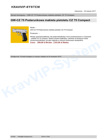 Utworzono : 03 marzec 2017 Sprzęt treningowy > GW-CZ 75 Podarunkowa makieta pistoletu CZ 75 Compact GW-CZ 75 Podarunkowa makieta pistoletu CZ 75 Compact Model : GW-CZ 75 Podarunkowa makieta pistoletu CZ 75 Compact Producent : Wersja upominkowa dla pasjonatów broni produkowanych w Czechach - pistolet CZ 75 compact. Idealny prezent dla członków sił zbrojnych służb mundurowych lub jako nagroda w różnych konkursach strzeleckich. m te Cena : 299,00 zł Brutto ( 243,09 zł Netto) s y Dostępność: Produkt dostępny w naszym sklepie od 24 wrzesień 2010 V v a r S IP K kontakt : - [email protected] Strona 1/{nb}