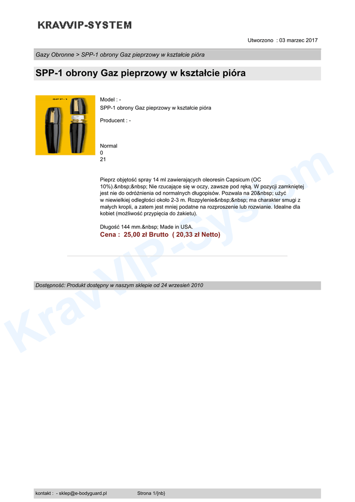 Utworzono : 03 marzec 2017 Gazy Obronne > SPP-1 obrony Gaz pieprzowy w kształcie pióra SPP-1 obrony Gaz pieprzowy w kształcie pióra Model : SPP-1 obrony Gaz pieprzowy w kształcie pióra Producent : - Normal 0 21 m te Pieprz objętość spray 14 ml zawierających oleoresin Capsicum (OC 10%). Nie rzucające się w oczy, zawsze pod ręką. W pozycji zamkniętej jest nie do odróżnienia od normalnych długopisów. Pozwala na 20 użyć w niewielkiej odległości około 2-3 m. Rozpylenie ma charakter smugi z małych kropli, a zatem jest mniej podatne na rozproszenie lub rozwianie. Idealne dla kobiet (możliwość przypięcia do żakietu). s y S IP Długość 144 mm. Made in USA. Cena : 25,00 zł Brutto ( 20,33 zł Netto) V v a r Dostępność: Produkt dostępny w naszym sklepie od 24 wrzesień 2010 K kontakt : - [email protected] Strona 1/{nb}
