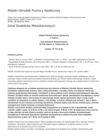 Miejski Ośrodek Pomocy Społecznej Źródło: http://mops.bip.legnica.eu/lop/zakres-dzialania-osrodk/1116,Dzial-Dodatkow-Mieszkaniowych.html Wygenerowano: Piątek, 3 marca 2017, 23:18 Środa, 09 kwietnia 2014 Dział Dodatków Mieszkaniowych Miejski Ośrodek Pomocy Społecznej w Legnicy Dział Dodatków Mieszkaniowych 59-220 Legnica ul. Chojnowska 112 telefon: 76 722 18 06 Podstawa prawna: - Ustawa z dnia 21 czerwca 2001 r. o dodatkach mieszkaniowych (Dz. U. z 2013 r., poz. 966 z późniejszymi zmianami) - Rozporządzenie Rady Ministrów z dnia 28 grudnia 2001 r. w sprawie dodatków mieszkaniowych (Dz. U. Nr 156, poz. 1817 z późniejszymi zmianami) - Wyrok Trybunału Konstytucyjnego z dnia 9 maja 2006 r. (Dz. U. Nr 84, poz.585 i poz.587) Dodatki mieszkaniowe wypłacane są przez Miejski Ośrodek Pomocy Społecznej w Legnicy od 1 grudnia 1998 r. Dodatek mieszkaniowy jest świadczeniem obligatoryjnym, które przysługuje wszystkim osobom spełniającym warunki ustawowe. Ustawa określa zarówno przesłanki przyznania dodatku, jak również sposób ustalania jego wysokości. Organ przyznający dodatki mieszkaniowe nie ma swobody w wyborze rozstrzygnięcia. Decyzje nie są podejmowane w ramach tzw. uznania administracyjnego. Podstawą ubiegania się o dodatek mieszkaniowy jest złożenie w Miejskim Ośrodku Pomocy Społecznej prawidłowo wypełnionego wniosku, który należy potwierdzić u zarządcy lokalu oraz dołączyć deklaracje członków gospodarstwa domowego o dochodach za okres pełnych trzech miesięcy poprzedzających datę jego złożenia. Zarządca lokalu na wniosku potwierdza dane dotyczące: adresu zamieszkania wnioskodawcy, nazwę i siedzibę zarządcy domu, tytuł prawny do zajmowanego lokalu, sposób ogrzewania lokalu i wody, kwoty wydatków na mieszkanie za ostatni miesiąc ( czyli miesiąc, w którym składany jest wniosek ). Gdy w lokalu mieszkalnym nie ma instalacji centralnego ogrzewania, bieżącej ciepłej wody lub też instalacji gazu, wówczas wymagany jest ostatni rachunek za energię elektryczną. Wnioski o przyznanie dodatku mieszkaniowego przyjmowane są w pokoju nr 307 w poniedziałki, środy, czwartki i piątki w godz. od 8.00 do 13.00, a we wtorki od godz. 8.00 do 15.00. W pokoju tym można również, w ciągu miesiąca od daty złożenia wniosku, odebrać decyzję o przyznaniu dodatku mieszkaniowego. Szczegółowych informacji dotyczących dodatków mieszkaniowych udziela kierownik Działu Dodatków Mieszkaniowych w godz. od 7.30 do 15.30 (pokój nr 306). Dodatek mieszkaniowy przysługuje osobom, które posiadają tytuł prawny do zajmowanego lokalu, spełniają kryterium metrażowe i dochodowe. Łączne spełnienie tych warunków stanowi podstawę do uzyskania pomocy w formie dofinansowania do kosztów utrzymania mieszkania. Katalog tytułów prawnych do lokalu mieszkalnego, uprawniających do ubiegania się o dodatek mieszkaniowy został określony w artykule 2 powołanej ustawy. Dodatek mieszkaniowy, na podstawie tylko jednego z wymienionych tytułów, przysługuje: - najemcom oraz podnajemcom lokali mieszkalnych; - osobom mieszkającym w lokalach mieszkalnych, do których przysługuje im spółdzielcze prawo do lokalu mieszkalnego; - osobom mieszkającym w lokalach mieszkalnych znajdujących się w budynkach stanowiących ich własność i właścicielom samodzielnych lokali mieszkalnych; - innym osobom mającym tytuł prawny do zajmowanego lokalu mieszkalnego i ponoszącym wydatki związane z jego zajmowaniem; - osobom zajmującym lokal mieszkalny bez tytułu prawnego, oczekującym na przysługujący im lokal zamienny albo socjalny. Od dnia 1 stycznia 2002 roku ujednolicone zostały kryteria dotyczące powierzchni normatywnej w budynkach wybudowanych przed rokiem 1945 oraz po roku 1945. Obecnie - zgodnie z obowiązującą ustawą o dodatkach mieszkaniowych, normatywna powierzchnia użytkowa lokalu w przeliczeniu na liczbę członków gospodarstwa domowego nie może przekraczać 35 m2 – dla 1 osoby, 40 m2 – dla 2 osób, 45 m2 – dla 3 osób, 55m2 – dla 4 osób, 65 m2 – dla 5 osób, 70 m2 – dla 6 osób, a w razie zamieszkiwania większej liczby osób dla każdej kolejnej osoby zwiększa się normatywna powierzchnię o 5 m2. Normatywną powierzchnię zwiększa się o 15 m2, jeżeli w lokalu mieszkalnym zamieszkuje osoba niepełnosprawna poruszająca się na wózku inwalidzkim lub osoba niepełnosprawna, jeżeli jej niepełnosprawność wymaga zamieszkiwania w oddzielnym pokoju. O wymogu zamieszkiwania w oddzielnym pokoju orzekają powiatowe zespoły do spraw orzekania o niepełnosprawności. Dodatek mieszkaniowy przysługuje także, gdy powierzchnia użytkowa lokalu mieszkalnego nie przekracza normatywnej powierzchni o więcej niż 30% albo 50% pod warunkiem, że udział powierzchni pokoi i kuchni w powierzchni użytkowej tego lokalu nie przekracza 60%. Kolejny warunek jaki musi spełnić osoba ubiegająca się o dodatek mieszkaniowy związany jest z dochodami, jakie uzyskują członkowie jej gospodarstwa domowego. Za dochód - w świetle przytoczonej ustawy - uważa się wszelkie przychody po odliczeniu kosztów ich uzyskania oraz po odliczeniu składek na ubezpieczenie emerytalne i rentowe oraz na ubezpieczenie chorobowe, określonych w przepisach o systemie ubezpieczeń społecznych, chyba że zostały już zaliczone do kosztów uzyskania przychodu. Do dochodu nie wlicza się świadczeń pomocy materialnej dla uczniów, dodatków dla sierot zupełnych, jednorazowych zapomóg z tytułu urodzenia się dziecka, dodatku z tytułu urodzenia dziecka, pomocy w zakresie dożywiania, zasiłków pielęgnacyjnych, zasiłków okresowych z pomocy społecznej, jednorazowych świadczeń pieniężnych i świadczeń w naturze z pomocy społecznej, dodatku mieszkaniowego, dodatku energetycznego, zapomogi pieniężnej, o której mowa w przepisach o zapomodze pieniężnej dla niektórych emerytów, rencistów i osób pobierających świadczenie przedemerytalne