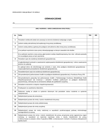 POWIATOWY URZĄD PRACY W OPOLU OŚWIADCZENIE Ja,_______________________________________________________________________________ _____________________________________________________________________________ ___ (IMIĘ I NAZWISKO, ADRES ZAMIESZKANIA ORAZ PESEL) Lp. Fakty TAK 1 Posiadam meldunek (stały lub czasowy) na terenie działania tutejszego urzędu. 2 Jestem osobą zatrudnioną lub wykonuję inną pracę zarobkową. 3 Jestem osobą zdolną i gotową do podjęcia zatrudnienia albo innej pracy zarobkowej a) w pełnym wymiarze czasu pracy obowiązującego w danym zawodzie lub służbie b) w połowie wymiaru czasu pracy, gdyż jestem osobą niepełnosprawną, lecz stan zdrowia pozwala mi na podjęcie pracy w tym wymiarze. 4 Posiadam wpis do ewidencji działalności gospodarczej. a) zgłosiłem(am) wniosek o zawieszenie wykonywania działalności gospodarczej i okres zawieszenia jeszcze nie upłynął. b) upłynął okres do określonego we wniosku o wpis, dnia podjęcia działalności gospodarczej – rozpocząłem(am) prowadzenie działalności gospodarczej. 5 Posiadałem(am) wpis do ewidencji działalności gospodarczej. 6 Otrzymałem(am) jednorazowo środki na podjęcie działalności gospodarczej z Funduszu Pracy, EFS. 7 Otrzymałem(am) pożyczkę lub jednorazowe środki z Państwowego Funduszu Rehabilitacji Osób Niepełnosprawnych lub instytucji z udziałem środków publicznych na podjęcie działalności pozarolniczej, rolniczej lub na wniesienie wkładu do spółdzielni socjalnej. 8 Posiadam orzeczenie o stopniu niepełnosprawności. 9 Przebywam na zwolnieniu lekarskim. 10 Pobieram naukę w szkole w systemie dziennym lub posiadam status studenta w systemie stacjonarnym. 11 Nabyłem(am) prawo do emerytury . 12 Nabyłem(am) prawo do renty z tytułu niezdolności do pracy. 13 Nabyłem(am) prawo do renty szkoleniowej. 14 Nabyłem(am) prawo do renty socjalnej. 15 Nabyłem(am) prawo do renty rodzinnej w wysokości przekraczającej połowę minimalnego wynagrodzenia za pracę. 16 Nabyłem(am) prawo do renty z tytułu niezdolności do pracy, przyznanej przez zagraniczny organ rentowy, w wysokości co najmniej najniższej renty z tytułu niezdolności do pracy, o której mowa w ustawie z dnia 17 grudnia 1998r. o emeryturach i rentach z Funduszu Ubezpieczeń Społecznych. 1 NIE 17 Nabyłem(am) prawo do emerytury, przyznanej przez zagraniczny organ emerytalny, w wysokości co najmniej najniższej emerytury, o której mowa w ustawie z dnia 17 grudnia 1998r. o emeryturach i rentach z Funduszu Ubezpieczeń Społecznych. 18 Pobieram zasiłek przedemerytalny. 19 Pobieram świadczenie przedemerytalne. 20 Pobieram nauczycielskie świadczenie kompensacyjne. 21 Pobieram świadczenie rehabilitacyjne. 22 Pobieram świadczenia szkoleniowe. 23 Pobieram zasiłek chorobowy. 24 Pobieram zasiłek macierzyński. 25 Pobieram zasiłek w wysokości zasiłku macierzyńskiego - po ustaniu zatrudnienia, innej pracy zarobkowej lub zaprzestaniu prowadzenia pozarolniczej działalności. 26 Jestem właścicielem lub posiadaczem ( samoistnym lub zależnym ) nieruchomości rolnej o powierzchni użytków rolnych powyżej 2 ha przeliczeniowych. 27 Podlegam ubezpieczeniu emerytalno-rentowemu z tytułu stałej pracy jako współmałżonek w gospodarstwie rolnym o powierzchni użytków rolnych przekraczającej 2 ha przeliczeniowe. 28 Podlegam ubezpieczeniu emerytalno-rentowemu z tytułu stałej pracy jako domownik w gospodarstwie rolnym o powierzchni użytków rolnych przekraczającej 2 ha przeliczeniowe. 29 Uzyskuję przychody podlegające opodatkowaniu podatkiem dochodowym z działów specjalnych produkcji rolnej ( chyba, że dochód z działów specjalnych produkcji rolnej, obliczony dla ustalenia podatku dochodowego od osób fizycznych, nie przekracza wysokości przeciętnego dochodu z pracy w indywidualnych gospodarstwach rolnych z 2 ha przeliczeniowych ustalonego przez Prezesa Głównego Urzędu Statystycznego na podstawie przepisów o podatku rolnym ). a) podlegam ubezpieczeniu emerytalno-rentowemu z tytułu stałej pracy jako współmałżonek w takim gospodarstwie b) podlegam ubezpieczeniu emerytalno-rentowemu z tytułu stałej pracy jako domownik w takim gospodarstwie 30 Podlegam obowiązkowi ubezpieczenia społecznego lub zaopatrzenia emerytalnego (nie dotyczy ubezpieczenia społecznego rolników ). 31 Biorę udział w stażu organizowanym przez inny podmiot niż powiatowy urząd pracy. 32 Biorę udział w szkoleniu organizowanym przez inny podmiot niż powiatowy urząd pracy. 33 Jestem osobą tymczasowo aresztowaną lub odbywam karę pozbawienia wolności, nie dotyczy kary pozbawienia wolności odbywanej poza zakładem karnym w systemie dozoru elektronicznego. 34 Uzyskuję miesięcznie przychód w wysokości przekraczającej połowę minimalnego wynagrodzenia za pracę z wyłączeniem przychodów uzyskanych z tytułu odsetek lub innych przychodów od środków pieniężnych zgromadzonych na rachunku bankowym. 35 Korzystam ze świadczeń pomocy społecznej. 36 Pobieram, na podstawie przepisów o pomocy społecznej, zasiłek stały. 2 37 Pobieram na podstawie przepisów o świadczeniach rodzinnych, świadczenie pielęgnacyjne. 38 Pobieram na podstawie przepisów o świadczeniach rodzinnych, specjalny zasiłek opiekuńczy lub dodatek do zasiłku rodzinnego z tytułu samotnego wychowywania dziecka i utraty prawa do zasiłku dla bezrobotnych na skutek upływu ustawowego okresu jego pobierania. 39 Pobieram na podstawie przepisów o ustaleniu i wypłacie zasiłków dla opiekunów zasiłek dla opiekuna. 40 Sprawuję opiekę nad osobą zależną (osobą wymagającą ze względu na stan zdrowia lub wiek stałej opieki, połączoną więzami rodzinnymi lub powinowactwem z osobą objętą usługami lub instrumentami rynku pracy lub pozostającą z nią we wspólnym gospodarstwie domowym). Imię, nazwisko, data urodzenia i stopień pokrewieństwa osoby zależnej 41 Jestem zarejestrowany(a) w innym urzędzie pracy jako osoba