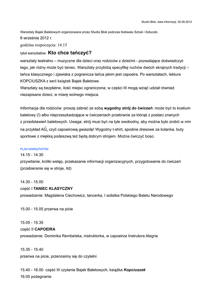 Studio Blok, data informacji: 30.08.2012 Warsztaty Bajek Baletowych organizowane przez Studio Blok podczas festiwalu Sztuki i Sztuczki. 8 września 2012 r. godzina rozpoczęcia: 14.15 tytuł warsztatów: Kto chce tańczyć? warsztaty teatralno – muzyczne dla dzieci oraz rodziców z dziećmi - pozwalające doświadczyć tego, jak różny może być taniec. Warsztaty przybliżą specyfikę ruchów dwóch skrajnych tradycji – tańca klasycznego i zjawiska z pogranicza tańca jakim jest capoeira. Po warsztatach, lektura KOPCIUSZKA z serii książek Bajek Baletowe. Warsztaty są bezpłatne, ilość miejsc ograniczona; w części III mogą wziąć udział również niezapisane dzieci, w miarę wolnego miejsca. Informacja dla rodziców: proszę zabrać ze sobą wygodny strój do ćwiczeń: może być to kostium baletowy (!) albo nieprzeszkadzające w ćwiczeniach przebranie za którąś z postaci znanych z przedstawień baletowych. Uwaga: strój musi być na tyle swobodny, aby można było zrobić w nim na przykład AÚ, czyli capoeirową gwiazdę! Wygodny t-shirt, spodnie dresowe za kolanka, buty sportowe z miękką podeszwą też będą dobrym strojem. Można ćwiczyć boso. PLAN WARSZTATÓW 14.15 - 14.30 przywitanie, krótki wstęp, przekazanie informacji organizacyjnych, przygotowanie do ćwiczeń (przebieranie się w stroje, itd) 14.30 - 15.00 część I TANIEC KLASYCZNY prowadzenie: Magdalena Ciechowicz, tancerka, I solistka Polskiego Baletu Narodowego 15.00 - 15.05 przerwa na picie 15.05 - 15.35 część II CAPOEIRA prowadzenie: Dominika Rembelska, instruktorka, w capoeirze Instrutora Alegria 15.35 - 15.40 przerwa na picie, przenosimy się do czytelni 15.40 - 16.00 część III czytanie Bajek Baletowych, książka Kopciuszek 16.00 pożegnanie Zajęcia dla dzieci poprowadzą: Magdalena Ciechowicz tancerka, pierwsza solistka Polskiego Baletu Narodowego W 2000 roku ukończyła Państwowa Szkołę Baletową w Warszawie. W trakcie nauki została laureatką pierwszej nagrody Ogólnopolskiego Konkursu Tańca w Gdańsku w kategorii juniorów (1997), a następnie finalistką tego konkursu w kategorii seniorów (1999). Wielokrotna stypendystka oraz finalistka licznych konkursów. W 2000 roku dołączyła do zespołu baletowego Teatru Wielkiego - Opery Narodowej. Tańczyła m.in. role: Wróżki Śmiałości w Śpiącej królewnie, w Pas de quatre w Jeziorze łabędzim i Królowej Kwiatów w Dziadku do orzechów, Wróżki Zimy w Kopciuszku. Po występach z prestiżowymi zespołami za granicą, w 2004 roku wróciła na scenę Teatru Wielkiego jako solistka, a od 2010 roku jest pierwszą solistką. [więcej na www.taniecpolska.pl] Dominika Rembelska instruktorka capoeiry oraz dyplomowana instruktorka samoobrony Już jako młoda dziewczyna angażowała się w prace związane ze sztuką i teatrem. Współpracowała jako aktorka z takimi teatrami jak: Gardzienice, Akt oraz Montownia. Prowadziła również własną grupę teatralną Uszy Wyobraźni. Capoeirę trenuje od 13 lat. Jej mistrzem jest Mestre Bailarino, założyciel grupy International Capoeira Raiz. Od 2001 roku prowadzi projekty społeczne z młodzieżą ze środowisk patologicznych. Organizuje również pokazy i treningi capoeiry w domach dziecka i więzieniach. Organizowała i współorganizowała wiele festiwali kultury brazylijskiej oraz warsztatów z brazylijskimi mistrzami Capoeiry. W 2009 r., w programie 'You Can Dance - Po prostu tańcz' zapoznała z capoeirą Piotra i Łukasza. Choreografię do tego występu ułożyła z jej pomocą Natalia Madejczyk. Rozwija swoje umiejętności na stażach i warsztatach w Polsce, Europie i Brazylii, gdzie była już ośmiokrotnie by trenować Capoeirę pod okiem największych mistrzów. Katarzyna Gardzina-Kubała baletem fascynowała się od dziecka. Nie zrealizowała dziecięcych marzeń by zostać tancerką, ale z powodzeniem zastąpiła je pracą w charakterze dziennikarki i krytyka muzycznego, specjalistki od spraw tańca i baletu. Ukończyła rusycystykę i studia dziennikarskie na Uniwersytecie Warszawskim; wiedzę o balecie pogłębiała na studiach teorii tańca na Uniwersytecie Muzycznym F. Chopina w Warszawie. Była dziennikarką działu kultury „Trybuny”, krytykiem muzycznym „Życia Warszawy”, współpracowała z większością fachowych polskich czasopism muzycznych: „Ruchem Muzycznym”, „Muzyką”, „Twoją Muzą”, czasopismami teatrów operowych w Warszawie i Poznaniu. Publikuje w programach teatralnych spektakli baletowych oraz w prasie lokalnej. Współtworzy Ogólnopolski Klub Miłośników Opery „Trubadur” oraz forum dyskusyjne balet.pl. W 2008 roku brała udział w reaktywacji kwartalnika „Taniec”. Była sekretarzem literackim Teatru Wielkiego – Opery Narodowej. Obecnie jest krytykiem niezależnym, współpracuje z Instytutem Muzyki i Tańca. Autorka tekstów popularyzujących balet w książkach z serii Bajki Baletowe: Jezioro łabędzie, Dziadek do orzechów, Kopciuszek. Patron medialny warsztatów: Bliżej Przedszkola Dziękujemy Zachęcie Narodowej Galerii Sztuki w Warszawie za wypożyczenie niezbędnego sprzętu. Bajki Baletowe to seria książek dla dzieci i młodzieży popularyzująca wiedzę o balecie. Patron serii: Teatr Wielki Opera Narodowa Polski Balet Narodowy Patroni medialni: Radio PIN, Qlturka.pl, We-dwoje.pl, Babyonline.pl, Mini-Kultura.pl, Bliżej Przedszkola, Kulturaonline.pl.