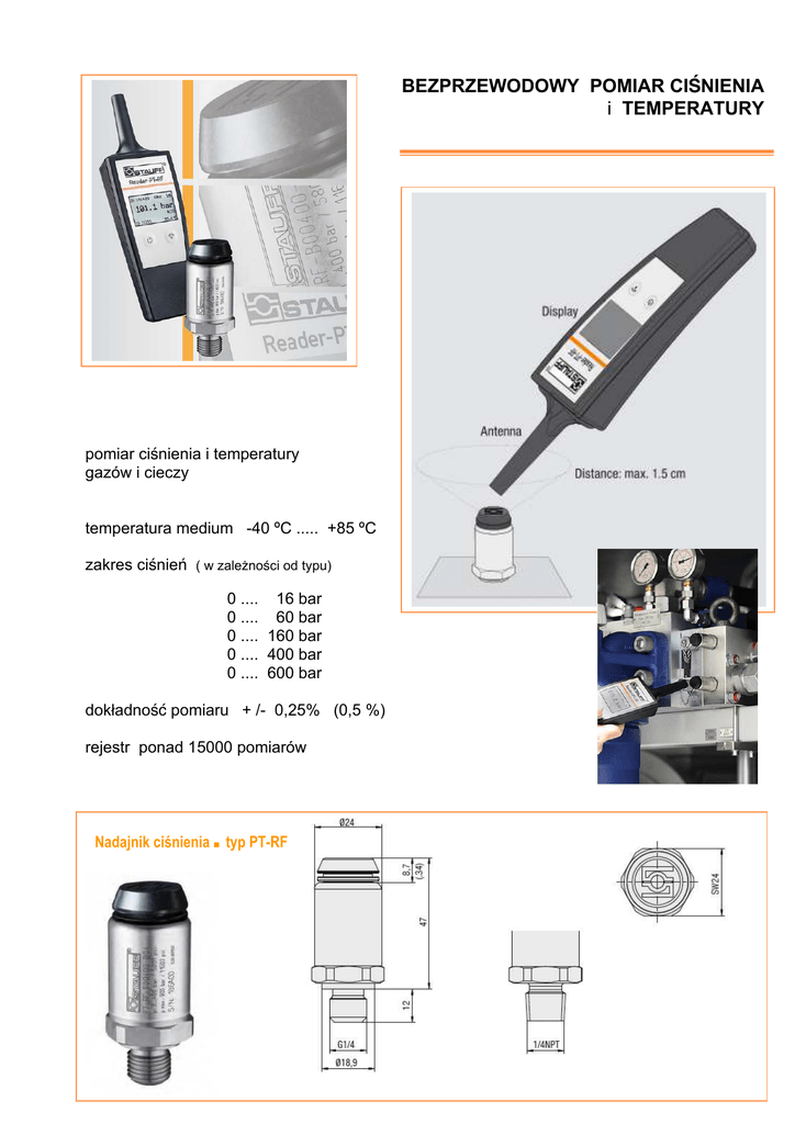 BEZPRZEWODOWY POMIAR CIŚNIENIA i TEMPERATURY pomiar ciśnienia i temperatury gazów i cieczy temperatura medium -40 ºC ..... +85 ºC zakres ciśnień ( w zależności od typu) 0 .... 16 bar 0 .... 60 bar 0 .... 160 bar 0 .... 400 bar 0 .... 600 bar dokładność pomiaru + /- 0,25% (0,5 %) rejestr ponad 15000 pomiarów Nadajnik ciśnienia ■ typ PT-RF