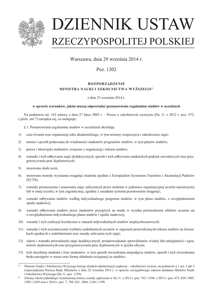 DZIENNIK USTAW RZECZYPOSPOLITEJ POLSKIEJ :DUV]DZDGQLDZU]HĞQLDU 3R] 52=325=Ą'=(1,( 0,1,675$1$8.,,6=.2/1,&7:$:<ĩ6=(*2 ]GQLDZU]HĞQLDU ZVSUDZLHZDUXQNyZMDNLPPXV]ąRGSRZLDGDüSRVWDQRZLHQLDUHJXODPLQXVWXGLyZZXF]HOQLDFK 1DSRGVWDZLHDUWXVWDZ\]GQLDOLSFDU±3UDZRRV]NROQLFWZLHZ\ĪV]\P']8]USR] ]SyĨQ]P]DU]ąG]DVLĊFRQDVWĊSXMH 3RVWDQRZLHQLDUHJXODPLQXVWXGLyZZXF]HOQLDFKRNUHĞODMą F]DVWUZDQLDRUD]RUJDQL]DFMĊURNXDNDGHPLFNLHJRZW\PWHUPLQ\UR]SRF]ĊFLDL]DNRĔF]HQLD]DMĊü WHUPLQLVSRVyESRGDZDQLDGRZLDGRPRĞFLVWXGHQWyZSURJUDPyZVWXGLyZZW\PSODQyZVWXGLyZ SUDZDLRERZLą]NLVWXGHQWyZ]ZLą]DQH]RUJDQL]DFMąLWRNLHPVWXGLyZ ZDUXQNLLWU\ERGE\ZDQLD]DMĊüG\GDNW\F]Q\FKVSRVyELWU\ERGE\ZDQLDVWXGHQFNLFKSUDNW\N]DZRGRZ\FKRUD]SU]\JRWRZ\ZDQLDSUDFG\SORPRZ\FK VWRVRZDQHVNDOHRFHQ VWRVRZDQHPHWRG\Z\UDĪDQLDRVLąJQLĊüVWXGHQWD]JRGQLH](XURSHMVNLP6\VWHPHP7UDQVIHUXL$NXPXODFML3XQNWyZ (&76 ZDUXQNLSU]HQRV]HQLDLX]QDZDQLD]DMĊü]DOLF]RQ\FKSU]H]VWXGHQWDZMHGQRVWFHRUJDQL]DF\MQHMXF]HOQLPDFLHU]\VWHM OXEZLQQHMXF]HOQLZW\P]DJUDQLF]QHM]JRGQLH]]DVDGDPLV\VWHPXSU]HQRV]HQLDRVLąJQLĊü ZDUXQNL RGE\ZDQLD VWXGLyZ ZHGáXJ LQG\ZLGXDOQHJR SURJUDPX VWXGLyZ Z W\P SODQX VWXGLyZ ] XZ]JOĊGQLHQLHP RSLHNLQDXNRZHM ZDUXQNL RGE\ZDQLD VWXGLyZ SU]H] VWXGHQWyZ SU]\MĊW\FK QD VWXGLD Z Z\QLNX SRWZLHUG]HQLD HIHNWyZ XF]HQLD VLĊ ]XZ]JOĊGQLHQLHPLQG\ZLGXDOQHJRSODQXVWXGLyZLRSLHNLQDXNRZHM ZDUXQNLLWU\EUHDOL]DFMLNV]WDáFHQLDZUDPDFKLQG\ZLGXDOQ\FKVWXGLyZPLĊG]\REV]DURZ\FK ZDUXQNLLWU\EXF]HVWQLF]HQLDZ\ELWQLHX]GROQLRQ\FKXF]QLyZZ]DMĊFLDFKSU]HZLG]LDQ\FKWRNLHPVWXGLyZQDNLHUXQNDFK]JRGQ\FK]X]GROQLHQLDPLRUD]]DVDG\]DOLF]DQLDW\FK]DMĊü ]DNUHVLZDUXQNLSURZDG]HQLD]DMĊüG\GDNW\F]Q\FKSU]HSURZDG]DQLDVSUDZG]LDQyZZLHG]\OXEXPLHMĊWQRĞFLLHJ]DPLQyZG\SORPRZ\FKRUD]SU]\JRWRZ\ZDQLDSUDFG\SORPRZ\FKZMĊ]\NXREF\P WU\EVNUHĞODQLDVWXGHQWD]OLVW\VWXGHQWyZZW\PVSRVyEVWZLHUG]DQLDQLHSRGMĊFLDVWXGLyZVSRVyELWU\EVWZLHUG]DQLD EUDNXSRVWĊSyZZQDXFHRUD]IRUPĊVNáDGDQLDUH]\JQDFML]HVWXGLyZ 0LQLVWHU1DXNLL6]NROQLFWZD:\ĪV]HJRNLHUXMHG]LDáHPDGPLQLVWUDFMLU]ąGRZHM±V]NROQLFWZRZ\ĪV]HQDSRGVWDZLHXVWSNW UR]SRU]ąG]HQLD 3UH]HVD 5DG\ 0LQLVWUyZ ] GQLD ZU]HĞQLD U Z VSUDZLH V]F]HJyáRZHJR ]DNUHVX G]LDáDQLD 0LQLVWUD 1DXNL L6]NROQLFWZD:\ĪV]HJR']8SR] =PLDQ\WHNVWXMHGQROLWHJRZ\PLHQLRQHMXVWDZ\]RVWDá\RJáRV]RQHZ']8]USR]L]USR] LRUD]]USR]L ']LHQQLN8VWDZ ±± 3R] ZDUXQNLSU]\]QDZDQLDVWXGHQWRPXUORSyZRG]DMĊüZW\PF]DVWUZDQLDXUORSXNUyWNRWHUPLQRZHJRLGáXJRWHUPLQRZHJRRUD]XVSUDZLHGOLZLDQLDNUyWNRWUZDáHMQLHREHFQRĞFLQD]DMĊFLDFK ZDUXQNL]PLDQ\NLHUXQNXOXEIRUP\VWXGLyZ ZDUXQNLLWU\EX]\VNLZDQLD]DOLF]HĔLVNáDGDQLDHJ]DPLQyZZURNXOXEVHPHVWU]HZW\P]DOLF]DQLDVWXGHQFNLFKSUDNW\N]DZRGRZ\FK ZDUXQNLSU]HSURZDG]DQLDHJ]DPLQXNRPLV\MQHJRZW\PVNáDGNRPLVMLSU]HSURZDG]DMąFHMHJ]DPLQNRPLV\MQ\RUD] IRUP\WHJRHJ]DPLQX]XZ]JOĊGQLHQLHPXG]LDáXZHJ]DPLQLHREVHUZDWRUDZVND]DQHJRSU]H]VWXGHQWD VSRVyELQIRUPRZDQLDVWXGHQWyZRX]\VNDQ\FKZ\QLNDFKHJ]DPLQyZL]DOLF]HĔ VSRVyELWU\EXG]LHODQLDZDUXQNRZHJR]H]ZROHQLDQDSRGMĊFLHVWXGLyZZQDVWĊSQ\PURNXOXEVHPHVWU]H ZDUXQNLGRSXV]F]HQLDGRHJ]DPLQXG\SORPRZHJRLWU\EMHJRVNáDGDQLDRUD]VSRVyEREOLF]DQLDZ\QLNXVWXGLyZ WU\ESU]HSURZDG]DQLDQDZQLRVHNVWXGHQWDOXESURPRWRUDRWZDUWHJRHJ]DPLQXG\SORPRZHJR ZDUXQNLZ]QDZLDQLDVWXGLyZ ZDUXQNLXNRĔF]HQLDVWXGLyZ 5HJXODPLQ VWXGLyZ RNUHĞOD VSRVyE GRVWRVRZDQLD RUJDQL]DFML L ZáDĞFLZHM UHDOL]DFML SURFHVX G\GDNW\F]QHJR GR V]F]HJyOQ\FK SRWU]HE VWXGHQWyZ EĊGąF\FK RVREDPL QLHSHáQRVSUDZQ\PL Z W\P GRVWRVRZDQLD ZDUXQNyZ RGE\ZDQLD VWXGLyZGRURG]DMXQLHSHáQRVSUDZQRĞFL 5HJXODPLQ\VWXGLyZXFKZDORQHSU]HGGQLHPZHMĞFLDZĪ\FLHQLQLHMV]HJRUR]SRU]ąG]HQLD]DFKRZXMąPRFGRNRĔFD URNXDNDGHPLFNLHJR 5R]SRU]ąG]HQLHZFKRG]LZĪ\FLH]GQLHPSDĨG]LHUQLNDU 0LQLVWHU1DXNLL6]NROQLFWZD:\ĪV]HJRZ]M.K. Ratajczak 1LQLHMV]HUR]SRU]ąG]HQLHE\áRSRSU]HG]RQHUR]SRU]ąG]HQLHP0LQLVWUD1DXNLL6]NROQLFWZD:\ĪV]HJR]GQLDOLSFDUZVSUDZLHZDUXQNyZMDNLPPXV]ąRGSRZLDGDüSRVWDQRZLHQLDUHJXODPLQXVWXGLyZZXF]HOQLDFK']81USR]NWyUHWUDFLPRF ]GQLHPZHMĞFLDZĪ\FLHQLQLHMV]HJRUR]SRU]ąG]HQLDQDSRGVWDZLHDUWSNWXVWDZ\]GQLDOLSFDUR]PLDQLHXVWDZ\± 3UDZRRV]NROQLFWZLHZ\ĪV]\PRUD]QLHNWyU\FKLQQ\FKXVWDZ']8SR]