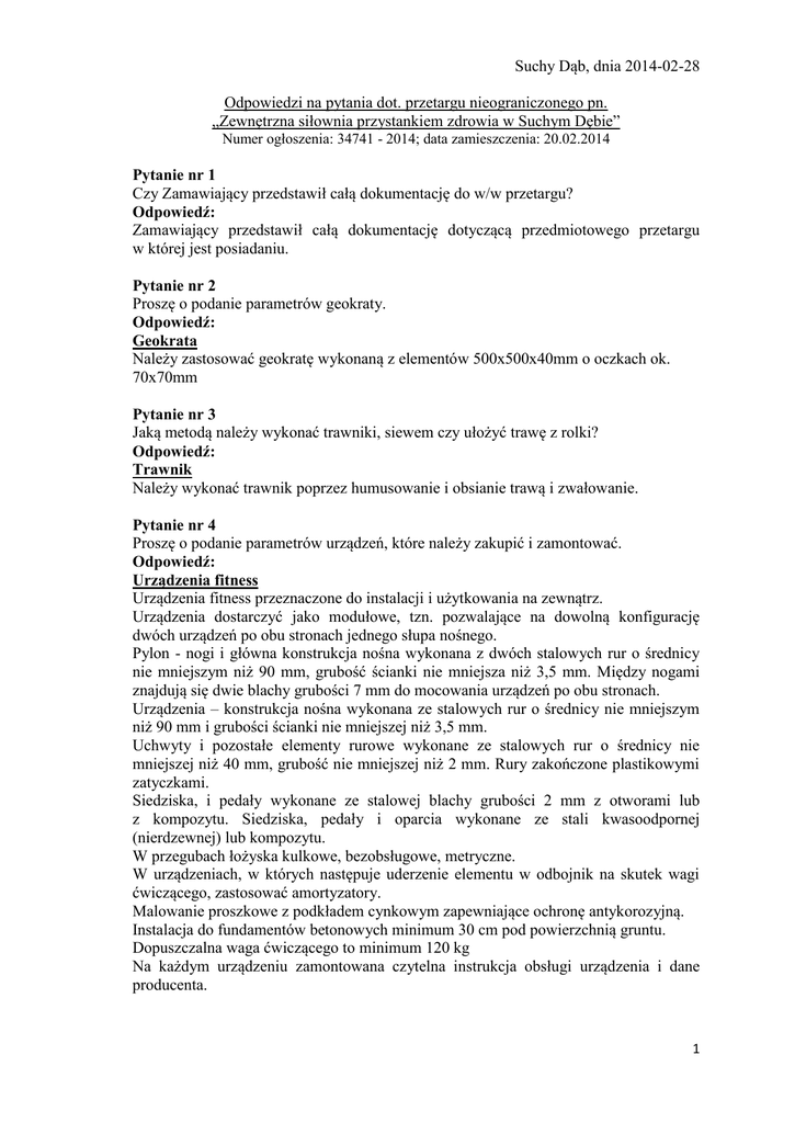 Suchy Dąb, dnia 2014-02-28 Odpowiedzi na pytania dot. przetargu nieograniczonego pn. „Zewnętrzna siłownia przystankiem zdrowia w Suchym Dębie” Numer ogłoszenia: 34741 - 2014; data zamieszczenia: 20.02.2014 Pytanie nr 1 Czy Zamawiający przedstawił całą dokumentację do w/w przetargu? Odpowiedź: Zamawiający przedstawił całą dokumentację dotyczącą przedmiotowego przetargu w której jest posiadaniu. Pytanie nr 2 Proszę o podanie parametrów geokraty. Odpowiedź: Geokrata Należy zastosować geokratę wykonaną z elementów 500x500x40mm o oczkach ok. 70x70mm Pytanie nr 3 Jaką metodą należy wykonać trawniki, siewem czy ułożyć trawę z rolki? Odpowiedź: Trawnik Należy wykonać trawnik poprzez humusowanie i obsianie trawą i zwałowanie. Pytanie nr 4 Proszę o podanie parametrów urządzeń, które należy zakupić i zamontować. Odpowiedź: Urządzenia fitness Urządzenia fitness przeznaczone do instalacji i użytkowania na zewnątrz. Urządzenia dostarczyć jako modułowe, tzn. pozwalające na dowolną konfigurację dwóch urządzeń po obu stronach jednego słupa nośnego. Pylon - nogi i główna konstrukcja nośna wykonana z dwóch stalowych rur o średnicy nie mniejszym niż 90 mm, grubość ścianki nie mniejsza niż 3,5 mm. Między nogami znajdują się dwie blachy grubości 7 mm do mocowania urządzeń po obu stronach. Urządzenia – konstrukcja nośna wykonana ze stalowych rur o średnicy nie mniejszym niż 90 mm i grubości ścianki nie mniejszej niż 3,5 mm. Uchwyty i pozostałe elementy rurowe wykonane ze stalowych rur o średnicy nie mniejszej niż 40 mm, grubość nie mniejszej niż 2 mm. Rury zakończone plastikowymi zatyczkami. Siedziska, i pedały wykonane ze stalowej blachy grubości 2 mm z otworami lub z kompozytu. Siedziska, pedały i oparcia wykonane ze stali kwasoodpornej (nierdzewnej) lub kompozytu. W przegubach łożyska kulkowe, bezobsługowe, metryczne. W urządzeniach, w których następuje uderzenie elementu w odbojnik na skutek wagi ćwiczącego, zastosować amortyzatory. Malowanie proszkowe z podkładem cynkowym zapewniające ochronę antykorozyjną. Instalacja do fundamentów betonowych minimum 30 cm pod powierzchnią gruntu. Dopuszczalna waga ćwiczącego to minimum 120 kg Na każdym urządzeniu zamontowana czytelna instrukcja obsługi urządzenia i dane producenta. 1 Urządzenia są wykonane w oparciu o normy PN-EN 1176-1:2009 potwierdzone aktualnym świadectwem lub certyfikatem. Urządzenia muszą być przeznaczone i bezpieczne dla dzieci, dorosłych i seniorów w podeszłym wieku. Pytanie nr 5 Proszę o podanie parametrów, z jakiego materiału należy wykonać: ławki, kosze, tablice i stojaki na rowery? Odpowiedź: Ławki Na terenie siłowni zewnętrznej planuje się montaż 4 sztuk ławek ogrodowych z oparciem. Ławki na stelażu metalowym z siedziskiem wykonanym z elementów drewnianych lub kompozytowych. Siedzisko ograniczone po obu stronach podłokietnikami. Wzór ławki przedstawiono na poniższym obrazie. Kosze na śmieci Ponadto przewiduje się montaż 7 koszy na śmieci. Wzór kosza przedstawiono na poniższym obrazie 2 Stojaki dla rowerów Stojak dla rowerów z rury stalowej ze stali nierdzewnej wykonać zgodnie z rysunkiem Wykonać 10 stojaków osadzonych na fundamentach betonowych w odstępie co 0,5m. Tablica informacyjna Tablica informacyjna zawierająca instrukcję użytkowania. 3 Pytanie nr 6 Proszę o sprecyzowanie jakie parametry należy przyjąć w doborze oświetlenia. Jakie wymagania muszą spełniać. Obecnie na rynku jest szeroki wybór oświetlenia, z powyższym proszę o dokładne parametry. Odpowiedź: Oprawa uliczna Należy zastosować oprawę uliczną sodową o mocy 250W z kloszem w klasie odporności I. 4