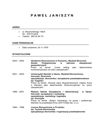 PAWEŁ JANISZYN ADRES • • ul. Skowrońskiego 16b/5 48 – 200 Prudnik Telefon: 665 02 82 70 DANE PERSONALNE • Data urodzenia: 20.11.1979 WYKSZTAŁCENIE 2003 – 2004 Akademia Ekonomiczna w Poznaniu, Wydział Ekonomii, Studia Podyplomowe w zakresie ubezpieczeń gospodarczych Praca na temat: „Cross selling jako determinanta konkurencyjności na rynku ubezpieczeń”. 2001 – 2003 Uniwersytet Opolski w Opolu, Wydział Ekonomiczny, kierunek: Ekonomia specjalizacja: ekonomika i zarządzanie przedsiębiorstwem tyt. magistra Praca na temat: „Rozwój więzi długookresowych między firmą a klientem jako determinanta konkurencyjności na rynku ubezpieczeń”. 1998 – 2001 w Opolu Wyższa Szkoła Zarządzania i Administracji kierunek: zarządzanie i marketing specjalizacja: marketing i logistyka tyt. licencjata Praca na temat: „Wpływ marketingu na gusta i preferencje klientów na przykładzie firmy UDV Polska Sp. z o.o. 1994 – 1998 Liceum Ekonomiczne w Prudniku tyt. Technik Ekonomista specjalizacja ekonomika i organizacja przedsiębiorstw ODBYTE SZKOLENIA 11/10 CoachWise Equipped 08/10 Ensize analiza 02/10 CoachWise Essentials 01/09 Extended DISC Polska Analiza indywidualna oraz zespołowa Extended DISC® 11/2007 KEY Polska Sp. z o.o. Techniki prezentacji z elementami Train the Trainer z obszaru technik sprzedaży 2006 - 2007 Nowe Motywacje w Krakowie Certyfikat rocznego projektu Trener w zakresie: Prowadzenie prezentacji i wykładów szkoleniowych, Praca z grupą w oparciu o interaktywne metody – gry i ćwiczenia grupowe, Prowadzenie technik symulacyjnych, Trudne sytuacje w pracy z grupą szkoleniową, Badanie potrzeb szkoleniowych, Projektowanie programów szkoleniowych. 01/2006 Ośrodek Doradztwa i Treningu Kierowniczego w Gdańsku Techniki Sprzedaży 02/2006 Ośrodek Doradztwa i Treningu Kierowniczego w Gdańsku Negocjacje 11/2005 Nowe Motywacje w Krakowie Doskonalenie Umiejętności Kierowniczych 09/2005 Polsko – Amerykański Instytut Zarządzania w Lublinie Zaawansowane Techniki Sprzedaży 09/2005 Nowe Motywacje w Krakowie Planowanie i Organizowanie Pracy Zespołu Sprzedażowego 11/2001 Akademia Ekonomiczna w Krakowie Negocjacje Handlowe DOŚWIADCZENIE ZAWODOWE 2000 / 2001 Spółdzielcza Kasa Oszczędnościowo – Kredytowa im. Franciszka Stefczyka w Sopocie O/Katowice na stanowisku przedstawiciel finansowy Zakres obowiązków: bezpośrednia sprzedaż usług finansowych Osiągnięcia: najlepszy debiut w Oddziale Katowice 2001 Spółdzielcza Kasa Oszczędnościowo – Kredytowa w Katowicach na stanowisku dysponent, kasjer Zakres obowiązków: prowadzenie oddziału przy ZEC Opole Osiągnięcia: wzrost zadowolenia klientów z obsługi oraz sprzedaży o 40% 03.09.2001 Referent Zespołu Obsługi Klienta PZU S.A. Inspektorat w Prudniku Zakres obowiązków: rozliczenie podmiotów sprzedaży, obsługa obowiązkowych ubezpieczeń OC i budynków 01.08.2002 Inspektor Zespołu Obsługi Klienta PZU S.A. Inspektorat w Prudniku Zakres obowiązków: kompleksowa obsługa klientów korporacyjnych 01.08.2003 Specjalista Zespołu Obsługi Klienta PZU S.A. Inspektorat w Prudniku Osiągnięcia: stworzenie systemu monitoringu wznowień klientów korporacyjnych wykonywanie szczegółowych analiz sprzedażowych koordynacja akcji promocyjnych oraz ubezpieczeń szkół 17.11.2003 Specjalista Wydziału Obsługi Klienta Indywidualnego PZU S.A. Oddział Okręgowy w Opolu Zakres obowiązków: wsparcie merytoryczne oraz produktowe Inspektoratów 01.02.2004 Kierownik Zespołu Obsługi Klienta PZU S.A. Inspektorat w Prudniku Osiągnięcia: zmiana lokalizacji Inspektoratu wprowadzenie standardów w przygotowaniu ofert dla klientów indywidualnych i korporacyjnych rozwój sieci sprzedaży rewitalizacja zespołu sprzedaży 12.09.2005 – 01.09.2008 2006 Kierownik Sprzedaży PZU S.A. Inspektorat Kędzierzyn - Koźle Osiągnięcia: budowa i organizacja zespołu sprzedaży określenie standardów wynagrodzenia podmiotów sprzedaży wprowadzenie systemu motywacyjnego pozafinansowej określenie potrzeb i cykliczne podnoszenie wiedzy i umiejętności sprzedażowych sieci sprzedaży wprowadzenie systemu tygodniowego monitoringu bardzo dobre wyniki osiągane w ubezpieczeniach majątkowych oraz klienta MSP lider PTE w roku 2006 rewitalizacja i rozwój sieci sprzedaży Trener Prowadzenie szkoleń z zakresu: sprzedaży, obsługi klienta, rozwoju umiejętności liderskich, zarządzania sobą w czasie, komunikacji i współpracy, zarządzania zorientowanego na rezultat (ROM), zarządzania sytuacyjnego. ZAINTERESOWANIA • • sport: dalekowschodnie sztuki walki – posiadacz w karate shotokan podróże (starożytny Egipt), nurkowanie, motocykle stopnia 1dan