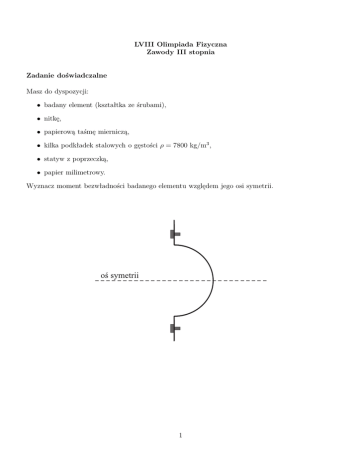 LVIII Olimpiada Fizyczna Zawody III stopnia Zadanie doświadczalne Masz do dyspozycji: • badany element (kształtka ze śrubami), • nitkę, • papierową taśmę mierniczą, • kilka podkładek stalowych o gęstości ρ = 7800 kg/m3 , • statyw z poprzeczką, • papier milimetrowy. Wyznacz moment bezwładności badanego elementu względem jego osi symetrii. 1 Rozwiązanie Pomysł rozwiązania opiera się na zbudowaniu wahadła torsyjnego z badanego elementu. Wykorzystując obecność śrub, można przyczepić do niego dwa kawałki nitki tak, aby przewleczone one zostały w dwóch punktach symetrycznie położonych względem osi pokazanej na rysunku w treści zadania. Taki sposób zamocowania nitki pozwala uzyskać drgania torsyjne kształtki względem jej osi symetrii w układzie z rysunku 1. Nitki przymocowujemy do poziomego pręta umieszczonego na statywie w rysunek 1 takiej samej odległości, jaka dzieli punkty, w których przyczpione są one do kształtki (odległość tą oznaczamy przez 2l i mierzymy taśmą mierniczą lub papierem milimetrowym). Oczywiście dbamy o to, aby nitki miały tą samą długość oznaczoną przez l1 . Wówczas w stanie równowagi napięcie każdej z nich wynosi N = mg/2, gdzie m to masa badanego elementu. Przypuśćmy, że wychyliliśmy badany element z położenia równowagi obracając go wokół osi symetrii o niewielki kąt. Wówczas rozpocznie on drgania torsyjne. Obliczmy ich okres. Jeżeli kształtka obróciła się o kąt α względem osi symetrii, to nitki tworzą teraz z pionem kąt φ równy: φ=α l l1 (1) Ale moment sił jaki działa na kształtkę to −2Nφl, który jest z drugiej strony równy Iǫ, gdzie I to szukany moment bezwładności kształtki, a ǫ to jej przyśpieszenie kątowe. Stąd: l2 −mgφl = −mg α = Iǫ l1 (2) co jest równanie drgań harmonicznych o okresie: T = 2π s 2 Il1 mgl2 (3) Zauważmy, że w zestawie nie ma stopera, którego można by użyć do pomiaru okresu T . Należy więc zbudować wahadło matematyczne za pomocą nitki i jednej z podkładek oraz tak dobrać jego długość, aby czas jego okresu drgań był równy czasowi T . W praktyce długość wahadła daje się wyznaczyć z dokładnością do ok. 0,5 cm (obserwuje się, czy po kilku drganiach wahadło matematyczne wyprzedza torsyjne albo odwrotnie). Po uzyskaniu synchronizacji drgań obu wahadeł mierzymy długość wahadła matematycznego lx . Mamy teraz: s lx T = 2π (4) g Stąd łączac równości (3) z (4) dostajemy: I = ml2 lx l1 (5) Nie znamy masy płytki m. Możemy jednak skorzystać z addytywności masy. Jeżeli do badanego elementu dołożymy podkładkę stalową o masie mp to drgania będą miały inną częstość (mierzoną jako inna długość wahadła matematycznego). Aby uniknąć wpływu momentu bezwładności podkładki na badane drgania, kolejne podkładki podwieszamy pod badanym elementem na pojedynczej nitce. Podczas pomiaru kontrolujemy, czy rzeczywiście podkładki nie zaczynają drgań skrętnych. Po dołożeniu n jednakowych podkładek mamy zależność: I = (m + nmp )l2 lx (n) l1 (6) gdzie lx (n) to mierzona długość wahadła matematycznego w takiej sytuacji. Przekształcając tą równość dostajemy: " # l2 lx (n) 2 lx (n) (7) = ml I − nmp l1 l1 Uzyskaliśmy zatem postać: (8) I + A(n) = ml2 B(n) gdzie: A(n) = −nmp l2 lx (n) l1 B(n) = lx (n) l1 (9) Wykonując wykres zależności A(n) od B(n) dla róznej liczby podkładek n powinniśmy otrzymać prostą, której punkt przecięcia z osią pionową będzie odpowiadał szukanemu momentowi bezwładności I. Wielkość mp wyznaczamy na podstawie wymiarów podkładki. Średnice mierzymy bezpośrednio kładąc podkładkę na papierze milimetrowym. Jej grubość wyznaczamy mierząc grubość stosu złożonego z kilku (np. dziesięciu) podkładek. Podkładki wykorzystane przez recenzenta miały postać płaskich pierścieni o grubości gp = (2, 6 ± 0, 1) mm i średnicach dw = (15, 5 ± 0, 5) mm oraz dz = (27, 5 ± 0, 5) mm. Po przeliczeniu daje to π mp = ρ (d2z − d2w ) · gp = (8, 2 ± 0, 6) g 4 (10) Wykonano pomiary dla długości l1 = (99 ± 1) cm oraz l = (4, 2 ± 0, 05) cm. Po sporządzeniu wykresu zależnośći A(n) od B(n) dostajemy dobrą zgodność danych z przewidywaniami teoretycznymi (rysunek 2). 3 400 Punkty pomiarowe Prosta dopasowania 200 0 A [g*cm^2] -200 -400 -600 -800 -1000 -1200 -1400 0.6 0.65 0.7 0.75 0.8 0.85 0.9 0.95 1 1.05 B rysunek 2 Wyznaczając punkt przecięcia prostje z osią pinową dostajemy moment bezwładności I = (3400 ± 300) g · cm2 . Jego niepewność szacujemy biorąc proste o skrajnych nachyleniach. Główny wpływ na ostateczny błąd ma niedokładność pomiaru masy podkładki. Bardzo istotne jest również starrane wykonanie eksperymentu (zadbanie o równą długość nici, na któych zamocowany jest badany element). Propozycja punktacji: Część teoretyczna • Pomysł na doświadczenie – Wahadło torsyjne: 2 punkty – Dokładanie podkładek: 2 punkty – Wahadło matematyczne: 1 punkt • Wyprowadzenie wzorów na: – Częstość wahadła torsyjnego: 3 punkty – Porównanie z wahadłem matematycznym: 1 punkt – Uwzględnienie mas podkładek: 1 punkt Część doświadczalna • Zmontowanie odpowiedniego układu: 1 punkt 4