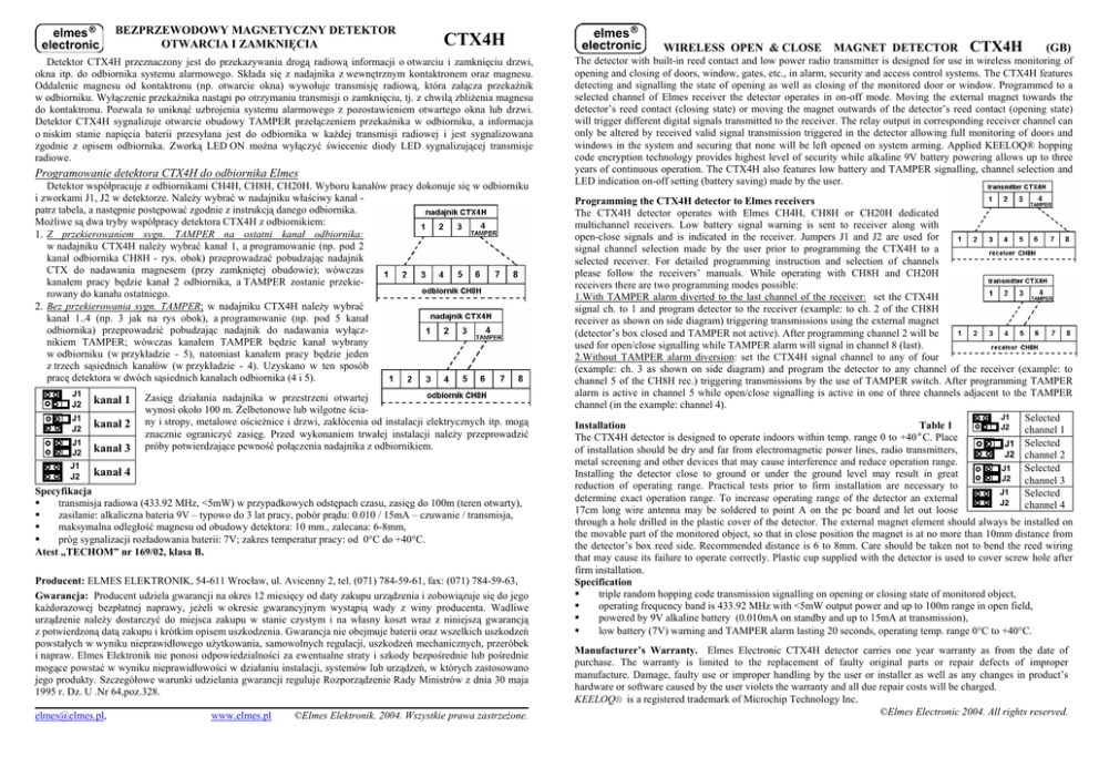 BEZPRZEWODOWY MAGNETYCZNY DETEKTOR OTWARCIA I ZAMKNIĘCIA CTX4H Detektor CTX4H przeznaczony jest do przekazywania drogą radiową informacji o otwarciu i zamknięciu drzwi, okna itp. do odbiornika systemu alarmowego. Składa się z nadajnika z wewnętrznym kontaktronem oraz magnesu. Oddalenie magnesu od kontaktronu (np. otwarcie okna) wywołuje transmisję radiową, która załącza przekaźnik w odbiorniku. Wyłączenie przekaźnika nastąpi po otrzymaniu transmisji o zamknięciu, tj. z chwilą zbliżenia magnesu do kontaktronu. Pozwala to uniknąć uzbrojenia systemu alarmowego z pozostawieniem otwartego okna lub drzwi. Detektor CTX4H sygnalizuje otwarcie obudowy TAMPER przełączeniem przekaźnika w odbiorniku, a informacja o niskim stanie napięcia baterii przesyłana jest do odbiornika w każdej transmisji radiowej i jest sygnalizowana zgodnie z opisem odbiornika. Zworką LED ON można wyłączyć świecenie diody LED sygnalizującej transmisje radiowe. Programowanie detektora CTX4H do odbiornika Elmes Detektor współpracuje z odbiornikami CH4H, CH8H, CH20H. Wyboru kanałów pracy dokonuje się w odbiorniku i zworkami J1, J2 w detektorze. Należy wybrać w nadajniku właściwy kanał patrz tabela, a następnie postępować zgodnie z instrukcją danego odbiornika. Możliwe są dwa tryby współpracy detektora CTX4H z odbiornikiem: 1. Z przekierowaniem sygn. TAMPER na ostatni kanał odbiornika: w nadajniku CTX4H należy wybrać kanał 1, a programowanie (np. pod 2 kanał odbiornika CH8H - rys. obok) przeprowadzać pobudzając nadajnik CTX do nadawania magnesem (przy zamkniętej obudowie); wówczas kanałem pracy będzie kanał 2 odbiornika, a TAMPER zostanie przekierowany do kanału ostatniego. 2. Bez przekierowania sygn. TAMPER; w nadajniku CTX4H należy wybrać kanał 1..4 (np. 3 jak na rys obok), a programowanie (np. pod 5 kanał odbiornika) przeprowadzić pobudzając nadajnik do nadawania wyłącznikiem TAMPER; wówczas kanałem TAMPER będzie kanał wybrany w odbiorniku (w przykładzie - 5), natomiast kanałem pracy będzie jeden z trzech sąsiednich kanałów (w przykładzie - 4). Uzyskano w ten sposób pracę detektora w dwóch sąsiednich kanałach odbiornika (4 i 5). J1 J2 kanał 1 J1 J2 kanał 2 J1 J2 kanał 3 J1 J2 kanał 4 Zasięg działania nadajnika w przestrzeni otwartej wynosi około 100 m. Żelbetonowe lub wilgotne ściany i stropy, metalowe ościeżnice i drzwi, zakłócenia od instalacji elektrycznych itp. mogą znacznie ograniczyć zasięg. Przed wykonaniem trwałej instalacji należy przeprowadzić próby potwierdzające pewność połączenia nadajnika z odbiornikiem. Specyfikacja transmisja radiowa (433.92 MHz, <5mW) w przypadkowych odstępach czasu, zasięg do 100m (teren otwarty), zasilanie: alkaliczna bateria 9V – typowo do 3 lat pracy, pobór prądu: 0.010 / 15mA – czuwanie / transmisja, maksymalna odległość magnesu od obudowy detektora: 10 mm., zalecana: 6-8mm, próg sygnalizacji rozładowania baterii: 7V; zakres temperatur pracy: od 0°C do +40°C. Atest „TECHOM” nr 169/02, klasa B. Producent: ELMES ELEKTRONIK, 54-611 Wrocław, ul. Avicenny 2, tel. (071) 784-59-61, fax: (071) 784-59-63, Gwarancja: Producent udziela gwarancji na okres 12 miesięcy od daty zakupu urządzenia i zobowiązuje się do jego każdorazowej bezpłatnej naprawy, jeżeli w okresie gwarancyjnym wystąpią wady z winy producenta. Wadliwe urządzenie należy dostarczyć do miejsca zakupu w stanie czystym i na własny koszt wraz z niniejszą gwarancją z potwierdzoną datą zakupu i krótkim opisem uszkodzenia. Gwarancja nie obejmuje baterii oraz wszelkich uszkodzeń powstałych w wyniku nieprawidłowego użytkowania, samowolnych regulacji, uszkodzeń mechanicznych, przeróbek i napraw. Elmes Elektronik nie ponosi odpowiedzialności za ewentualne straty i szkody bezpośrednie lub pośrednie mogące powstać w wyniku nieprawidłowości w działaniu instalacji, systemów lub urządzeń, w których zastosowano jego produkty. Szczegółowe warunki udzielania gwarancji reguluje Rozporządzenie Rady Ministrów z dnia 30 maja 1995 r. Dz. U .Nr 64,poz.328. [email protected], www.elmes.pl ©Elmes Elektronik. 2004. Wszystkie prawa zastrzeżone. WIRELESS OPEN & CLOSE MAGNET DETECTOR CTX4H (GB) The detector with built-in reed contact and low power radio transmitter is designed for use in wireless monitoring of opening and closing of doors, window, gates, etc., in alarm, security and access control systems. The CTX4H features detecting and signalling the state of opening as well as closing of the monitored door or window. Programmed to a selected channel of Elmes receiver the detector operates in on-off mode. Moving the external magnet towards the detector’s reed contact (closing state) or moving the magnet outwards of the detector’s reed contact (opening state) will trigger different digital signals transmitted to the receiver. The relay output in corresponding receiver channel can only be altered by received valid signal transmission triggered in the detector allowing full monitoring of doors and windows in the system and securing that none will be left opened on system arming. Applied KEELOQ® hopping code encryption technology provides highest level of security while alkaline 9V battery powering allows up to three years of continuous operation. The CTX4H also features low battery and TAMPER signalling, channel selection and LED indication on-off setting (battery saving) made by the user. Programming the CTX4H detector to Elmes receivers The CTX4H detector operates with Elmes CH4H, CH8H or CH20H dedicated multichannel receivers. Low battery signal warning is sent to receiver along with open-close signals and is indicated in the receiver. Jumpers J1 and J2 are used for signal channel selection made by the user prior to programming the CTX4H to a selected receiver. For detailed programming instruction and selection of channels please follow the receivers’ manuals. While operating wi