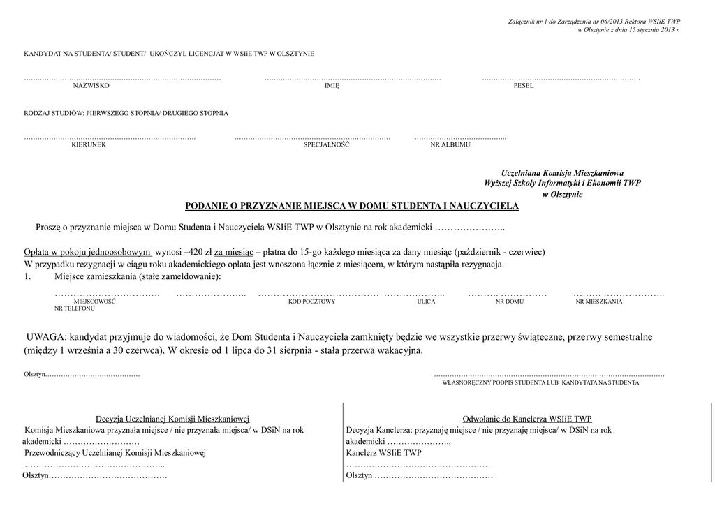 Załącznik nr 1 do Zarządzenia nr 06/2013 Rektora WSIiE TWP w Olsztynie z dnia 15 stycznia 2013 r. KANDYDAT NA STUDENTA/ STUDENT/ UKOŃCZYŁ LICENCJAT W WSIiE TWP W OLSZTYNIE …………………………………………………………………………… NAZWISKO …………………………………………………………………… IMIĘ ……………………………………………………………. PESEL RODZAJ STUDIÓW: PIERWSZEGO STOPNIA/ DRUGIEGO STOPNIA …………………………………………………………………. KIERUNEK …………………………………………………………… SPECJALNOŚĆ ………………………………….. NR ALBUMU Uczelniana Komisja Mieszkaniowa Wyższej Szkoły Informatyki i Ekonomii TWP w Olsztynie PODANIE O PRZYZNANIE MIEJSCA W DOMU STUDENTA I NAUCZYCIELA Proszę o przyznanie miejsca w Domu Studenta i Nauczyciela WSIiE TWP w Olsztynie na rok akademicki ………………….. Opłata w pokoju jednoosobowym wynosi –420 zł za miesiąc – płatna do 15-go każdego miesiąca za dany miesiąc (październik - czerwiec) W przypadku rezygnacji w ciągu roku akademickiego opłata jest wnoszona łącznie z miesiącem, w którym nastąpiła rezygnacja. 1. Miejsce zamieszkania (stałe zameldowanie): ……………………………. MIEJSCOWOŚĆ NR TELEFONU ………………….. ………………………………… ……………….. KOD POCZTOWY ULICA ………. …………… NR DOMU ……… ……………….. NR MIESZKANIA UWAGA: kandydat przyjmuje do wiadomości, że Dom Studenta i Nauczyciela zamknięty będzie we wszystkie przerwy świąteczne, przerwy semestralne (między 1 września a 30 czerwca). W okresie od 1 lipca do 31 sierpnia - stała przerwa wakacyjna. Olsztyn…………………………………… ………………………………………………………………………………………… WŁASNORĘCZNY PODPIS STUDENTA LUB KANDYTATA NA STUDENTA Decyzja Uczelnianej Komisji Mieszkaniowej Komisja Mieszkaniowa przyznała miejsce / nie przyznała miejsca/ w DSiN na rok akademicki ……………………… Przewodniczący Uczelnianej Komisji Mieszkaniowej ………………………………………….. Olsztyn…………………………………… Odwołanie do Kanclerza WSIiE TWP Decyzja Kanclerza: przyznaję miejsce / nie przyznaję miejsca/ w DSiN na rok akademicki ………………….. Kanclerz WSIiE TWP …………………………………………… Olsztyn ……………………………………