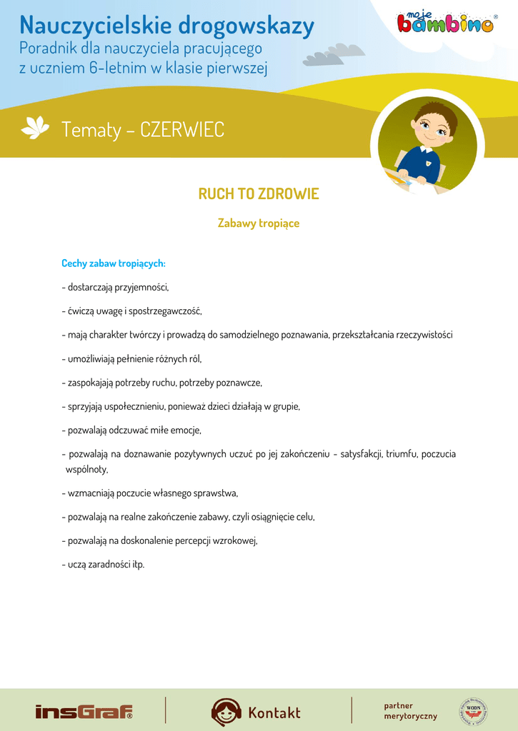 Tematy – CZERWIEC RUCH TO ZDROWIE Zabawy tropiące Cechy zabaw tropiących: - dostarczają przyjemności, - ćwiczą uwagę i spostrzegawczość, - mają charakter twórczy i prowadzą do samodzielnego poznawania, przekształcania rzeczywistości - umożliwiają pełnienie różnych ról, - zaspokajają potrzeby ruchu, potrzeby poznawcze, - sprzyjają uspołecznieniu, ponieważ dzieci działają w grupie, - pozwalają odczuwać miłe emocje, - pozwalają na doznawanie pozytywnych uczuć po jej zakończeniu - satysfakcji, triumfu, poczucia wspólnoty, - wzmacniają poczucie własnego sprawstwa, - pozwalają na realne zakończenie zabawy, czyli osiągnięcie celu, - pozwalają na doskonalenie percepcji wzrokowej, - uczą zaradności itp. Tematy – CZERWIEC Funkcje zabaw tropiących: - stymulująca, pobudzająca, - diagnostyczna - poznawanie dziecka, - terapeutyczna - przyczyny zachowania dziecka, - poznawcza - nowe wiadomości, sytuacje, przeżycia, - wychowawcza - integracja zespołu, wiara we własne możliwości, - kształcąca - operacje umysłowe, rozumienie pisma. Zabawy tropiące można łączyć z zabawami ruchowymi, muzycznymi, plastycznymi, słuchowymi, matematycznymi, ćwiczeniami przygotowującymi lub doskonalącymi umiejętność czytania i pisania. Ważne jest, aby dzieci doznawały uczucia radości z powodu pokonanych przeszkód, trudności, by wykazały się wiedzą, sprawnością. Schemat zabawy tropiącej: Temat Opis warunków prowadzenia zabawy Rodzaj tropu Wprowadzenie do zabawy – przedstawienie przewodnika Rozpisanie zadań na poszczególne etapy, ułożenie treści listów, instrukcji, itp. Cel – skarb (miła dla dzieci niespodzianka, związana w miarę możliwości z głównym tematem zabawy lub okresem, w jakim się ją przeprowadza) Tematy – CZERWIEC Wyróżnić można trzy podstawowe elementy nieodzowne w każdej zabawie tropiącej: Znaki Zadania Skarb Znaki – mogą to być strzałki, które pokazują drogę do skarbu, ale tak zmyślnie rozmieszczone, że nie od razu dzieci je zauważą. Znakami mogą być też rysunki, które mówią dzieciom o tym, jak mają się poruszać po terenie, jaki kierunek wybrać, aby dojść do celu. Zadania – aby wydłużyć drogę do skarbu, dzielimy ją na kilka etapów i w każdym z nich przewidujemy inne zadania, odpowiednio trudne, zróżnicowane i atrakcyjne. Skarb – cel tropienia. Stwarza silną motywację do udziału w zabawie i wykonywania zadań. Skarb jest zagadką, niewiadomą, działa na wyobraźnię, wywołuje stan radosnego oczekiwania. Skarb może być materialny lub niematerialny, ale zawsze w jakiś sposób ważny dla dzieci. Propozycje zabaw tropiących Pantofelek Kopciuszka Wcześniej należy zapoznać dzieci z bajką o Kopciuszku. Pomoce: kartoniki z narysowanymi pojedynczymi pantofelkami o różnym kształcie, kolorze i ozdobach, kartonik z pantofelkiem Kopciuszka (najpiękniej zdobiony), postać królewicza, garść konfetti. Tematy – CZERWIEC Przebieg: Nauczycielka czyta dzieciom list od królewicza z informacją o zaginięciu pantofelka Kopciuszka, co uniemożliwia odnalezienie dziewczyny. Królewicz prosi o pomoc prezentując portret pantofelka namalowany przez nadwornego malarza. Po dokładnym obejrzeniu pantofelka dzieci ruszają śladami damskich bucików odnajdując po drodze pojedyncze kartoniki. Wracają z nimi do miejsca gdzie siedzi królewicz i porównują je z trzymanym przez niego wzorem. Po odnalezieniu wszystkich kartonów i stwierdzeniu, że żaden z nich nie jest tym poszukiwanym, postanawiają szukać dalej. Wreszcie któreś z nich trafia na kolorowe konfetti (skojarzenie z balem). Przeszukując dokładnie to miejsce odnajdują pantofelek Kopciuszka, który oddają królewiczowi. W nagrodę otrzymują zaproszenie na bal. Szukanie Królewny W ogrodzie przedszkolnym wytyczamy trasę tropienia umieszczając w różnych miejscach kawałeczki wełny. Lalkę przebrana za królewnę (w postrzępionym szalu) umieszczamy na końcu ogrodu na huśtawce z deseczki tak umocowanej, aby za pociągnięciem sznurka obniżyła się do poziomu dzieci. Przebieg: Nauczycielka opowiada bajkę o królewnie, którą porwała zła wróżka i ukryła w trudno dostępnym miejscu. Królewna rzucała za siebie strzępki szala, aby ułatwić jej odnalezienie. Nitki zaczepione o urządzenia ogrodowe sugerują wykonanie kilku zadań ruchowych. Po pokonaniu przeszkód dzieci odnajdują list, w którym podane jest zaklęcie pomocne w wyzwoleniu królewny z niewoli. Kiedy dzieci nauczą się prawidłowo wymawiać zaklęcie, ruszają dalej za śladem. Ślad urywa się pod drzewem, gdzie królewna siedzi na dość wysoko umieszczonej huśtawce. Po trzykrotnym wypowiedzeniu zaklęcia nauczycielka zwalnia sznurek i opuszcza huśtawkę z królewna. Tematy – CZERWIEC Jaś szuka Małgosi Trasę tropienia wysypujemy (nie za gęsto) pojedynczymi ziarenkami grochu. Przygotowujemy tor przeszkód. Na końcu trasy umieszczamy „złote serduszko”, sporo drobno pociętych kawałków błyszczącej folii oraz pudełko z piernikami. Przygotowujemy sylwetki Jasia i Małgosi. Przebieg: Nauczycielka opowiada, że Małgosia poszła na spacer do lasu i nie wraca. Jaś udaje się na poszukiwanie siostry, co kilka kroków wypuszczając z ręki ziarenko grochu, aby ułatwić sobie powrót do domu. Nauczycielka proponuje dzieciom, aby udały się za Jasiem. Wchodząc do ogrodu dzieci wypatrują ziaren grochu, a odnalazłszy trop, posuwają się za nim do pierwszego znaku, którym jest list informujący o konieczności pokonania toru przeszkód. Po sforsowaniu ostatniej przeszkody dzieci odnajdują Jasia i Małgosię oraz list informujący, ze w czasie spaceru Małgosia zgubiła złote serduszko z piernika, które bardzo chce odnaleźć i prosi dzieci o pomoc. Dzieci rozbiegają się, aby wśród drobno pociętej błyszczącej folii rozrzuconej na dość dużej przestrzeni wypatrzyć złote serduszko. Wraz z serduszkiem dzieci odna