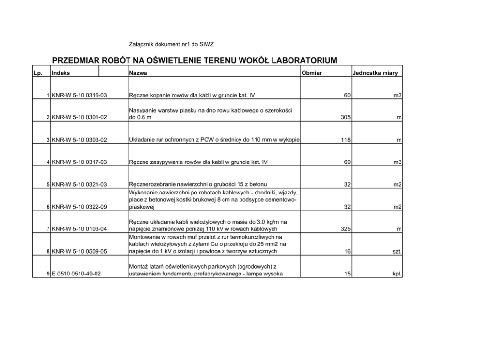 Załącznik dokument nr1 do SIWZ PRZEDMIAR ROBÓT NA OŚWIETLENIE TERENU WOKÓŁ LABORATORIUM Lp. Indeks Nazwa 1 KNR-W 5-10 0316-03 Ręczne kopanie rowów dla kabli w gruncie kat. IV 2 KNR-W 5-10 0301-02 Obmiar Jednostka miary 60 m3 Nasypanie warstwy piasku na dno rowu kablowego o szerokości do 0.6 m 305 m 3 KNR-W 5-10 0303-02 Układanie rur ochronnych z PCW o średnicy do 110 mm w wykopie 118 m 4 KNR-W 5-10 0317-03 Ręczne zasypywanie rowów dla kabli w gruncie kat. IV 60 m3 5 KNR-W 5-10 0321-03 Ręcznerozebranie nawierzchni o grubości 15 z betonu Wykonanie nawierzchni po robotach kablowych - chodniki, wjazdy, place z betonowej kostki brukowej 8 cm na podsypce cementowopiaskowej 32 m2 32 m2 325 m 16 szt. 15 kpl. 6 KNR-W 5-10 0322-09 8 KNR-W 5-10 0509-05 Ręczne układanie kabli wielożyłowych o masie do 3.0 kg/m na napięcie znamionowe poniżej 110 kV w rowach kablowych Montowanie w rowach muf przelot z rur termokurczliwych na kablach wielożyłowych z żyłami Cu o przekroju do 25 mm2 na napięcie do 1 kV o izolacji i powłoce z tworzyw sztucznych 9 E 0510 0510-49-02 Montaż latarń oświetleniowych parkowych (ogrodowych) z ustawieniem fundamentu prefabrykowanego - lampa wysoka 7 KNR-W 5-10 0103-04 10 KNR-W 5-10 1002-01 Montaż wysięgników rurowych o ciężarze do 15 kg na słupie 15 szt. 11 KNR-W 5-10 1005-06 Montaż na zamontowanym wysięgniku opraw świetlówkowych 16 szt. 12 KNR-W 5-10 1004-03 Wciąganie przewodów w wysięgnik na ziemi 248 m-1 przew 13 KNR-W 5-10 1001-04 Montaż tabliczek bezpiecznikowych na konstrukcji 15 szt. 14 E 0510 0510-49-02 Montaż latarń oświetleniowych parkowych (ogrodowych) z ustawieniem fundamentu prefabrykowanego - słupek niski 1 kpl. 15 KNR-W 5-08 0901-03 Pomiar rezystancji izolacji instalacji elektrycznych - obwód 3fazowy, pierwszy pomiar 18 pomiar 16 KNR-W 5-08 0902-01 Sprawdzenie samoczynnego wyłączenia zasilania - pomiar impedancji pętli zwarciowej - pierwszy 16 pomiar 43 kpl. 43 kpl. 17 Kalk. indywid. 18 Kalk. indywid. Renowacja istniejących słupów opraw parkowych - malowanie farbą antykorozyjną i kolor, remont tabliczek bezpiecznikowych, wymiana źródeł światła - Lampa wysoka Renowacja istniejących słupów opraw parkowych - malowanie farbą antykorozyjną i kolor, remont tabliczek bezpiecznikowych, wymiana źródeł światła - Słupek oświetleniowy niski