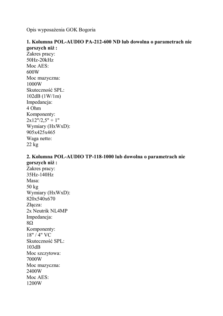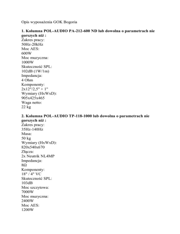 Opis wyposażenia GOK Bogoria 1. Kolumna POL-AUDIO PA-212-600 ND lub dowolna o parametrach nie gorszych niż : Zakres pracy: 50Hz-20kHz Moc AES: 600W Moc muzyczna: 1000W Skuteczność SPL: 102dB (1W/1m) Impedancja: 4 Ohm Komponenty: 2x12"/2,5" + 1" Wymiary (HxWxD): 905x425x465 Waga netto: 22 kg 2. Kolumna POL-AUDIO TP-118-1000 lub dowolna o parametrach nie gorszych niż : Zakres pracy: 35Hz-140Hz Masa: 50 kg Wymiary (HxWxD): 820x540x670 Złącza: 2x Neutrik NL4MP Impedancja: 8Ω Komponenty: 18" / 4" VC Skuteczność SPL: 103dB Moc szczytowa: 7000W Moc muzyczna: 2400W Moc AES: 1200W 3. Wzmacniacz ADS PLX 2400 lub dowolny o parametrach nie gorszych niż: Pasmo przenoszenia 10dB poniżej mocy znamionowej, -3dB spadek 20Hz (2,5dB) - 20kHz(-1dB) 13Hz - 50kHz Moc wyjściowa RMS 1kHz @ 1%THD wysterowany jeden kanał 1x 4 ohm 900W 1x 2 ohm 1500W 1kHz @ 1%THD wysterowane dwa kanały: 2x 8 ohm 430W 2x 4 ohm 800W 2x 2 ohm 1200W 20Hz - 20kHz @ 1%THD wysterowane dwa kanały 2x 4 ohm 760W 2x 2 ohm 1100W 1kHz @ 1%THD mostek 1x 8 ohm 1600W 1x 4 ohm 2400W Moc muzyczna, 5ms 2x 4 ohm 1000W 2x 2 ohm 1900W Zniekształcenia (THD) 1kHz, 2 ohm 80% mocy znamionowej < 0,02% Zniekształcenia 20Hz - 20kHz 2 ohm 80% mocy znamionowej < 0,05% Współczynnik tłumienia 10 - 400Hz Damping factor 8 ohm > 400 Dynamika (S/N) szum A - ważony > 100dB Wzmocnienie napięciowe 63 (36dB) Stopień wyjściowy Klasa H Czułość wejściowa (V RMS) przy mocy znamionowej: 4ohm 0,87V (+1dB) 2ohm 0,775V (0dB) Impedancja wejściowa: symetryczne 10kohm niesymetryczne 20kohm Filtr poddźwiękowy 25Hz, 50Hz (Subsonic filter) 24dB / oktawę Aktywna dwudrożna zwrotnica stromość 12dB/okt częstotliwość graniczna (-2dB) 75Hz - 1200Hz Wskaźniki [LED]: Ready, Protect, Signal, Clip Chłodzenie: Wentylator z ciągła zmianą prędkości, wlot powietrza od przodu Zabezpieczenia: Automatyka cichego załączania i odłączania obciążenia, DC na wyjściu, zwarciowe, termiczne, ultrasonic, subsonic, limiter, softstart Zasilanie: 230V AC, 50 Hz +10/-15% Moc tranzystorów końcowych: 5000W Gniazda wejściowe: XLR & Jack Ganizda wyjściowe: Neutrik speakon Szybkość narastania (Slew rate) (z filtrem wejściowym i obwodem zabezpieczenia): 40 V/us Wymiary (WxHxD): 483 x 132 x 420 mm Waga: 25kg 4. Wzmacniacz ADS PLX 4000 lub dowolny o parametrach nie gorszych niż: Pasmo przenoszenia: 20Hz (-2,5dB) - 20kHz(-1dB) Moc wyjściowa RMS: - 1kHz @ 1%THD wysterowany jeden kanał: * 1x 4 ohm: 1350W * 1x 2 ohm: 2300W - 1kHz @ 1%THD wysterowane dwa kanały: * 2x 8 ohm: 680W * 2x 4 ohm: 1250W * 2x 2 ohm: 2000W - 20Hz - 20kHz @ 1%THD wysterowane dwa kanały * 2x 4 ohm: 1150W * 2x 2 ohm: 1850W - 1kHz @ 1%THD mostek * 1x 8 ohm: 2500W * 1x 4 ohm: 4000W Moc muzyczna, 5ms: - 2x 4 ohm: 1000W - 2x 2 ohm: 1900W Zniekształcenia (THD) 1kHz, 2 ohm, 80% mocy znamionowej: < 0,02% Zniekształcenia 20Hz - 20kHz, 2 ohm, 80% mocy znamionowej: < 0,05% Współczynnik tłumienia 10 - 400Hz, (Damping factor) 8 ohm: > 600 Dynamika (S/N) szum A - ważony: > 100dB Wzmocnienie napięciowe: 80,8 (38dB) Stopień wyjściowy: Klasa H Czułość wejściowa (V RMS)przy mocy znamionowej: - 4ohm: 0,87V (+1dB) - 2ohm: 0,775V (0dB) Impedancja wejściowa: - symetryczne: 10kohm - niesymetryczne: 20kohm Filtr poddźwiękowy 25Hz, 50Hz (Subsonic filter): 24dB / oktawę Aktywna dwudrożna zwrotnica (Active Crossover): - stromość: 12dB/okt - częstotliwość graniczna (-2dB): 75Hz - 1200Hz Wskaźniki [LED]: Ready, Protect, Signal, Clip Regulacja, przełączniki: - przód: Ch A & Ch B volume - tył:Subsonic filter, Mode switch, Crossover switch, Crossover Ch A & Ch B regulacja częstotliwości granicznej Chłodzenie: Wentylator z ciągła zmianą prędkości, wlot powietrza od przodu Zabezpieczenia: Automatyka cichego załączania i odłączania obciążenia, DC na wyjściu, zwarciowe, termiczne, ultrasonic, subsonic, limiter, softstart Zasilanie: 230V AC, 50 Hz +10/-15% Prąd zasilania: - stan jałowy: 0,3 A - 1/8 mocy wyjściowej, szum różowy, 2x2ohm, (normalna muzyka): 7,5 A - 1/3 mocy wyjściowej, szum różowy, 2x2ohm, (mocna muzyka): 15 A Pojemność filtra: 120000uF Maksymalna amplituda napięcia wyjściowego: 120V Moc tranzystorów końcowych: 9680W Gniazda: - wejściowe: XLR & Jack - wyjściowe: Neutrik speakon Szybkość narastania (Slew rate) (z filtrem wejściowym i obwodem zabezpieczenia): 40 V/us Wymiary (WxHxD): 483 x 132 x 420 mm Waga netto: 31kg Waga brutto: 32k 5. Procesor XILICA XA-2040 lub dowolny o parametrach nie gorszych niż : 96kHz, 8 PEQs, 31Bd GEQ, Delays, Mixer, Input-Compressor, In-OutputCrossover, RMS-Limiter, USB/RS232/Ethernet, thomann 19" 1U 6. Przewód 2x2,5mm 2xNL2FC długość 15m 7. Przewód sygnałowy NC3MX-NC3FX długość 1m 8. Przewód sygnałowy NC3MX-NC3FX długość 5m 9. Kabel wieloparowy K 32 C 30 D lub dowolny o parametrach nie gorszych niż : kabel wieloparowy multicore na bębnie, 24 wejścia, 8 powrotów, bęben z kółkami 30 mb 10. Rozdzielnia zasilania SB1050 lub dowolna o parametrach nie gorszych niż : EUROLITE SB-1050 CEE PANEL ROZDZIELCZY w sytemie Rack 19" 3x 32 Ampery. Kontrolki obecności faz. Panel przedni: Wtyk 32A CEE , gniazdo 32A CEE , Bezpieczniki automatyczne 16 A - 3 szt. 11.Allen & Heath GL2400-24 - mikser estradowy lub dowolny o parametrach nie gorszych niż : Kanały mikrofonowo-liniowe 22 Kanały stereo 2 Wyjścia direct out Na każdym kanale mikrofonowo-liniowym Gniazda insertowe Na każdym kanale + inserty LR na sumie wyjść+ inserty grup Wysyłka AUX 6 AUX pracujące w przełączanych trybach przed tłumikiem lub po tłumiku Grupy 4 z wyjściami XLR Matryca 4x7 Filtr dolnozaporowy 100Hz, nachylenie: 12dB/oktawę Korekcja barwy 4-stopniowa korekcja barwy z 2 korektorami parametrycznymi na częstotliwościach: 60Hz, 12kHz, a także 2 przestrajane środkowe częstotliwość w zakresie od 35Hz do 1 kH i od 500Hz do 15kHz. Podbicie lub obcięcie wybranej częstotliwości w zakresie +/-15dB. Włącznik korekcji barwy w każdym k