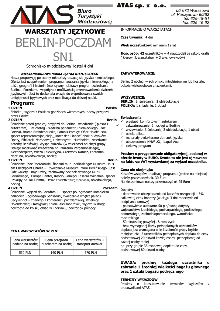 WARSZTATY JĘZYKOWE BERLIN-POCZDAM SN1 INFORMACJE O WARSZTATACH Czas trwania: 4 dni Wiek uczestników: minimum 12 lat Ilość osób: 42 uczestników + 4 nauczycieli ze szkoły gratis ( kierownik warsztatów + 3 wychowawców) Schronisko młodzieżowe/Hostel 4 dni NIESTANDARDOWA NAUKA JĘZYKA NIEMIECKIEGO Naszą propozycję polecamy młodzieży uczącej się języka niemieckiego. Oferta jest uzupełnieniem programu nauczania języka niemieckiego, a także geografii i historii. Intensywny i ciekawy program zwiedzania Berlina i Poczdamu współgra z możliwością przeprowadzenia ćwiczeń językowych. Jest to doskonała okazja do wypróbowania swoich umiejętności językowych oraz mobilizacja do dalszej nauki. Program: 1 DZIEŃ Polska Zbiórka , wyjazd z Polski w godzinach wieczornych, nocny przejazd przez Polskę 2 DZIEŃ Berlin Śniadanie przed granicą, przyjazd do Berlina: zwiedzanie ( pieszo i autokarem): Reichstag - siedziba parlamentu niemieckiego, Plac Paryski, Brama Brandenburska, Pomnik Pamięci Ofiar Holokaustu, spacer reprezentacyjną aleją „Unter den Linden” obok budynków Opery, Biblioteki Narodowej, Uniwersytetu Humboldta, zwiedzanie Katedry Berlińskiej, Wyspa Muzeów (w zależności od chęci grupy istnieje możliwość zwiedzania np. Muzeum Pergamońskiego), Alexanderplatz, Wieża Telewizyjna, Czerwony Ratusz, Fontanna Neptuna, obiadokolacja, nocleg. 3 DZIEŃ Berlin Śniadanie, Plac Poczdamski, śladami muru berlińskiego: Museum Haus am Checkpoint Charlie – zwiedzanie Muzeum Muru Berlińskiego, East Side Gallery - najdłuższy, zachowany odcinek dawnego Muru Berlińskiego, Europa Center, Kościół Pamięci Cesarza Wilhelma, spacer i zakupy na Ku-Damm, Pałac Charlottenburg z parkiem, obiadokolacja, nocleg. 4 DZIEŃ Poczdam Śniadanie, wyjazd do Poczdamu – spacer po ogrodach kompleksu pałacowo - ogrodowego Sanssouci, zwiedzanie wnętrz pałacu Cecylienhof – znanego z konferencji poczdamskiej, Dzielnicy Holenderskiej i Rosyjskiej Kolonii Aleksandrówki, wyjazd w drogę powrotną do Polski, obiad w Torzymiu, powrót ok północy CENA WARSZTATÓW W PLN: Cena warsztatów podana na osobę Cena przejazdu autokarem na osobę Cena warsztatów + transport autokar 530 PLN 140 PLN 670 PLN ZAKWATEROWANIE: Berlin: 2 noclegi w schronisku młodzieżowym lub hostelu, pokoje wieloosobowe z łazienkami. WYŻYWIENIE: BERLIN: 2 śniadania, 2 obiadokolacje POLSKA: 1 śniadanie, 1 obiad Świadczenia: przejazd komfortowym autokarem zakwaterowanie: 2 noclegi w Berlinie wyżywienie: 3 śniadania, 2 obiadokolacje, 1 obiad opieka pilota materiały dydaktyczne do nauki języka ubezpieczenia NNW ,KL, bagaż Axa ciekawy program Prosimy o przygotowanie obligatoryjnej, podanej w ofercie kwoty w EURO. Kwota ta nie jest ujmowana na fakturze VAT wystawianej za wyjazd uczestnika. Cena nie obejmuje: Kosztów wstępów i realizacji programu (płatne na miejscu) należy przeznaczyć ok. 30 Euro. Na kieszonkowe należy przeznaczyć ok 25 Euro Dopłaty: - dobrowolne ubezpieczenie od kosztów rezygnacji – 3% całkowitej ceny imprezy (w ciągu 3 dni roboczych od podpisania umowy) - podstawienie autokaru: 50 pln/osobę dotyczy województw: lubelskiego, podkarpackiego, podlaskiego, pomorskiego, zachodniopomorskiego, warmińskomazurskiego - 50 pln/osobę powyżej 18 roku życia - brak wymaganej liczby pełnopłatnych uczestników – dopłata jest wymagana o ile liczebność grupy będzie mniejsza niż 42 uczestników pełnopłatnych dopłata do ceny podstawowej 20 pln/od każdej osoby pełnopłatnej od każdej osoby mniej np. przy grupie 38 osobowej dopłata do ceny podstawowej 80 pln/od osoby UWAGA: prosimy każdego uczestnika o zabranie 1 średniej wielkości bagażu głównego oraz 1 sztuki bagażu podręcznego TERMINY WYJAZDÓW Prosimy o konsultowanie pracownikami ATAS. terminów wyjazdów z