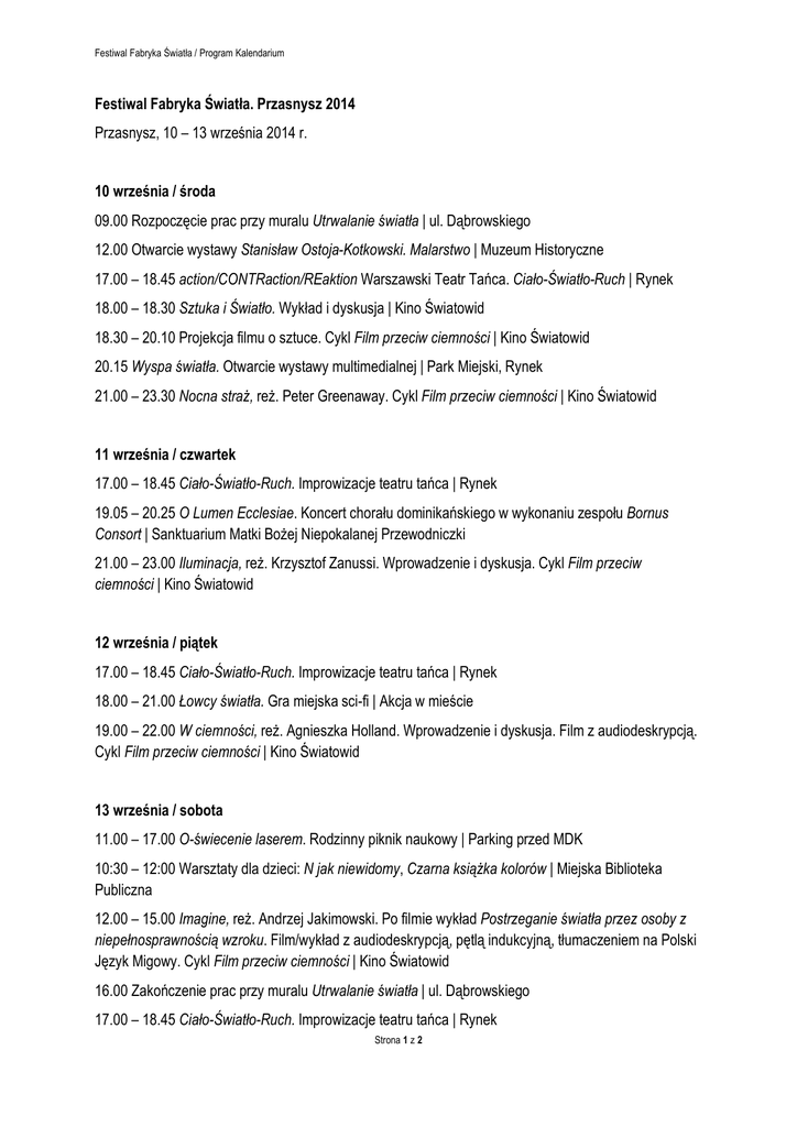 Festiwal Fabryka Światła / Program Kalendarium Festiwal Fabryka Światła. Przasnysz 2014 Przasnysz, 10 – 13 września 2014 r. 10 września / środa 09.00 Rozpoczęcie prac przy muralu Utrwalanie światła | ul. Dąbrowskiego 12.00 Otwarcie wystawy Stanisław Ostoja-Kotkowski. Malarstwo | Muzeum Historyczne 17.00 – 18.45 action/CONTRaction/REaktion Warszawski Teatr Tańca. Ciało-Światło-Ruch | Rynek 18.00 – 18.30 Sztuka i Światło. Wykład i dyskusja | Kino Światowid 18.30 – 20.10 Projekcja filmu o sztuce. Cykl Film przeciw ciemności | Kino Światowid 20.15 Wyspa światła. Otwarcie wystawy multimedialnej | Park Miejski, Rynek 21.00 – 23.30 Nocna straż, reż. Peter Greenaway. Cykl Film przeciw ciemności | Kino Światowid 11 września / czwartek 17.00 – 18.45 Ciało-Światło-Ruch. Improwizacje teatru tańca | Rynek 19.05 – 20.25 O Lumen Ecclesiae. Koncert chorału dominikańskiego w wykonaniu zespołu Bornus Consort | Sanktuarium Matki Bożej Niepokalanej Przewodniczki 21.00 – 23.00 Iluminacja, reż. Krzysztof Zanussi. Wprowadzenie i dyskusja. Cykl Film przeciw ciemności | Kino Światowid 12 września / piątek 17.00 – 18.45 Ciało-Światło-Ruch. Improwizacje teatru tańca | Rynek 18.00 – 21.00 Łowcy światła. Gra miejska sci-fi | Akcja w mieście 19.00 – 22.00 W ciemności, reż. Agnieszka Holland. Wprowadzenie i dyskusja. Film z audiodeskrypcją. Cykl Film przeciw ciemności | Kino Światowid 13 września / sobota 11.00 – 17.00 O-świecenie laserem. Rodzinny piknik naukowy | Parking przed MDK 10:30 – 12:00 Warsztaty dla dzieci: N jak niewidomy, Czarna książka kolorów | Miejska Biblioteka Publiczna 12.00 – 15.00 Imagine, reż. Andrzej Jakimowski. Po filmie wykład Postrzeganie światła przez osoby z niepełnosprawnością wzroku. Film/wykład z audiodeskrypcją, pętlą indukcyjną, tłumaczeniem na Polski Język Migowy. Cykl Film przeciw ciemności | Kino Światowid 16.00 Zakończenie prac przy muralu Utrwalanie światła | ul. Dąbrowskiego 17.00 – 18.45 Ciało-Światło-Ruch. Improwizacje teatru tańca | Rynek Strona 1 z 2 Festiwal Fabryka Światła / Program Kalendarium 19.30 – 22.00 Marek Biliński – Koncert finałowy Fabryki Światła | Plac za kościołem farnym +++++++++++++++++++++++++++++++++ Stałe wydarzenia Wyspa światła. Wystawa multimedialna | Park Miejski, Rynek Wystawa Stanisław Ostoja-Kotkowski | Muzeum Historyczne Batik. Wystawa tkaniny artystycznej w kościele klasztornym pw. św. Jakuba i Anny | Sanktuarium Matki Bożej Niepokalanej Przewodniczki Utrwalanie światła. Prace przy muralu | ul. Dąbrowskiego Światłodajnia – biuro festiwalowe | Rynek Strona 2 z 2