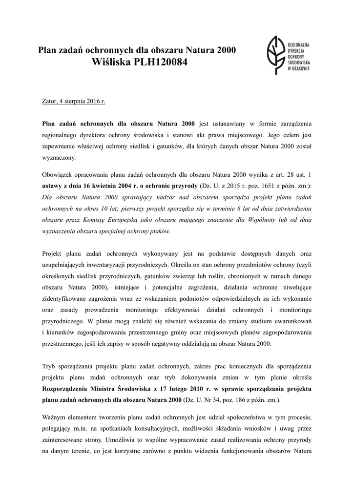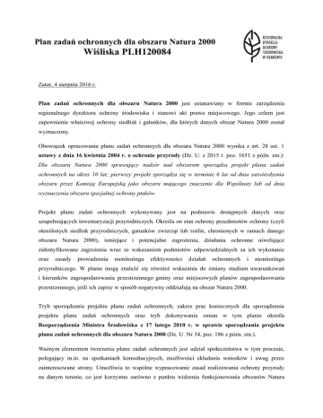 Plan zadań ochronnych dla obszaru Natura 2000 Wiśliska PLH120084 Zator, 4 sierpnia 2016 r. Plan zadań ochronnych dla obszaru Natura 2000 jest ustanawiany w formie zarządzenia regionalnego dyrektora ochrony środowiska i stanowi akt prawa miejscowego. Jego celem jest zapewnienie właściwej ochrony siedlisk i gatunków, dla których danych obszar Natura 2000 został wyznaczony. Obowiązek opracowania planu zadań ochronnych dla obszaru Natura 2000 wynika z art. 28 ust. 1 ustawy z dnia 16 kwietnia 2004 r. o ochronie przyrody (Dz. U. z 2015 r. poz. 1651 z późn. zm.): Dla obszaru Natura 2000 sprawujący nadzór nad obszarem sporządza projekt planu zadań ochronnych na okres 10 lat; pierwszy projekt sporządza się w terminie 6 lat od dnia zatwierdzenia obszaru przez Komisję Europejską jako obszaru mającego znaczenie dla Wspólnoty lub od dnia wyznaczenia obszaru specjalnej ochrony ptaków. Projekt planu zadań ochronnych wykonywany jest na podstawie dostępnych danych oraz uzupełniających inwentaryzacji przyrodniczych. Określa on stan ochrony przedmiotów ochrony (czyli określonych siedlisk przyrodniczych, gatunków zwierząt lub roślin, chronionych w ramach danego obszaru Natura 2000), istniejące i potencjalne zagrożenia, działania ochronne niwelujące zidentyfikowane zagrożenia wraz ze wskazaniem podmiotów odpowiedzialnych za ich wykonanie oraz zasady prowadzenia monitoringu efektywności działań ochronnych i monitoringu przyrodniczego. W planie mogą znaleźć się również wskazania do zmiany studium uwarunkowań i kierunków zagospodarowania przestrzennego gminy oraz miejscowych planów zagospodarowania przestrzennego, jeśli ich zapisy w sposób negatywny oddziałują na obszar Natura 2000. Tryb sporządzania projektu planu zadań ochronnych, zakres prac koniecznych dla sporządzenia projektu planu zadań ochronnych oraz tryb dokonywania zmian w tym planie określa Rozporządzenia Ministra Środowiska z 17 lutego 2010 r. w sprawie sporządzania projektu planu zadań ochronnych dla obszaru Natura 2000 (Dz. U. Nr 34, poz. 186 z późn. zm.). Ważnym elementem tworzenia planu zadań ochronnych jest udział społeczeństwa w tym procesie, polegający m.in. na spotkaniach konsultacyjnych, możliwości składania wniosków i uwag przez zainteresowane strony. Umożliwia to wspólne wypracowanie zasad realizowania ochrony przyrody na danym terenie, co jest korzystne zarówno z punktu widzenia funkcjonowania obszarów Natura 2000, jak i lokalnych społeczności. Udział społeczny będzie się odbywał poprzez: - spotkania informacyjno-konsultacyjne (planowane 3 spotkania), - możliwość składania uwag i wniosków do dokumentów w całym okresie opracowywania planu, - wyłożenie projektu zarządzenia do publicznego wglądu w trakcie 21-dniowych konsultacji społecznych, z możliwością składania uwag. Zasady i tryb udziału społeczeństwa w tworzeniu planu zadań ochronnych określa ustawa z dnia 3 października 2008 r. o udostępnianiu informacji o środowisku i jego ochronie, udziale społeczeństwa w ochronie środowiska oraz o ocenach oddziaływania na środowisko (Dz. U. z 2016 r., poz. 353 z późn. zm.). Informacje na temat tworzonego projektu planu zadań ochronnych dla obszaru Natura 2000 Wiśliska PLH120084 można uzyskać w Regionalnej Dyrekcji Ochrony Środowiska w Krakowie: - adres: Plac Na Stawach 3, 30-107 Kraków, - kontakt - sekretariat: [email protected], (12) 619 81 20, 619 81 21 - strona www: http://krakow.rdos.gov.pl/plany-zadan-ochronnych - osoba do kontaktu: Katarzyna Paciora: e-mail: [email protected], tel.: (12) 619 81 46