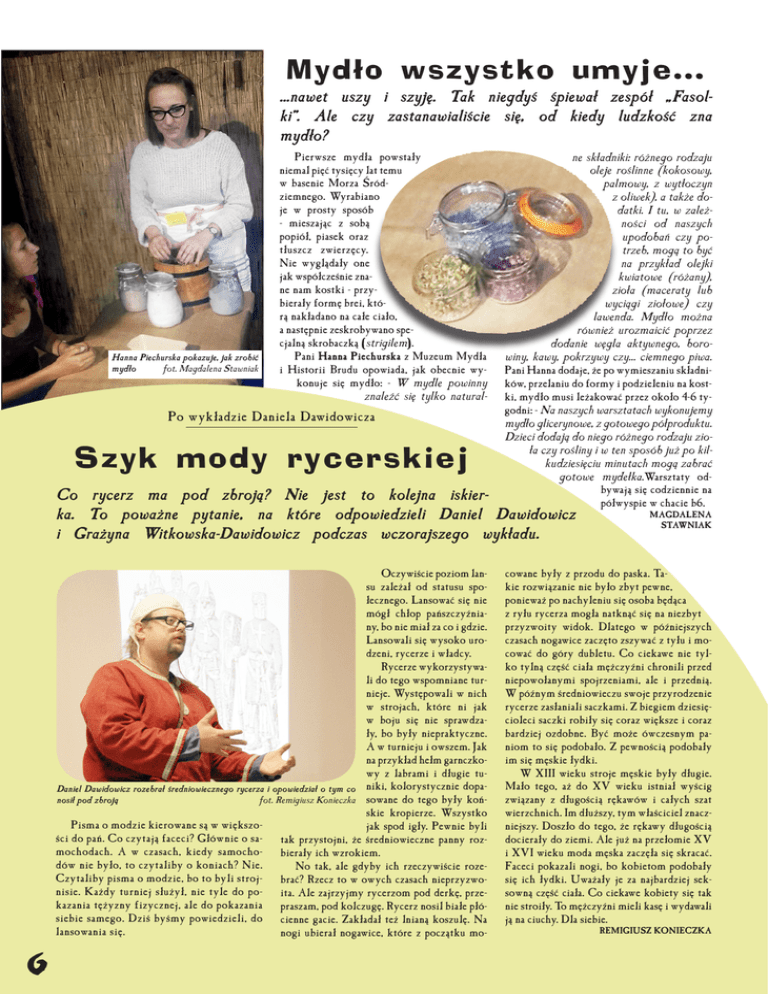 Mydło wszystko umyje... ...nawet uszy i szyję. Tak niegdyś śpiewał zespół „Fasolki”. Ale czy zastanawialiście się, od kiedy ludzkość zna mydło? Hanna Piechurska pokazuje, jak zrobić mydło fot. Magdalena Stawniak Pierwsze mydła powstały niemal pięć tysięcy lat temu w basenie Morza Śródziemnego. Wyrabiano je w prosty sposób - mieszając z sobą popiół, piasek oraz tłuszcz zwierzęcy. Nie wyglądały one jak współcześnie znane nam kostki - przybierały formę brei, którą nakładano na całe ciało, a następnie zeskrobywano specjalną skrobaczką (strigilem). Pani Hanna Piechurska z Muzeum Mydła i Historii Brudu opowiada, jak obecnie wykonuje się mydło: - W mydle powinny znaleźć się tylko natural- Po wykładzie Daniela Dawidowicza Szyk mody rycerskiej ne składniki: różnego rodzaju oleje roślinne (kokosowy, palmowy, z wytłoczyn z oliwek), a także dodatki. I tu, w zależności od naszych upodobań czy potrzeb, mogą to być na przykład olejki kwiatowe (różany), zioła (maceraty lub wyciągi ziołowe) czy lawenda. Mydło można również urozmaicić poprzez dodanie węgla aktywnego, borowiny, kawy, pokrzywy czy... ciemnego piwa. Pani Hanna dodaje, że po wymieszaniu składników, przelaniu do formy i podzieleniu na kostki, mydło musi leżakować przez około 4-6 tygodni: - Na naszych warsztatach wykonujemy mydło glicerynowe, z gotowego półproduktu. Dzieci dodają do niego różnego rodzaju zioła czy rośliny i w ten sposób już po kilkudziesięciu minutach mogą zabrać gotowe mydełka.Warsztaty odbywają się codziennie na półwyspie w chacie b6. Co rycerz ma pod zbroją? Nie jest to kolejna iskierka. To poważne pytanie, na które odpowiedzieli Daniel Dawidowicz i Grażyna Witkowska-Dawidowicz podczas wczorajszego wykładu. Oczywiście poziom lansu zależał od statusu społecznego. Lansować się nie mógł chłop pańszczyźniany, bo nie miał za co i gdzie. Lansowali się wysoko urodzeni, rycerze i władcy. Rycerze wykorzystywali do tego wspomniane turnieje. Występowali w nich w strojach, które ni jak w boju się nie sprawdzały, bo były niepraktyczne. A w turnieju i owszem. Jak na przykład hełm garnczkowy z labrami i długie tuDaniel Dawidowicz rozebrał średniowiecznego rycerza i opowiedział o tym co niki, kolorystycznie dopanosił pod zbroją fot. Remigiusz Konieczka sowane do tego były końskie kropierze. Wszystko Pisma o modzie kierowane są w większojak spod igły. Pewnie byli ści do pań. Co czytają faceci? Głównie o sa- tak przystojni, że średniowieczne panny rozmochodach. A w czasach, kiedy samocho- bierały ich wzrokiem. dów nie było, to czytaliby o koniach? Nie. No tak, ale gdyby ich rzeczywiście rozeCzytaliby pisma o modzie, bo to byli stroj- brać? Rzecz to w owych czasach nieprzyzwonisie. Każdy turniej służył, nie tyle do po- ita. Ale zajrzyjmy rycerzom pod derkę, przekazania tężyzny fizycznej, ale do pokazania praszam, pod kolczugę. Rycerz nosil białe płósiebie samego. Dziś byśmy powiedzieli, do cienne gacie. Zakładał też lnianą koszulę. Na lansowania się. nogi ubierał nogawice, które z początku mo- MAGDALENA STAWNIAK cowane były z przodu do paska. Takie rozwiązanie nie było zbyt pewne, ponieważ po nachyleniu się osoba będąca z ryłu rycerza mogła natknąć się na niezbyt przyzwoity widok. Dlatego w późniejszych czasach nogawice zaczęto zszywać z tyłu i mocować do góry dubletu. Co ciekawe nie tylko tylną część ciała mężczyźni chronili przed niepowołanymi spojrzeniami, ale i przednią. W późnym średniowieczu swoje przyrodzenie rycerze zasłaniali saczkami. Z biegiem dziesięcioleci saczki robiły się coraz większe i coraz bardziej ozdobne. Być może ówczesnym paniom to się podobało. Z pewnością podobały im się męskie łydki. W XIII wieku stroje męskie były długie. Mało tego, aż do XV wieku istniał wyścig związany z długością rękawów i całych szat wierzchnich. Im dłuższy, tym właściciel znaczniejszy. Doszło do tego, że rękawy długością docierały do ziemi. Ale już na przełomie XV i XVI wieku moda męska zaczęła się skracać. Faceci pokazali nogi, bo kobietom podobały się ich łydki. Uważały je za najbardziej seksowną część ciała. Co ciekawe kobiety się tak nie stroiły. To mężczyźni mieli kasę i wydawali ją na ciuchy. Dla siebie. REMIGIUSZ KONIECZKA