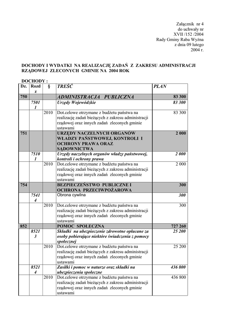 Załącznik nr 4 do uchwały nr XVII /152 /2004 Rady Gminy Raba Wyżna z dnia 09 lutego 2004 r. DOCHODY I WYDATKI NA REALIZACJĘ ZADAŃ Z ZAKRESU ADMINISTRACJI RZĄDOWEJ ZLECONYCH GMINIE NA 2004 ROK DOCHODY : Dz. Rozd § z 750 7501 1 2010 TREŚĆ ADMINISTRACJA PUBLICZNA Urzędy Wojewódzkie Dot.celowe otrzymane z budżetu państwa na realizację zadań bieżących z zakresu administracji rządowej oraz innych zadań zleconych gminie ustawami 751 URZĘDY NACZELNYCH ORGANÓW WŁADZY PAŃSTWOWEJ, KONTROLI I OCHRONY PRAWA ORAZ SĄDOWNICTWA 7510 Urzędy naczelnych organów władzy państwowej, 1 kontroli i ochrony prawa 2010 Dot.celowe otrzymane z budżetu państwa na realizację zadań bieżących z zakresu administracji rządowej oraz innych zadań zleconych gminie ustawami 754 BEZPIECZEŃSTWO PUBLICZNE I OCHRONA PRZECIWPOŻAROWA Obrona cywilna 7541 4 2010 Dot.celowe otrzymane z budżetu państwa na realizację zadań bieżących z zakresu administracji rządowej oraz innych zadań zleconych gminie ustawami 852 POMOC SPOŁECZNA 8521 Składki na ubezpieczenie zdrowotne opłacane za 3 osoby pobierające niektóre świadczenia z pomocy społecznej 2010 Dot.celowe otrzymane z budżetu państwa na realizację zadań bieżących z zakresu administracji rządowej oraz innych zadań zleconych gminie ustawami 8521 Zasiłki i pomoc w naturze oraz składki na 4 ubezpieczenia społeczne 2010 Dot.celowe otrzymane z budżetu państwa na realizację zadań bieżących z zakresu administracji rządowej oraz innych zadań zleconych gminie ustawami PLAN 83 300 83 300 83 300 2 000 2 000 2 000 300 300 300 727 260 25 200 25 200 436 800 436 800 8521 6 Zasiłki rodzinne, pielęgnacyjne i wychowawcze 103 800 2010 Dot.celowe otrzymane z budżetu państwa na realizację zadań bieżących z zakresu administracji rządowej oraz innych zadań zleconych gminie ustawami 103 800 Ośrodki Pomocy Społecznej 8521 9 161 460 2010 Dot.celowe otrzymane z budżetu państwa na realizację zadań bieżących z zakresu administracji rządowej oraz innych zadań zleconych gminie ustawami 148 180 RAZEM DOCHODY 812 860 WYDATKI : Dz. 750 Rozdz TREŚĆ ADMINISTRACJA PUBLICZNA 75011 Urzędy Wojewódzkie 751 75101 754 75414 852 85213 85214 1.wydatki bieżące w tym: wynagrodzenia i pochodne od wynagrodzeń URZĘDY NACZELNYCH ORGANÓW WŁADZY PAŃSTWOWEJ, KONTROLI I OCHRONY PRAWA ORAZ SĄDOWNICTWA Urzędy naczelnych organów władzy państwowej , kontroli i ochrony prawa 1.wydatki bieżące w tym: wynagrodzenia i pochodne od wynagrodzeń BEZPIECZEŃSTWO PUBLICZNE I OCHRONA POŻAROWA Obrona cywilna 1.wydatki bieżące POMOC SPOŁECZNA Składki na ubezpieczenie zdrowotne opłacane za osoby pobierające niektóre świadczenia z pomocy społecznej 1.wydatki bieżące Składki na ubezpieczenie zdrowotne opłacane za osoby pobierające niektóre świadczenia z pomocy społecznej 1.wydatki bieżące w tym : wynagrodzenia i pochodne od wynagrodzeń PLAN 83 300 83 300 83 300 83 300 2 000 2 000 2 000 329 300 300 300 727 260 25 200 25 200 436 800 436 800 30 000 85216 Zasiłki rodzinne, pielęgnacyjne i wychowawcze 1.wydatki bieżące 85219 Ośrodki Pomocy Społecznej 1.wydatki bieżące w tym: wynagrodzenia i pochodne od wynagrodzeń RAZEM WYDATKI 103 800 103 800 161 460 161 460 161 460 812 860 Plan dochodów państwa związanych z realizacją zadań zleconych jednostkom samorządu terytorialnego . Dz. Rozdz 750 75011 § 235 0 PLAN TREŚĆ 21 800 ADMINISTRACJA PUBLICZNA 21 800 Urzędy Wojewódzkie 21 800 Dochody budżetu państwa związane z realizacją zadań zleconych jednostkom samorządu terytorialnego /za dowody osobiste/ Przewodniczacy Rady Gminy Raba Wyżna Marian Wojdyła