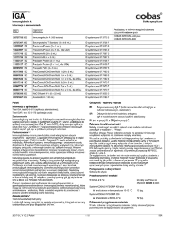 0020737755322COINV10.0 IGA Immunoglobulin A Białka specyficzne Informacja o zamówieniach 20737755 322 Immunoglobulin A (100 testów) ID systemowe 07 3775 5 20737267 322 10557897 122 10557897 160 10171743 122 10171735 122 11333127 122 11333127 160 03121291 122 05117003 190 05947626 190 05947626 160 05117216 190 05947774 190 05947774 160 20756350 322 20721867 322 Serumproteins T Standard (5 × 0.5 mL) Precinorm Protein (3 × 1 mL) Precinorm Protein (3 x 1 mL, dla USA) Precinorm U (20 × 5 mL) Precinorm U (4 × 5 mL) Precipath Protein (3 x 1 mL) Precipath Protein (3 × 1 mL, dla USA) Precipath PUC (4 × 3 mL) PreciControl ClinChem Multi 1 (20 × 5 mL) PreciControl ClinChem Multi 1 (4 × 5 mL) PreciControl ClinChem Multi 1 (4 x 5 mL, dla USA) PreciControl ClinChem Multi 2 (20 × 5 mL) PreciControl ClinChem Multi 2 (4 × 5 mL) PreciControl ClinChem Multi 2 (4 x 5 mL, dla USA) NaCl Diluent 9 % (6 × 22 mL) Accelerator I (100 mL) ID systemowe 07 3726 7 ID systemowe 07 9105 9 ID systemowe 07 9105 9 ID systemowe 07 7997 0 ID systemowe 07 7997 0 ID systemowe 07 9106 7 ID systemowe 07 9106 7 ID systemowe 07 6757 3 ID systemowe 07 7469 3 ID systemowe 07 7469 3 ID systemowe 07 7469 3 ID systemowe 07 7470 7 ID systemowe 07 7470 7 ID systemowe 07 7470 7 ID systemowe 07 5635 0 ID systemowe 07 2186 7 Analizatory, w których mogą być używane odczynniki cobas c pack COBAS INTEGRA 400 plus COBAS INTEGRA 800 Polski Odczynniki - roztwory robocze Informacja o aplikacjach Test IGA, test ID 0-075 (aplikacja standardowa). Test IGAP, test ID 0-175 (aplikacja czuła) R1 Antysurowica anty-IgA T (królicza) swoista dla ludzkiej IgA, w buforze fosforanowym, stabilizatory SR Odczynnik do kontroli nadmiaru antygenu IgA w rozcieńczonym osoczu ludzkim; stabilizatory Zastosowanie Immunologiczny test in vitro do ilościowych oznaczeń immunoglobuliny A w ludzkiej surowicy i osoczu w systemach COBAS INTEGRA. Dodatkowo do aplikacji standardowej (test IGA, ID testu 0‑075), dołączana jest aplikacja czuła (test IGAP, ID testu 0‑175) przeznaczona do oznaczeń ilościowych niskich stężeń IgA, np. w próbkach pobranych od dzieci. Podsumowanie1,2 Immunoglobuliny chronią ciało ludzkie przed wtargnięciem obcych organizmów i czynników. Cząsteczki immunoglobulin składają się z części wiążącej antygen (Fab) i trzonu Fc. Fragment Fc może wchodzić w interakcję z komórkami systemu immunologicznego i składowymi układu dopełniacza. Fragment Fab rozpoznaje antygeny w płynach (np. toksyny) i antygeny związane z mikroorganizmami (np. bakterie i wirusy). Miejsce wiążące antygen może bezpośrednio inicjować neutralizację toksyn, może uczulać komórki immunokompetentne, może ograniczać infekcje wirusowe i rozwój reakcji zapalnych. Naturalną reakcją na procesy zapalne jest wzrost immunoglobulin wszystkich klas w surowicy. Podwyższony poziom IgA występuje przy zapaleniach skóry, jelit, układu oddechowego lub w infekcjach nerek. Proliferacja komórek nowotworowych wywodzących się z komórek produkujących immunoglobuliny (komórek plazmatycznych) powoduje wzrost immunoglobulin jednej klasy w surowicy (szpiczak). Niedobory immunoglobulin mogą być wynikiem zespołów utraty białka, dziedzicznymi niedoborami, lub wtórnie, na skutek toczącego się procesu nowotworowego w tkance limfatycznej. W związku z powolną syntezą IgA, jej stężenie we krwi u dzieci jest mniejsze niż u dorosłych. Znanym zjawiskiem jest wydzielanie tak zwanych paraprotein w gammapatiach monoklonalnych (immunoglobulinemia monoklonalna), które mogą się różnić od immunoglobulin pochodzenia poliklonalnego kolejnością aminokwasów i wielkością. Może to osłabić wiązanie do przeciwciała i przez to utrudnić dokładną ocenę ilościową. Zasada pomiaru3 Test immunoturbidymetryczny Ludzka IgA tworzy precypitat ze swoistą antysurowicą, który jest oznaczany turbidymetrycznie przy długości fali 340 nm. 2017-01, V 10.0 Polski R1 jest w pozycji B, a SR jest w pozycji C. Zalecenia i środki ostrożności Należy przestrzegać wszelkich zaleceń oraz środków ostrożności zawartych w rozdziale 1, "Wstęp". Dla USA: Uwaga: Prawo federalne zezwala na sprzedaż niniejszego urządzenia wyłącznie na podstawie recepty lekarskiej. Wszystkie produkty pochodzenia ludzkiego powinny być uważane za potencjalnie zakaźne. Ludzki materiał krwiopochodny użyty w niniejszym wyrobie został przygotowany wyłącznie z krwi dawców, u których indywidualne badania na obecność HBsAg i przeciwciał przeciwko HCV i HIV dały wynik ujemny. Użyte metody zostały zaaprobowane przez FDA lub została potwierdzona ich zgodność z Dyrektywą Europejską 98/79/EC, Aneks II, Lista A. Ze względu na to, że żaden test nie może wykluczyć ryzyka zakażenia z absolutną pewnością, wszelkie materiały należy traktować z taką samą ostrożnością, jak próbki pobrane od pacjentów. W przypadku bezpośredniego kontaktu należy stosować się do wytycznych opracowanych przez odpowiednie działy służby zdrowia.4,5 Postępowanie z odczynnikami Gotowy do użycia Przechowywanie i trwałość W temp. 2‑8 °C Do daty ważności na etykiecie cobas c pack System COBAS INTEGRA 400 plus W analizatorze w temperaturze 10‑15 °C 12 tyg. System COBAS INTEGRA 800 W analizatorze w temp. 8 °C 12 tyg. Pobieranie i przygotowanie materiału W celu pobrania i przygotowania materiału należy stosować jedynie przeznaczone do tego probówki lub pojemniki. 1/5 IGA 0020737755322COINV10.0 IGA Immunoglobulin A Białka specyficzne Sprawdzono i zaakceptowano możliwość stosowania jedynie materiałów biologicznych wymienionych poniżej. Surowica Osocze: Osocze Li-heparynizowane lub pobrane na EDTA Podane rodzaje próbek oznaczono przy użyciu wybranych probówek do pobierania materiału dostępnych na rynku w czasie wykonywania oznaczeń. Oznacza to, że nie przetestowano probówek od wszystkich producentów. Systemy pobierania próbek pochodzące o