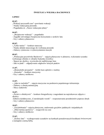 ŚWIETLICA WIEJSKA BACHOWICE LIPIEC 02.07. „Wakacji przyszedł czas”- powitanie wakacji. - Nauka wakacyjnej piosenki. - Pogadanka nt. „Nasze wakacyjne plany” 04.07. - „Bezpieczne wakacje” – pogadanka - Zagadki utrwalające bezpieczne korzystanie z uroków lata - Gry i zabawy planszowe 05.07. -„Tylko taniec” – konkurs taneczny - Nauka układu tanecznego do wybranej piosenki - Zabawy rytmiczne z wykorzystaniem muzyki 09.07. -„Wakacyjna pocztówka Bachowic” – zajęcia plastyczne w plenerze, wykonanie rysunku wybranego obiektu w obrębie budynku świetlicy - Spacer po okolicy, wycieczka do najbliższego lasu - Jaki to ptak? – odgadywanie odgłosów leśnych ptaków 11.07. -„Bransoletki przyjaźni” – krótki kurs splotów z muliny - „Karaoke” – konkurs muzyczny - Gry i zabawy stolikowe 12.07. - „Jaka to melodia?” – zajęcia muzyczne na podstawie popularnego teleturnieju - Zabawy z chustą animacyjną - Mecz siatkówki 16.07. -„Świat w obiektywie” – konkurs fotograficzny z nagrodami na najciekawsze zdjęcie z okolicy -Zabawa dydaktyczna „Czarodziejski worek” – rozpoznawanie przedmiotów poprzez dotyk - Gry i zabawy planszowe 18.07. - „Grzybobranie”- zajęcia plastyczne, malowanie grzybów jadalnych i niejadalnych - „Mini turniej sportowy” – rozgrywki na czas - Gry i zabawy stolikowe 23.07. - „Kolory lata” – wydrapywanie rysunków na kartkach pomalowanych kredkami świecowymi a następnie czarną farbą - Wspólne oglądanie ulubionych bajek dzieci - Zabawa „Kim jestem?” – jaką postacią z oglądanych bajek 25.07. - „Jedz zdrowo” – pogadanka na temat zdrowej żywności - Wykonanie plakatu „Wiem co jem” - Wspólne sporządzenie sałatki owocowej 30.07. -„Podchody” – zabawa w plenerze - Praca plastyczna: „Kocham wakacje za..” - Gry i zabawy ruchowe na świeżym powietrzu SIERPIEŃ 01.08. - „Turniej warcabów” – wybór mistrza gry w warcaby - „Motylek” – praca techniczna z wykorzystaniem kolorowego papieru - Gry i zabawy ruchowe 02.08. -„Familiada” – turniej drużynowy na podstawie znanego teleturnieju - Gry i zabawy na świeżym powietrzu - Magiczne miejsca w Bachowicach – wykonanie magicznej mapy Bachowic 06.08. - „Kosmici” – praca techniczna – wykonanie małych kosmitów - Zabawy sportowe na świeżym powietrzu - Gry i zabawy stolikowe 08.08. - „Mam talent” – prezentacja talentów - „Świat w kolorach czerni i bieli” – rysowanie węglem - Gry i zabawy planszowe 09.08. -„Układanki” – tworzenie układanek z patyczków po lodach - „Kocham cie Polsko” – turniej wiedzy o Polsce - Zabawy z wykorzystaniem chusty animacyjnej 13.08. - „Bezpieczny Internet” – zajęcia profilaktyczne nt. bezpiecznego korzystania z sieci - Gry i zabawy słowne - Zajęcia sportowe na świeżym powietrzu 15.08. -„To co nas otacza” – quiz z nagrodami na temat przyrody - „Tak to leciało” – konkurs muzyczny - Gry i zabawy ruchowe na świeżym powietrzu 16.08. - „Kolorowy ryż” – wykonywanie obrazków z wykorzystaniem ryżu - Mini turniej w „Catch ball” - Gry i zabawy stolikowe 20.08. - „Milionerzy” – turniej wiedzy - „Cuda z papieru” – zajęcia z techniki orgiami - Gry i zabawy planszowe 22.08. -„Spójrz inaczej” – pogadanka na temat tolerancji wobec osób niepełnosprawnych - Gry i zabawy stolikowe - Co to tolerancja? – zobrazowanie tego, jak dzieci rozumieją słowo tolerancja 23.08. - „Lornetka z odzysku” – wykonywanie lornetek z rolek - Gry i zabawy na świeżym powietrzu - Zabawy przy muzyce(krzesełka, taniec na gazecie, taniec z balonami) 27.08. - „Z ortografią za pan brat” – mini konkurs na najlepszego ortografa świetlicy - Zagadki utrwalające zasady ortografii - Gry i zabawy stolikowe 29.08. - „Nowy rok szkolny będzie” – postanowienia na nowy rok szkolny - „Nasze małe szkolne deklaracje” – spisanie na kartkach postanowień na nowy rok szkolny i wrzucenie ich do magicznego pudełeczka - Gry i zabawy planszowe 30.08 -„Żegnajcie wakacje na rok cały” – pożegnanie wakacji – wspólne ognisko, rozdanie nagród - Gry i zabawy na świeżym powietrzu - Wspominanie minionych wakacji, opowieści o odwiedzanych miejscach