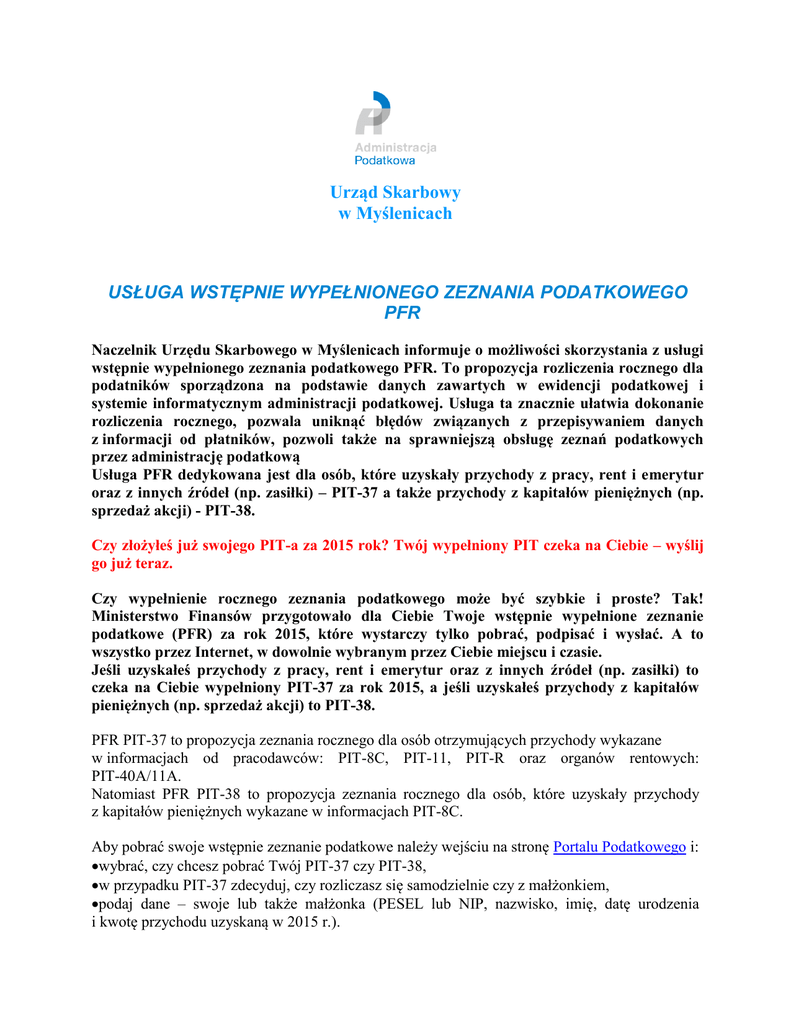 Urząd Skarbowy w Myślenicach USŁUGA WSTĘPNIE WYPEŁNIONEGO ZEZNANIA PODATKOWEGO PFR Naczelnik Urzędu Skarbowego w Myślenicach informuje o możliwości skorzystania z usługi wstępnie wypełnionego zeznania podatkowego PFR. To propozycja rozliczenia rocznego dla podatników sporządzona na podstawie danych zawartych w ewidencji podatkowej i systemie informatycznym administracji podatkowej. Usługa ta znacznie ułatwia dokonanie rozliczenia rocznego, pozwala uniknąć błędów związanych z przepisywaniem danych z informacji od płatników, pozwoli także na sprawniejszą obsługę zeznań podatkowych przez administrację podatkową Usługa PFR dedykowana jest dla osób, które uzyskały przychody z pracy, rent i emerytur oraz z innych źródeł (np. zasiłki) – PIT-37 a także przychody z kapitałów pieniężnych (np. sprzedaż akcji) - PIT-38. Czy złożyłeś już swojego PIT-a za 2015 rok? Twój wypełniony PIT czeka na Ciebie – wyślij go już teraz. Czy wypełnienie rocznego zeznania podatkowego może być szybkie i proste? Tak! Ministerstwo Finansów przygotowało dla Ciebie Twoje wstępnie wypełnione zeznanie podatkowe (PFR) za rok 2015, które wystarczy tylko pobrać, podpisać i wysłać. A to wszystko przez Internet, w dowolnie wybranym przez Ciebie miejscu i czasie. Jeśli uzyskałeś przychody z pracy, rent i emerytur oraz z innych źródeł (np. zasiłki) to czeka na Ciebie wypełniony PIT-37 za rok 2015, a jeśli uzyskałeś przychody z kapitałów pieniężnych (np. sprzedaż akcji) to PIT-38. PFR PIT-37 to propozycja zeznania rocznego dla osób otrzymujących przychody wykazane w informacjach od pracodawców: PIT-8C, PIT-11, PIT-R oraz organów rentowych: PIT-40A/11A. Natomiast PFR PIT-38 to propozycja zeznania rocznego dla osób, które uzyskały przychody z kapitałów pieniężnych wykazane w informacjach PIT-8C. Aby pobrać swoje wstępnie zeznanie podatkowe należy wejściu na stronę Portalu Podatkowego i: wybrać, czy chcesz pobrać Twój PIT-37 czy PIT-38, w przypadku PIT-37 zdecyduj, czy rozliczasz się samodzielnie czy z małżonkiem, podaj dane – swoje lub także małżonka (PESEL lub NIP, nazwisko, imię, datę urodzenia i kwotę przychodu uzyskaną w 2015 r.). I masz już swoje zeznanie podatkowe! Teraz tylko przekonaj się, że wszystkie dane się zgadzają – wszystkie kwoty z prawidłowych informacji od płatników i organów rentowych znajdują się w PFR i nie musisz już ich sam wpisywać. Możesz uzupełnić te dane, np. jeśli korzystasz z ulg podatkowych lub chcesz przeznaczyć 1 proc. podatku na wybraną organizację pożytku publicznego. Jeśli rozliczasz się z małżonkiem, system automatycznie sumuje poszczególne kwoty, co pozwala na uniknięcie wielu błędów przy wypełnianiu deklaracji, związanych z przepisywaniem informacji od płatników. Na koniec sprawdź, czy wszystko się zgadza i wyślij swoje zeznanie PIT do urzędu skarbowego. Wypełnienie zeznania nigdy nie było takie proste! Skorzystaj z PFR już teraz: /PFR PIT-37/ i /PFR PIT-38/ za rok 2015