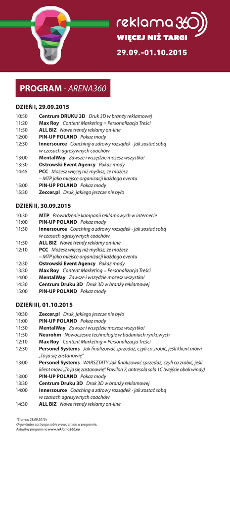 29.09.-01.10.2015 PROGRAM - ARENA360 DZIEŃ I, 29.09.2015 10:50Centrum DRUKU 3D Druk 3D w branży reklamowej 11:20Max Roy Content Marketing = Personalizacja Treści 11:50ALL BIZ Nowe trendy reklamy on-line 12:00PIN-UP POLAND Pokaz mody 12:30Innersource Coaching a zdrowy rozsądek - jak zostać sobą w czasach agresywnych coachów 13:00MentalWay Zawsze i wszędzie możesz wszystko! 13:30Ostrowski Event Agency Pokaz mody 14:45PCC Możesz więcej niż myślisz, że możesz – MTP jako miejsce organizacji każdego eventu 15:00PIN-UP POLAND Pokaz mody 15:30Zeccer.pl Druk, jakiego jeszcze nie było DZIEŃ II, 30.09.2015 10:30MTP Prowadzenie kampanii reklamowych w internecie 11:00PIN-UP POLAND Pokaz mody 11:30Innersource Coaching a zdrowy rozsądek - jak zostać sobą w czasach agresywnych coachów 11:50ALL BIZ Nowe trendy reklamy on-line 12:10PCC Możesz więcej niż myślisz, że możesz – MTP jako miejsce organizacji każdego eventu 12:30Ostrowski Event Agency Pokaz mody 13:30Max Roy Content Marketing = Personalizacja Treści 14:00MentalWay Zawsze i wszędzie możesz wszystko! 14:30Centrum Druku 3D Druk 3D w branży reklamowej 15:00PIN-UP POLAND Pokaz mody DZIEŃ III, 01.10.2015 10:30Zeccer.pl Druk, jakiego jeszcze nie było 11:00PIN-UP POLAND Pokaz mody 11:30MentalWay Zawsze i wszędzie możesz wszystko! 11:50Neurohm Nowoczesne technologie w badaniach rynkowych 12:10Max Roy Content Marketing = Personalizacja Treści 12:30Personel Systems Jak finalizować sprzedaż, czyli co zrobić, jeśli klient mówi „To ja się zastanowię” 13:00 Personel Systems WARSZTATY Jak finalizować sprzedaż, czyli co zrobić, jeśli klient mówi „To ja się zastanowię” Pawilon 7, antresola sala 1C (wejście obok windy) 13:00PIN-UP POLAND Pokaz mody 13:30Centrum Druku 3D Druk 3D w branży reklamowej 14:00Innersource Coaching a zdrowy rozsądek - jak zostać sobą w czasach agresywnych coachów 14:30ALL BIZ Nowe trendy reklamy on-line *Stan na 28.09.2015 r Organizator zastrzega sobie prawo zmian w programie. Aktualny program na www.reklama360.eu