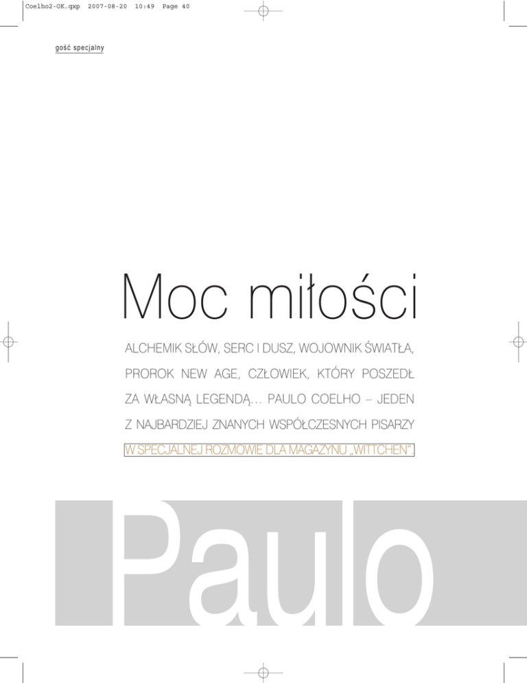 Coelho2-OK.qxp 2007-08-20 10:49 Page 40 gość specjalny Moc miłości ALCHEMIK SŁÓW, SERC I DUSZ, WOJOWNIK ŚWIATŁA, PROROK NEW AGE, CZŁOWIEK, KTÓRY POSZEDŁ ZA WŁASNĄ LEGENDĄ… PAULO COELHO – JEDEN Z NAJBARDZIEJ ZNANYCH WSPÓŁCZESNYCH PISARZY W SPECJALNEJ ROZMOWIE DLA MAGAZYNU „WITTCHEN”. Paulo Coelho2-OK.qxp 2007-08-20 10:49 Page 41 Coelho WITTCHEN 41 Coelho2-OK.qxp 2007-08-20 10:49 Page 42 gość specjalny Kiedyś opowiedział Pan o wizji, którą miał Pan, zwiedzając obóz koncentracyjny w Dachau. Ujrzał Pan wówczas pewnego człowieka, a później spotkał go w pubie w Amsterdamie. Ta znajomość odmieniła Pana życie. Mógłby Pan zdradzić więcej szczegółów? Miało to miejsce w Brower Hotel, przy ulicy Singel 83, w styczniu 1982 roku. Niedawno w Polsce ukazała się Pana najnow sza książka „Czarownica z Portobello”. Jakie miejsce przypisuje Pan czarownicom we współczesnym społeczeństwie? Niestety, słowo „czarownica” wywołuje negatywne skojarzenia. Jednak według mnie czarownica to kobieta, która pozwala, aby prowadziła ją intuicja, która żyje w harmonii ze swoim otoczeniem i nie boi się podejmować trudnych wyzwań. Takie kobiety jak Atena, główna bohaterka mojej powieści, wciąż spotykają się z wieloma uprzedzeniami ze strony społeczeństwa. Wierzę jednak, że ludzkie umysły zaczyna ogarniać również nowy rodzaj czułości. Jesteśmy świadkami początku nowej ery, w której kobiece wartości, takie jak wielkoduszność czy tolerancja, odgrywają istotną rolę. Pan jest katolikiem. Co myśli Pan o innych wyznaniach? Wielu ludzi upatruje zagrożenia w rosnącym wpływie islamu... Zagrożeniem dzisiaj jest nie wpływ islamu, ale radykalizmu, i to niezależnie od tego, czy chodzi o radykalizm muzułmański, chrześcijański, czy żydowski. Nie powinniśmy się oszukiwać i wierzyć, że radykalizm jest tylko wynikiem religii. Oczywiście, on pojawia się w religii, ale przede wszystkim ma charakter polityczny. Niemniej jednak ważne jest, aby rozróżniać religię i duchowość. Jestem katolikiem, więc dla mnie religia to przestrzeganie pewnej dyscypliny i okazja do wspólnej modlitwy z ludźmi, którzy wyznają tę samą wiarę. Ale przecież ostatecznie wszystkie religie wskazują na to samo światło. Między nami a światłem nieraz jest zbyt wiele reguł. Niektóre z nich są naprawdę ważne, ale inne z kolei mogą nas oślepiać. Trzeba uważać, by nie osłabić jasności tego właściwego światła – duszy świata. Napisał Pan wiele o miłości. Czy mógłby Pan wymienić trzy podstawowe warunki udanego związku? Nie do końca potrafię pojąć, dlaczego miałyby istnieć akurat trzy podstawowe warunki. Przecież to właśnie miłość zaprzecza tego rodzaju zorganizowanej, metodycznej logice. Miłość jest siłą, która może nas unieść albo zniszczyć, może zaledwie w kilka sekund przenieść nas z nieba do piekła. Słusznie określił to kiedyś Teilhard de Chardin, mówiąc, że nie nauczyliśmy się dysponować tą siłą, świadomie 42 WITTCHEN przemieniać jej w energię, jak to zrobiliśmy z wiatrem, wodą czy słońcem. Gdybyśmy zatem nauczyli się przekierowywać tę siłę, a nie opanowywać ją – byłby to wielki skok do przodu. Trzeba jednak pamiętać, że mamy do czynienia z mocą, która znacznie nas przewyższa. Czy sława nie przeszkadza Panu w poszuki waniu spokoju i harmonii? Ci, którzy wierzą, że można poznać świat z zewnątrz, wpadają w pułapkę. Bo aby móc doświadczyć życia, trzeba tak naprawdę być w samym centrum chaosu. Według mnie człowiek, żeby naprawdę żyć, musi oddać się jakiemuś projektowi, marzeniu. W moim przypadku oznaczało to wybór bycia pisarzem w kraju, w którym jest to niemal niemożliwe. Najważniejsze, abym nadal mógł pisać o rzeczach, które są ważne dla mnie, nie dla krytyków. Abym codziennie zadawał sobie pytania, wciąż poznawał ludzi i był otwarty na świat. Myślę, że to konfrontacja z duszą sprawia, że czyjeś życie jest ciekawe. Chcę być zaskakiwany i ciągle wątpić, ponieważ wierzę, że to jest właśnie jądrem życia. „CZAROWNICA Z PORTOBELLO” Kim jest Atena? Sierotą porzuconą przez Cygankę w Transylwanii? Dzieckiem zabranym do Bejrutu przez rodziców adopcyjnych? Urzędniczką londyńskiego banku? Wziętą agentką nieruchomości w Dubaju? Kapłanką z Portobello Road? O Atenie opowiadają osoby, które ją znały – wśród nich jest dziennikarz badający mity o wampirach, aktorka teatralna, której Atena uwiodła narzeczonego, ksiądz, który ochrzcił jej syna, przybrana matka, były mąż. Wspomnienia – po jej zniknięciu w tajemniczych okolicznościach – spisuje zakochany w Atenie mężczyzna, który pragnie uchwycić prawdę o niej. „Głównym powodem mojej pracy była potrzeba znalezienia odpowiedzi na pytanie, które wciąż mnie nurtowało: dlaczego Atena mnie pokochała, skoro tak bardzo się różnimy i mamy tak odmienną wizję świata? Wydaje mi się, że odpowiedź znalazłem w jej ostatniej rozmowie z dziennikarzem. Miłość jest” – napisał. (Drzewo Babel) Coelho2-OK.qxp 2007-08-20 10:49 Page 43 ALCHEMIK SŁÓW W tym roku obchodzi 60. urodziny. Urodził się w średniozamożnej rodzinie – jego ojciec Pedro był inżynierem, a matka Ligia zajmowała się domem. W jezuickiej szkole im. św. Ignacego w Rio de Janeiro, do której uczęszczał od 7. roku życia, odkrył swoje prawdziwe powołanie – „być pisarzem”. Pierwszą nagrodę literacką zdobył w szkolnym konkursie poezji, a jego siostra Sonia wyznała, że nagrodzono jej esej, w którym wykorzystała tekst wyrzucony przez Paula do śmieci. Rodzice od samego początku próbowali stłumić jego zamiłowanie do literatury – pragnęli, aby został inżynierem. Odkryte przez Paula dzieło Henry`ego Millera „Zwrotnik Raka” obudziło w nim ducha buntu. Dla ojca zachowanie syna było oznaką choroby psychicznej 