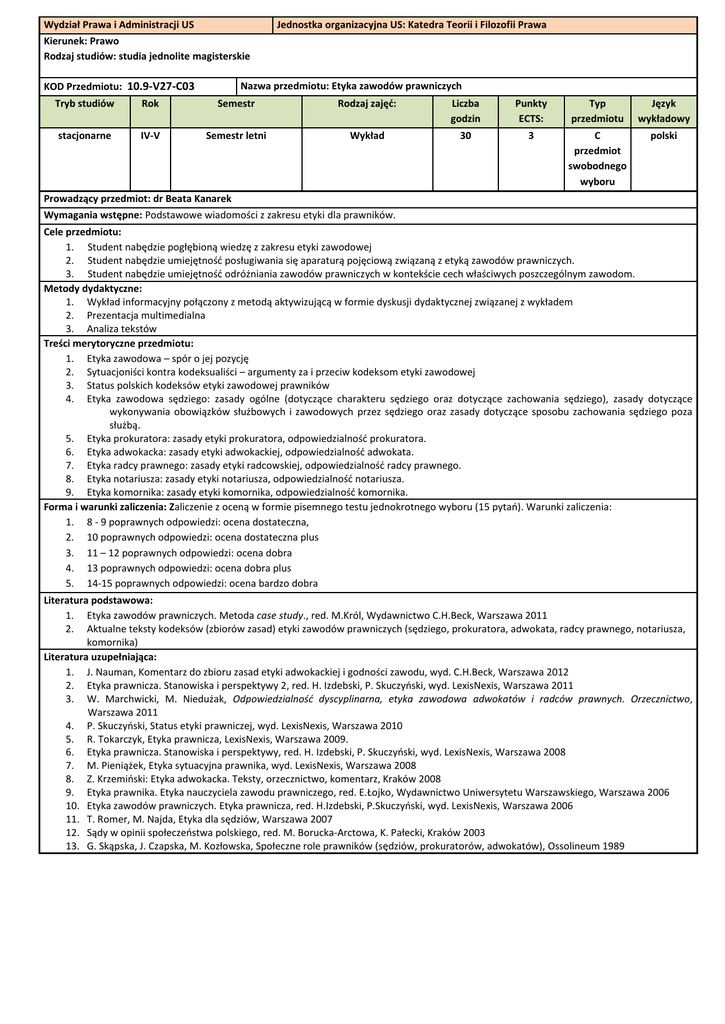 Wydział Prawa i Administracji US Jednostka organizacyjna US: Katedra Teorii i Filozofii Prawa Kierunek: Prawo Rodzaj studiów: studia jednolite magisterskie KOD Przedmiotu: 10.9-V27-C03 Nazwa przedmiotu: Etyka zawodów prawniczych Tryb studiów Rok Semestr Rodzaj zajęć: Liczba godzin Punkty ECTS: Typ przedmiotu Język wykładowy stacjonarne IV-V Semestr letni Wykład 30 3 C przedmiot swobodnego wyboru polski Prowadzący przedmiot: dr Beata Kanarek Wymagania wstępne: Podstawowe wiadomości z zakresu etyki dla prawników. Cele przedmiotu: 1. Student nabędzie pogłębioną wiedzę z zakresu etyki zawodowej 2. Student nabędzie umiejętność posługiwania się aparaturą pojęciową związaną z etyką zawodów prawniczych. 3. Student nabędzie umiejętność odróżniania zawodów prawniczych w kontekście cech właściwych poszczególnym zawodom. Metody dydaktyczne: 1. Wykład informacyjny połączony z metodą aktywizującą w formie dyskusji dydaktycznej związanej z wykładem 2. Prezentacja multimedialna 3. Analiza tekstów Treści merytoryczne przedmiotu: 1. Etyka zawodowa – spór o jej pozycję 2. Sytuacjoniści kontra kodeksualiści – argumenty za i przeciw kodeksom etyki zawodowej 3. Status polskich kodeksów etyki zawodowej prawników 4. Etyka zawodowa sędziego: zasady ogólne (dotyczące charakteru sędziego oraz dotyczące zachowania sędziego), zasady dotyczące wykonywania obowiązków służbowych i zawodowych przez sędziego oraz zasady dotyczące sposobu zachowania sędziego poza służbą. 5. Etyka prokuratora: zasady etyki prokuratora, odpowiedzialność prokuratora. 6. Etyka adwokacka: zasady etyki adwokackiej, odpowiedzialność adwokata. 7. Etyka radcy prawnego: zasady etyki radcowskiej, odpowiedzialność radcy prawnego. 8. Etyka notariusza: zasady etyki notariusza, odpowiedzialność notariusza. 9. Etyka komornika: zasady etyki komornika, odpowiedzialność komornika. Forma i warunki zaliczenia: Zaliczenie z oceną w formie pisemnego testu jednokrotnego wyboru (15 pytań). Warunki zaliczenia: 1. 8 - 9 poprawnych odpowiedzi: ocena dostateczna, 2. 10 poprawnych odpowiedzi: ocena dostateczna plus 3. 11 – 12 poprawnych odpowiedzi: ocena dobra 4. 13 poprawnych odpowiedzi: ocena dobra plus 5. 14-15 poprawnych odpowiedzi: ocena bardzo dobra Literatura podstawowa: 1. Etyka zawodów prawniczych. Metoda case study., red. M.Król, Wydawnictwo C.H.Beck, Warszawa 2011 2. Aktualne teksty kodeksów (zbiorów zasad) etyki zawodów prawniczych (sędziego, prokuratora, adwokata, radcy prawnego, notariusza, komornika) Literatura uzupełniająca: 1. J. Nauman, Komentarz do zbioru zasad etyki adwokackiej i godności zawodu, wyd. C.H.Beck, Warszawa 2012 2. Etyka prawnicza. Stanowiska i perspektywy 2, red. H. Izdebski, P. Skuczyński, wyd. LexisNexis, Warszawa 2011 3. W. Marchwicki, M. Niedużak, Odpowiedzialność dyscyplinarna, etyka zawodowa adwokatów i radców prawnych. Orzecznictwo, Warszawa 2011 4. P. Skuczyński, Status etyki prawniczej, wyd. LexisNexis, Warszawa 2010 5. R. Tokarczyk, Etyka prawnicza, LexisNexis, Warszawa 2009. 6. Etyka prawnicza. Stanowiska i perspektywy, red. H. Izdebski, P. Skuczyński, wyd. LexisNexis, Warszawa 2008 7. M. Pieniążek, Etyka sytuacyjna prawnika, wyd. LexisNexis, Warszawa 2008 8. Z. Krzemiński: Etyka adwokacka. Teksty, orzecznictwo, komentarz, Kraków 2008 9. Etyka prawnika. Etyka nauczyciela zawodu prawniczego, red. E.Łojko, Wydawnictwo Uniwersytetu Warszawskiego, Warszawa 2006 10. Etyka zawodów prawniczych. Etyka prawnicza, red. H.Izdebski, P.Skuczyński, wyd. LexisNexis, Warszawa 2006 11. T. Romer, M. Najda, Etyka dla sędziów, Warszawa 2007 12. Sądy w opinii społeczeństwa polskiego, red. M. Borucka-Arctowa, K. Pałecki, Kraków 2003 13. G. Skąpska, J. Czapska, M. Kozłowska, Społeczne role prawników (sędziów, prokuratorów, adwokatów), Ossolineum 1989