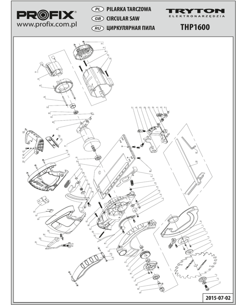 PILARKA TARCZOWA www.profix.com.pl CIRCULAR SAW RU ЦИРКУЛЯРНАЯ ПИЛА THP1600 2015-07-02 Part No Art No Pc EN Description PL Opis RUS Описание Hexagon bolt Śruba z łbem walcowym z gniazdem sześciokątnym Болт с внутренним шестигранником под ключ Flat washer Podkładka płaska Плоская шайба Outside flange Podkładka górna (zewnętrzna) tarczy Наружный фланец диска Saw blade Ø185mm Piła tarczowa Ø185mm Диск пильный Ø185мм Inner flange Podkładka dolna (wewnętrzna) tarczy Внутренний фланец диска 6 Corss sunk screw Śruba z łbem grzybkowym Винт с потайной головкой 7 Cross pan head screw Śruba z łbem grzybkowym Винт с полукруглой головкой 8 Movable guard’s flange Kołnierz pokrywy ochronnej Фланец подвижной защиты 1 YTHP16SR 2 3 YTHP16PT 4 5 YTHP16PT 9 Movable guard spanner Uchwyt pokrywy ochronnej Ручка подвижной защиты 10 Movable guard Pokrywa ochronna ruchoma Подвижная защита 11 Corss sunk screw Śruba z łbem stożkowym Винт с потайной головкой 12 Rubber buffer Amortyzator gumowy Резиновый буфер 13 Screw Śruba Винт 14 Flat washer Podkładka płaska Плоская шайба 15 Nut Nakrętka Гайка 16 Spring Sprężyna Пружина 17 Square lump Blokada wirnika Блокировка якоря 18 Cross pan head screw Śruba z łbem grzybkowym Винт с полукруглой головкой 19 Circlip Pierścień osadczy Segera Стопорное кольцо 20 Closing lever Dźwignia zamykająca Рычаг фиксирующий 21 Nut Nakrętka Гайка 22 Rivet Nit Заклепка 23 Flat washer Podkładka płaska Плоская шайба 24 Cutting angle support Przymiar kątowy Суппорт с угловой шкалой 25 Cutting angled hinge Zawias kątowy Угловой шарнир 26 Screw Śruba Винт 27 Square neck screw Śruba z łbem grzybkowym z podsadzeniem Болт с полукруглой головкой и квадратным подголовком 28 Cross pan head screw Śruba z łbem grzybkowym Винт с полукруглой головкой Motor housing Obudowa silnika Корпус двигателя 30 Cross pan head screw Śruba z łbem grzybkowym Винт с полукруглой головкой 31 Protection cover Osłona szczotek węglowych Крышка угольных щеток 32 Cross pan head screw Wkręt z łbem grzybkowym Шуруп с полукруглой головкой 33 Plug-in Koniec uzwojenia stojana do podłączenia szczotki węgłowej Вывод обмотки статора для подключения угольной щетки Stator Stojan silnika Статор электродвигателя 35 Fan guide Przesłona strugi powietrza Диафрагма воздушного потока 36 Cross pan head screw Śruba z łbem grzybkowym Винт с полукруглой головкой 37 Rubber bearing sleeve 608 Gniazdo gumowe łożyska 608 Гнездо резиновое шарикоподшипника 608 29 34 YTHP16OS YTHP16SS Bearing 608RS Łożysko kulkowe 608RS Шарикоподшипник 608RS 39 YTHP16SC Brush holder cover Przykrywka szczotkotrzymacza Крышка щеткодержателя 40 YTHP16SZ Carbon brush Szczotka węglowa Угольная щетка 41 YTHP16SC Carbon brush holder Szczotkotrzymacz Щеткодержатель 42 Cross pan head screw Śruba z łbem grzybkowym Винт с полукруглой головкой 43 Auxiliary handle cover Przykrywka uchwytu dodatkowego Крышка дополнительной рукоятки 44 Cross pan head screw Wkręt z łbem grzybkowym Шуруп с полукруглой головкой 38 Part No Art No Pc EN Description PL Opis RUS Описание 45 Cross pan head screw Śruba z łbem grzybkowym Винт с полукруглой головкой 46 Spring washer Podkładka sprężysta Пружинная шайба (гровер) 47 Flat washer Podkładka płaska Плоская шайба 48 Auxiliary handle Uchwyt dodatkowy Дополнительная рукоятка 49 YTHP16WS Rotor Wirnik silnika Якорь электродвигателя 50 YTHP16OW Left handle Lewa część uchwytu Левая половина рукоятки Bearing 6000RS Łożysko kulkowe 6000RS Шарикоподшипник 6000RS 51 Base plate Podstawa (stolik) Опорная плита 53 Spanner brush Nakładka plastikowa Пластиковая крышка 54 Spanner Dźwignia zamykająca Рычаг фиксирующий 55 Nut Nakrętka Гайка 56 Depth scale Skala głębokości piłowania Шкала глубины пиления 57 Rivet Nit Заклепка Square neck screw Śruba z łbem grzybkowym z podsadzeniem Болт с полукруглой головкой и квадратным подголовком Switch Włącznik Включатель Capacitor 0.22μF Kondensator 0.22μF Конденсатор 0.22μF Right handle Prawa część uchwytu Правая половина рукоятки Cable clamp Opaska kablowa Кабельный зажим Cord sheath Osłona przewodu Оплетка питательного шнура Power cord Przewód zasilający Сетевой шнур 65 Cross pan head screw Śruba z łbem grzybkowym Винт с полукруглой головкой 66 Cross pan head screw Śruba z łbem grzybkowym Винт с полукруглой головкой 52 YTHP16ST 58 59 YTHP16WL 60 61 YTHP16OW 62 63 64 YYPZE002 67 YTHP16OT Left Alu. housing Lewa część osłony tarczy Левая половина защитного кожуха 68 YTHP16SP Spring Sprężyna osłony tarczy Пружина подвижной защиты 69 Label Naklejka identyfikacyjna Фирменная наклейка 70 Plate Przesłona Щиток 71 Cr