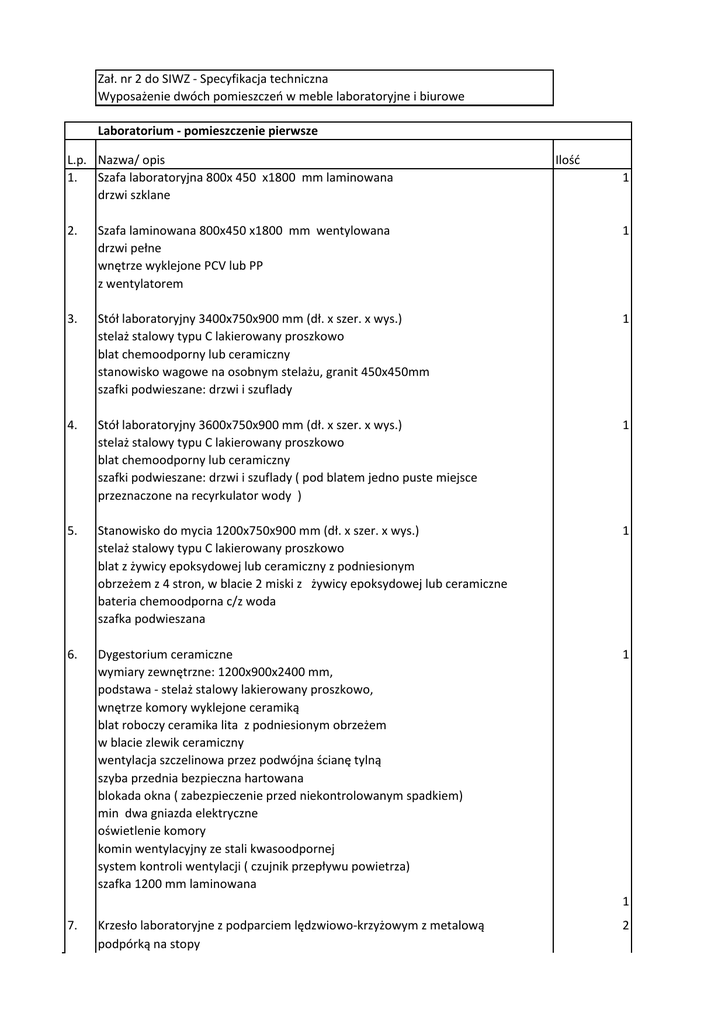 Zał. nr 2 do SIWZ - Specyfikacja techniczna Wyposażenie dwóch pomieszczeń w meble laboratoryjne i biurowe Laboratorium - pomieszczenie pierwsze L.p. Nazwa/ opis 1. Szafa laboratoryjna 800x 450 x1800 mm laminowana drzwi szklane Ilość 1 2. Szafa laminowana 800x450 x1800 mm wentylowana drzwi pełne wnętrze wyklejone PCV lub PP z wentylatorem 1 3. Stół laboratoryjny 3400x750x900 mm (dł. x szer. x wys.) stelaż stalowy typu C lakierowany proszkowo blat chemoodporny lub ceramiczny stanowisko wagowe na osobnym stelażu, granit 450x450mm szafki podwieszane: drzwi i szuflady 1 4. Stół laboratoryjny 3600x750x900 mm (dł. x szer. x wys.) stelaż stalowy typu C lakierowany proszkowo blat chemoodporny lub ceramiczny szafki podwieszane: drzwi i szuflady ( pod blatem jedno puste miejsce przeznaczone na recyrkulator wody ) 1 5. Stanowisko do mycia 1200x750x900 mm (dł. x szer. x wys.) stelaż stalowy typu C lakierowany proszkowo blat z żywicy epoksydowej lub ceramiczny z podniesionym obrzeżem z 4 stron, w blacie 2 miski z żywicy epoksydowej lub ceramiczne bateria chemoodporna c/z woda szafka podwieszana 1 6. Dygestorium ceramiczne wymiary zewnętrzne: 1200x900x2400 mm, podstawa - stelaż stalowy lakierowany proszkowo, wnętrze komory wyklejone ceramiką blat roboczy ceramika lita z podniesionym obrzeżem w blacie zlewik ceramiczny wentylacja szczelinowa przez podwójna ścianę tylną szyba przednia bezpieczna hartowana blokada okna ( zabezpieczenie przed niekontrolowanym spadkiem) min dwa gniazda elektryczne oświetlenie komory komin wentylacyjny ze stali kwasoodpornej system kontroli wentylacji ( czujnik przepływu powietrza) szafka 1200 mm laminowana 1 1 7. Krzesło laboratoryjne z podparciem lędzwiowo-krzyżowym z metalową podpórką na stopy 2 Pomieszczenie II biurowe 8. Stolik laboratoryjny 800x700x900 mm stelaż stalowy typu C lakierowany proszkowo blat chemoodporny lub ceramiczny szafka podwieszana: 800 cm 2 x drzwi 1 9. Biurko 1400x700x800 mm ( szafka -szuflada +drzwi) 3 10. Krzesło biurowe - siatkowe oparcie z podłokietnikami 2 11. Szafa laminowana 800x450x1800 mm pełna drzwi pełne, 4 półki 1 12. Szafa lamonowana 800x450x1800 mm ( połowa szafy przeznaczona na wieszaki z jedną półką na górze) drzwi pełne 1 13. Regał laminowany na segregatory 800x450x1800 mm otwarty 1 14. Szafa laminowana 800x450x1800 mm góra przeszklona, dół drzwi pełne, 4 półki 2 15. Szafka z blatem z laminatu 1000x600x900 mm szafka na nogach 1000 cm 2 drzwi, 1 Uwaga! Wymiary podane są orientacyjne , każdy z wykonawców przed złożeniem oferty jest zobowiązany zwymiarować pomieszczenia i dopasować do nich meble. Kolor mebli zostanie ustalony po konsultacji z przyszłym użytkownikiem (po przedstawieniu próbek i wzorów laminatów). Meble laboratoryjne i dygestorium winny posiadać certyfikat: ISO 9001:2008