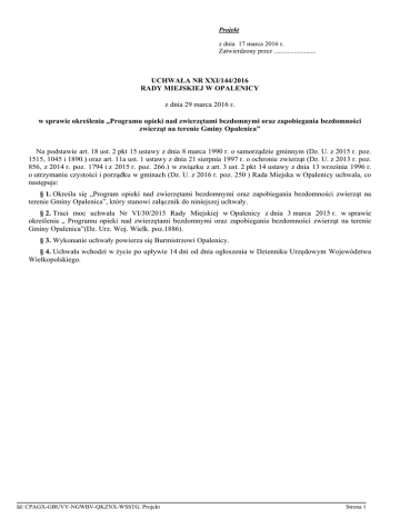 Projekt z dnia 17 marca 2016 r. Zatwierdzony przez ......................... UCHWAŁA NR XXI/144/2016 RADY MIEJSKIEJ W OPALENICY z dnia 29 marca 2016 r. w sprawie określenia „Programu opieki nad zwierzętami bezdomnymi oraz zapobiegania bezdomności zwierząt na terenie Gminy Opalenica” Na podstawie art. 18 ust. 2 pkt 15 ustawy z dnia 8 marca 1990 r. o samorządzie gminnym (Dz. U. z 2015 r. poz. 1515, 1045 i 1890.) oraz art. 11a ust. 1 ustawy z dnia 21 sierpnia 1997 r. o ochronie zwierząt (Dz. U. z 2013 r. poz. 856, z 2014 r. poz. 1794 i z 2015 r. poz. 266.) w związku z art. 3 ust. 2 pkt 14 ustawy z dnia 13 września 1996 r. o utrzymaniu czystości i porządku w gminach (Dz. U. z 2016 r. poz. 250 ) Rada Miejska w Opalenicy uchwala, co następuje: § 1. Określa się „Program opieki nad zwierzętami bezdomnymi oraz zapobiegania bezdomności zwierząt na terenie Gminy Opalenica”, który stanowi załącznik do niniejszej uchwały. § 2. Traci moc uchwała Nr VI/30/2015 Rady Miejskiej w Opalenicy z dnia 3 marca 2015 r. w sprawie określenia „ Programu opieki nad zwierzętami bezdomnymi oraz zapobiegania bezdomności zwierząt na terenie Gminy Opalenica”(Dz. Urz. Woj. Wielk. poz.1886). § 3. Wykonanie uchwały powierza się Burmistrzowi Opalenicy. § 4. Uchwała wchodzi w życie po upływie 14 dni od dnia ogłoszenia w Dzienniku Urzędowym Województwa Wielkopolskiego. Id: CPAGX-GBUVY-NGWBV-QKZNX-WSSTG. Projekt Strona 1 Załącznik do uchwały Nr XXI/144/2016 Rady Miejskiej w Opalenicy z dnia 29 marca 2016 r. Program opieki nad zwierzętami bezdomnymi oraz zapobiegania bezdomności zwierząt na terenie Gminy Opalenica. Rozdział 1. Cel programu § 1. Celem Programu opieki nad zwierzętami bezdomnymi oraz zapobiegania bezdomności zwierząt na terenie Gminy Opalenica, zwanego dalej „Programem”, jest: 1) zmniejszenie populacji bezdomnych zwierząt domowych; 2) opieka nad wolno żyjącymi kotami, w tym ich dokarmianie; 3) zapobieganie bezdomności i zapewnienie opieki bezdomnym zwierzętom oraz całodobowej opieki weterynaryjnej w przypadkach zdarzeń drogowych z udziałem zwierząt; 4) zapewnienie opieki bezdomnym zwierzętom gospodarskim. Rozdział 2. Realizatorzy programu § 2. 1. Realizacja działań dotyczących przeciwdziałaniu bezdomności zwierząt odbywa się we współpracy Gminy Opalenica z: 1) organizacjami społecznymi, których statutowym celem działania jest przeciwdziałanie bezdomności zwierząt; 2) Strażą Miejską w Opalenicy oraz Policją poprzez egzekwowanie przestrzegania przepisów o utrzymaniu czystości i porządku przez właścicieli zwierząt domowych oraz innych obowiązków ustalonych w odrębnych przepisach; 3) Schroniskiem dla Bezdomnych Zwierząt „Zwierzakowo” w Posadówku 1. 2. Koordynatorem Programu jest Gmina Opalenica. Id: CPAGX-GBUVY-NGWBV-QKZNX-WSSTG. Projekt Strona 1 Rozdział 3. Sposoby realizacji celów programu § 3. 1. Zmniejszenie populacji bezdomnych zwierząt domowych i opieka nad wolno żyjącymi kotami, w tym ich dokarmianie, realizowane będą poprzez: 1) usypianie ślepych miotów, którym nie ma możliwości zapewnienia właścicieli; 2) obligatoryjną sterylizację i kastrację zwierząt w Schronisku dla Bezdomnych Zwierząt „Zwierzakowo” w Posadówku, zabiegi sterylizacji lub kastracji prowadzone są przez lekarza weterynarii; 3) przeprowadzanie dodatkowej sterylizacji lub kastracji w gabinecie weterynaryjnym przy ul. Dworcowej 2a w Opalenicy; 4) podejmowanie działań, w przypadkach uzasadnionych, w wyniku zgłoszeń dokonanych przez mieszkańców gminy, mających na celu udzielanie doraźnej pomocy wolno żyjącym kotom oraz ich dokarmianie. Dokarmianie lub udzielanie doraźnej pomocy wolno żyjącym kotom będzie odbywać się w miejscu ich bytowania, zaś leczenie, sterylizacja lub kastracja oraz usypianie ślepych miotów przeprowadzane będą w gabinecie weterynaryjnym przy ul. Dworcowej 2a w Opalenicy, z tym że po zakończeniu leczenia i okresu rekonwalescencji, po przeprowadzeniu sterylizacji lub kastracji wolno żyjące koty umieszczane będą w miejscu swojego dotychczasowego bytowania. Dokarmianie wolno żyjących kotów odbywać będzie się za pośrednictwem pracowników Urzędu. 2. Zapobieganie bezdomności i zapewnienie opieki bezdomnym zwierzętom oraz całodobowej opieki weterynaryjnej, w przypadkach zdarzeń drogowych z udziałem zwierząt, realizowane będą w szczególności poprzez: 1) odławianie bezdomnych zwierząt w sposób doraźny, w zależności od potrzeb: a) odławianie zwierząt prowadzi Schronisko dla Bezdomnych Zwierząt „Zwierzakowo” w Posadówku, na podstawie umowy ze Stowarzyszenia Integracji Społeczności Lokalnych „Wielkopomoc”, b) odławianiem obejmuje się zwierzęta bezdomne, które uciekły, zabłąkały się lub zostały porzucone przez człowieka, jeżeli nie istnieje możliwość ustalenia właściciela lub innej osoby, pod której opieką zwierzęta dotąd pozostawały, c) odławianie zwierząt następuje po uprzednim zgłoszeniu przez mieszkańca lub służby porządkowe, w celu niedopuszczenia do pozostawania zwierzęcia bez opieki, swobodnego przemieszczania się i stwarzania zagrożenia dla bezpieczeństwa i porządku publicznego, d) odłowione zwierzęta podlegają niezwłocznemu przewiezieniu do Schroniska dla Bezdomnych Zwierząt „Zwierzakowo” w Posadówku; 2) przekazywanie zwierząt, które utraciły właściciela w wyniku wypadków losowych (zgon właściciela, długotrwały pobyt właściciela w szpitalu itp.) pod opiekę Schroniska dla Bezdomnych Zwierząt „Zwierzakowo” w Posadówku; Id: CPAGX-GBUVY-NGWBV-QKZNX-WSSTG. Projekt Strona 2 3) poszukiwanie właścicieli dla bezdomnych zwierząt przez Schronisko dla Bezdomnych Zwierząt „Zwierzakowo” w Posadówku, poprzez przekazywanie zwierząt przebywających w Schronisku do adopcji. Adopcja dokonywana jest na rzecz osób zainteresowanych i zdolnych do zapewnienia adoptowanemu zwierzęciu n