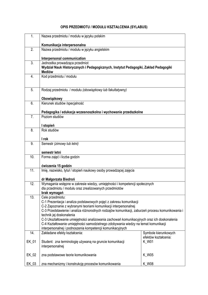 OPIS PRZEDMIOTU / MODUŁU KSZTAŁCENIA (SYLABUS) 1. Nazwa przedmiotu / modułu w języku polskim 2. Komunikacja interpersonalna Nazwa przedmiotu / modułu w języku angielskim 4. Interpersonal communication Jednostka prowadząca przedmiot Wydział Nauk Historycznych i Pedagogicznych, Instytut Pedagogiki, Zakład Pedagogiki Mediów Kod przedmiotu / modułu 5. Rodzaj przedmiotu / modułu (obowiązkowy lub fakultatywny) 6. Obowiązkowy Kierunek studiów /specjalność 7. Pedagogika / edukacja wczesnoszkolna i wychowanie przedszkolne Poziom studiów 8. I stopień Rok studiów 9. I rok Semestr (zimowy lub letni) 10. semestr letni Forma zajęć i liczba godzin 11. ćwiczenia 15 godzin Imię, nazwisko, tytuł / stopień naukowy osoby prowadzącej zajęcia 3. 12. 13. 14. EK_01 dr Małgorzata Biedroń Wymagania wstępne w zakresie wiedzy, umiejętności i kompetencji społecznych dla przedmiotu / modułu oraz zrealizowanych przedmiotów brak wymagań Cele przedmiotu: C-1 Prezentacja i analiza podstawowych pojęć z zakresu komunikacji C-2 Zapoznanie z wybranymi teoriami komunikacji interpersonalnej C-3 Przedstawienie i analiza różnorodnych rodzajów komunikacji, zaburzeń procesu komunikowania i technik jej doskonalenia C-3 Ukształtowanie umiejętności analizowania zachowań komunikacyjnych oraz ich doskonalenia C-4 Kształtowanie umiejętności samodzielnego zdobywania wiedzy na temat komunikacji interpersonalnej i podnoszenia kompetencji komunikacyjnych Zakładane efekty kształcenia: Symbole kierunkowych efektów kształcenia: Student: zna terminologię używaną na gruncie komunikacji K_W01 interpersonalnej EK_02 zna podstawowe teorie komunikowania K_W05 EK_03 zna mechanizmy i konstrukcję procesów komunikowania K_W08 interpersonalnego, jego prawidłowości i zakłóceń EK_04 posiada umiejętności obserwowania i krytycznej analizy zachowań komunikacyjnych przy użyciu różnych źródeł ich interpretowania K_W12 EK_05 potrafi dokonywać obserwacji, analizy i interpretacji zachowań komunikacyjnych K_U01 EK_06 potrafi wykorzystywać podstawową wiedzę teoretyczną do opisu i analizy zachowań komunikacyjnych K_U02 EK_07 potrafi posługiwać się podstawowymi ujęciami teoretycznymi w celu analizowania motywów i wzorów zachowań komunikacyjnych K_U04 EK_08 potrafi samodzielnie zdobywać i rozwijać wiedzę oraz umiejętności w zakresie komunikowania interpersonalnego korzystając z różnych źródeł i nowoczesnych technologii K_U05 EK_09 ma rozwinięte umiejętności komunikacyjne, potrafi używać języka specjalistycznego i porozumiewać się w sposób precyzyjny i spójny przy użyciu różnych kanałów i technik komunikacyjnych, potrafi kompetentnie porozumiewać się z osobami pochodzącymi z różnych środowisk, będącymi w różnej kondycji emocjonalnej K_U08 EK_10 posiada umiejętności autoprezentacyjne potrafi dokonywać analizy własnych zachowań komunikacyjnych i wskazywać ewentualne obszary wymagające modyfikacji K_U09 K_U16 EK_11 analizuje konkretne przykłady zachowań komunikacyjnych, ocenia ich poprawność, proponuje ewentualne modyfikacje K_U17 EK_12 ma świadomość własnej wiedzy i umiejętności, rozumie potrzebę podnoszenia kompetencji komunikacyjnych, dokonuje samooceny, doskonali kompetencje K_K01 EK_13 docenia znaczenie wiedzy o komunikacji interpersonalnej dla tworzenia i rozwoju więzi społecznych, umiejętności prezentacji własnych poglądów, potrzeb, kompetencji, zdolności do społecznej kooperacji EK_13 ma przekonanie o sensie doskonalenia kompetencji komunikacyjnych wszystkich podmiotów życia społecznego K_K02 K_K03 15. Treści programowe: Wybrane teorie komunikacji interpersonalnej. Konstrukcja procesu komunikowania się. Subiektywne i obiektywne bariery skutecznego komunikowania się. Możliwości optymalizacji procesu porozumiewania się. Kompetencje komunikacyjne. Komunikacja werbalna - język perswazji, wpływu i manipulacji w komunikacji interpersonalnej, komunikaty pasywne, asertywne i agresywne, kompetencje językowe wychowawcy i wychowanka. Komunikacja niewerbalna - formy i funkcje. Techniki i narzędzia wywierania wpływu. Sztuka konstruktywnego rozwiązywania konfliktów. Charakterystyka stylu agresywnego i pasywnego. Zasady asertywnego rozwiązywania konfliktów, słuchanie aktywne i dialogiczne. Elementy treningu asertywności - prawa Fensterheima. 16. Zalecana literatura (podręczniki) Barnes K., Wywieranie wpływu- ćwiczenia, Gdańsk 2005. 17. 18. 19. Cialdini R.B., Wywieranie wpływu na ludzi, Gdańsk 2004. Griffin E. Podstawy komunikacji społecznej, Gdańsk 2003. McKay M., Davis M., Fanning P., Sztuka skutecznego porozumiewania się. Gdańsk 2005. Morreale S.P., Spitzberg B. H., Barge J.K., Komunikacja między ludźmi, Warszawa 2007. Nęcki Z., Komunikacja międzyludzka, Kraków 2000. Pease A., B., Mowa ciała, Poznań 2007. Pease A., Mowa ciała. Jak odczytywać myśli innych ludzi z ich gestów, Kielce 2004. Pedagogika medialna, red., Siemieniecki B., Warszawa 2007. Steward J. Mosty zamiast murów. Podręcznik komunikacji interpersonalnej, Warszawa 2005. Tokarz M., Argumentacja, perswazja, manipulacja. Wykłady z teorii komunikacji, Gdańsk 2006. Forma zaliczenia poszczególnych komponentów przedmiotu / modułu, sposób sprawdzenia osiągnięcia zamierzonych efektów kształcenia ćwiczenia: opracowanie i prezentacja określonego zagadnienia, ocenianie ciągłe EK_01 do EK_13 kryteria oceny: ocena bardzo dobra - student bardzo dobrze opanował podstawowe pojęcia z zakresu komunikacji interpersonalnej, dobrze zna wybrane teorie komunikacji, sprawnie potrafi analizować różnorodne rodzaje komunikacji, zaburzeń procesu komunikowania i technik jej doskonalenia, bardzo dobrze opanował umiejętności analizowania zachowań komunikacyjnych oraz ich doskonalenia, potrafi samodzielnie zdobywać wiedzę na temat komunikacji interpersonalnej i podnosi swoje kompetencje komunikacyjne ocena dobra - student przeciętnie