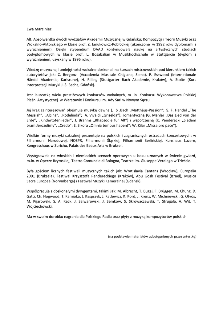 Ewa Marciniec Alt. Absolwentka dwóch wydziałów Akademii Muzycznej w Gdańsku: Kompozycji i Teorii Muzyki oraz Wokalno-Aktorskiego w klasie prof. Z. Janukowicz-Pobłockiej (ukończone w 1992 roku dyplomami z wyróżnieniem). Dzięki stypendium DAAD kontynuowała naukę na artystycznych studiach podyplomowych w klasie prof. L. Bosabalian w Musikhochschule w Stuttgarcie (dyplom z wyróżnieniem, uzyskany w 1996 roku). Wiedzę muzyczną i umiejętności wokalne doskonali na kursach mistrzowskich pod kierunkiem takich autorytetów jak: C. Bergonzi (Accademia Musicale Chigiana, Siena), P. Esswood (Internationale Händel Akademie, Karlsruhe), H. Rilling (Stuttgarter Bach Akademie, Kraków), A. Stolte (Kurs Interpretacji Muzyki J. S. Bacha, Gdańsk). Jest laureatką wielu prestiżowych konkursów wokalnych, m. in. Konkursu Wykonawstwa Polskiej Pieśni Artystycznej w Warszawie i Konkursu im. Ady Sari w Nowym Sączu. Jej krąg zainteresowań obejmuje muzykę dawną (J. S .Bach „Matthäus-Passion”; G. F. Händel „The Messiah”, „Alcina”, „Rodelinda”; A. Vivaldi „Griselda”), romantyczną (G. Mahler „Das Lied von der Erde”, „Kindertotenlieder”; J. Brahms „Rhapsodie für Alt”) i współczesną (K. Penderecki „Siedem bram Jerozolimy”, „Credo”; E. Sikora „Omnia tempus habent”; W. Kilar „Missa pro pace”). Wielkie formy muzyki sakralnej prezentuje na polskich i zagranicznych estradach koncertowych: w Filharmonii Narodowej, NOSPR, Filharmonii Śląskiej, Filharmonii Berlińskiej, Kunshaus Luzern, Kongresshaus w Zurichu, Palais des Beaux Arts w Brukseli. Występowała na włoskich i niemieckich scenach operowych u boku uznanych w świecie gwiazd, m.in. w Operze Rzymskiej, Teatro Comunale di Bologna, Teatrze im. Giuseppe Verdiego w Trieście. Była gościem licznych festiwali muzycznych takich jak: Wratislavia Cantans (Wrocław), Europalia 2001 (Bruksela), Festiwal Krzysztofa Pendereckiego (Kraków), Abu Gosh Festival (Izrael), Musica Sacra Europea (Norymberga) i Festiwal Muzyki Kameralnej (Gdańsk). Współpracuje z doskonałymi dyrygentami, takimi jak: M. Albrecht, T. Bugaj, F. Brüggen, M. Chung, D. Gatti, Ch. Hogwood, T. Kamioka, J. Kaspszyk, J. Katlewicz, K. Kord, J. Krenz, W. Michniewski, G. Ötvös, M. Pijarowski, S. A. Reck, J. Salwarowski, J. Semkow, S. Skrowaczewski, T. Strugała, A. Wit, T. Wojciechowski. Ma w swoim dorobku nagrania dla Polskiego Radia oraz płyty z muzyką kompozytorów polskich. (na podstawie materiałów udostępnionych przez artystkę)
