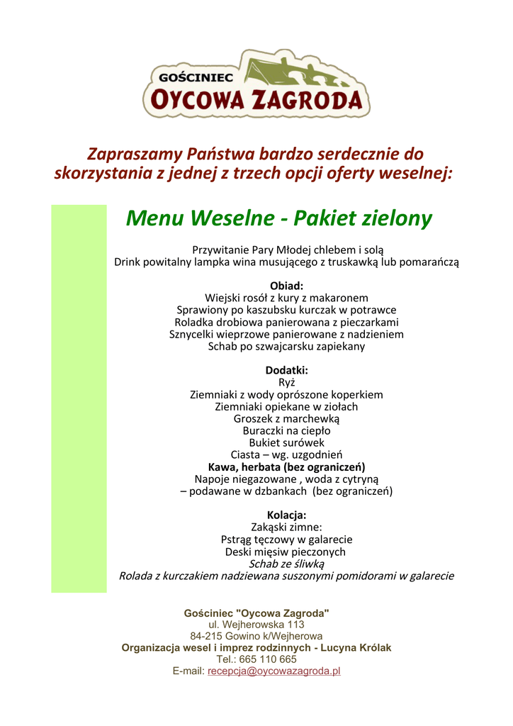 Zapraszamy Państwa bardzo serdecznie do skorzystania z jednej z trzech opcji oferty weselnej: Menu Weselne - Pakiet zielony Przywitanie Pary Młodej chlebem i solą Drink powitalny lampka wina musującego z truskawką lub pomarańczą Obiad: Wiejski rosół z kury z makaronem Sprawiony po kaszubsku kurczak w potrawce Roladka drobiowa panierowana z pieczarkami Sznycelki wieprzowe panierowane z nadzieniem Schab po szwajcarsku zapiekany Dodatki: Ryż Ziemniaki z wody oprószone koperkiem Ziemniaki opiekane w ziołach Groszek z marchewką Buraczki na ciepło Bukiet surówek Ciasta – wg. uzgodnień Kawa, herbata (bez ograniczeń) Napoje niegazowane , woda z cytryną – podawane w dzbankach (bez ograniczeń) Kolacja: Zakąski zimne: Pstrąg tęczowy w galarecie Deski mięsiw pieczonych Schab ze śliwką Rolada z kurczakiem nadziewana suszonymi pomidorami w galarecie Gościniec "Oycowa Zagroda" ul. Wejherowska 113 84-215 Gowino k/Wejherowa Organizacja wesel i imprez rodzinnych - Lucyna Królak Tel.: 665 110 665 E-mail: [email protected] Schab karkowy pieczony w ziołach Rolada z indyka z nadzieniem paprykowym Rolada z boczku z czosnkiem Śledź w oliwie z cebulką i ogórkiem Tradycyjna sałatka jarzynowa Marynaty Kosze wiejskiego pieczywa – własnego wypieku, masło Kawa, herbata (bez ograniczenia) Godz. 20:00 – 21:00 na ciepło: Kaczka pieczona w pomarańczach Pulpeciki w sosie grzybowym Medialony drobiowe Godz. 22:00 – 23:00 UDZIEC WIEPRZOWY PIECZONY W CAŁOŚCI W SOSIE WŁASNYM Z KAPUCHĄ ZASMAŻANĄ lub INDYK PIECOZNY W CAŁOŚCI Z SOSEM ŻURAWINOYMserwowany przez kucharzy Godz. 1:00 – 2:00 Barszcz czerwony z pasztecikiem Menu Weselne - Pakiet srebrny Przywitanie Pary Młodej chlebem i solą Drink powitalny lampka wina musującego z truskawką lub pomarańczą Obiad : Rosół wiejski z makaronem lub delikatna zupa grzybowa z natką pietruszki Sprawiony po kaszubsku kurczak w potrawce Polędwica wieprzowa w sosie kurkowym Drobiowa kieszonka z pomidorem i mozarellą Bitki wołowe w sosie własnym Dodatki : Ryż kolorowy Ziemniaki z wody oprószone koperkiem Ziemniaki opiekane ziołami Fasolka szparagowa Sałatka z buraczków Bukiet surówek Gościniec "Oycowa Zagroda" ul. Wejherowska 113 84-215 Gowino k/Wejherowa Organizacja wesel i imprez rodzinnych - Lucyna Królak Tel.: 665 110 665 E-mail: [email protected] Deser : Lody kolorowe z sosem malinowym lub truskawkowym Ciasta – wg. uzgodnień Kawa, herbata (bez ograniczeń) Napoje niegazowane , woda z cytryną – podawane w dzbankach (bez ograniczeń) Kolacja: Zakąski zimne: Roladka z soli nadziewana szpinakiem w galarecie Śledź w sosie tatarskim Deski mięsiw pieczonych i wędlin Schab pieczony z śliwką Rolada z indyka nadziewana w galarecie Rolada ze schabu z pasztetem w galarecie Rolada z boczku z czosnkiem Pomidorki nadziewane serem kozim i Pesto bazyliowym Tymbalijki drobiowe Różyczki z łososia marynowanego na chrupiącej grzance Sałatka jarzynowa z mozarellą Kosze pieczywa własnego wypieku Smarowidła Marynaty Kawa, herbata (bez ograniczenia) Godz: 20.30 Żur wiejski na białej kiełbasie Godz. 21:00 Na ciepło : Kaczka pieczona w pomarańczach Pałki drobiowe w sosie cygańskim Godz. 22:00 – 23:00 1. PŁONĄCY UDZIEC WIEPRZOWY - z kapusta zasmażaną 2. lub INDYK PIECZONY W CAŁOŚCI - z sosem żurawinowym 3. lub ŁOSOŚ KRÓLEWSKI - łosoś na ciepło faszerowany warzywami - serwowany przez kucharzy Godz. 1:00-2:00 Barszcz czerwony czysty Wiejski bigos Gościniec "Oycowa Zagroda" ul. Wejherowska 113 84-215 Gowino k/Wejherowa Organizacja wesel i imprez rodzinnych - Lucyna Królak Tel.: 665 110 665 E-mail: [email protected] Menu Weselne - Pakiet złoty Przywitanie Pary Młodej chlebem i solą Drink powitalny lampka wina musującego z truskawką lub pomarańczą Obiad: Bulion wołowy z paskami naleśnika lub Krem z borowików z grzankami Zrazy wołowe babuni w sosie własnym Polędwiczki wieprzowe przekładane szpinakiem Pieczeń z indyka w sosie śmietankowym Roladki drobiowe panierowane Łosoś na kolorowym ryżu Dodatki: Kolorowy ryż Ziemniaki z wody oprószone koperkiem Ziemniaki opiekane w ziołach Kasza gryczana Buraczki na ciepło Warzywa blanszowane z migdałami Marchewka na miodzie Bukiet surówek Deser : Lody kolorowe z musem malinowym lub Mus jogurtowy z wiśniami Kawa, herbata – ( bez ograniczenia ) Napoje niegazowane , woda z cytryną – podawane w dzbankach ( bez ograniczeń) Ciasta – w cenie Kolacja: Zakąski zimne : Indyk w maladze Galantynki cielęce Pasztet z dziczyzny z marynowanymi grzybkami Pstrąg tęczowy w galarecie Deski mięsiw pieczonych , wędlin i serów : Schab nadziewany śliwką Rolada z boczku z czosnkiem Schab karkowy pieczony w ziołach Gościniec "Oycowa Zagroda" ul. Wejherowska 113 84-215 Gowino k/Wejherowa Organizacja wesel i imprez rodzinnych - Lucyna Królak Tel.: 665 110 665 E-mail: [email protected] Trio śledziowe Łosoś w koprze Sałatka gyros z kurczakiem Sałatka jarzynowa z jajkami faszerowanymi Kosze wiejskiego pieczywa własnego wypieku Smarowidła Marynaty Kolacja II: Na ciepło : Kaczka pieczona w pomarańczach Papryczki faszerowane cielęciną i przetartymi pomidorami Kolorowe szaszłyki Kawa, herbata (bez ograniczenia ) Godz. 22:00 – 23:00 1. PŁONĄCY UDZIEC WIEPRZOWY - z sosem własnym i kapustą zasmażaną 2. lub INDYK PIECZONY W CAŁOŚCI - z sosem żurawinowym 3. lub ŁOSOŚ KRÓLEWSKI -łosoś na ciepło faszerowany warzywami lub 4. DZIK PIECZONY , serwowany przez kucharzy - za dopłatą godz. 1:00-2:00 Zupa - bogracz lub Barszcz czerwony z pasztecikiem lub Flaczki wołowe W miesiącach od października do marca (włącznie) udzielamy 10 % rabatu na organizację wesela. Nasze doświadczenie z pewnością przełoży się na Państwa satysfakcję i zadowolenie, zapraszamy do kontaktu i korzystania z naszych usług. Koszty organizacji WESELA rozpoczynaj si od 199 z i ustalane s indywidualne. Gościniec "Oycowa Zagroda" ul. Wejherowska 113 84-215 G