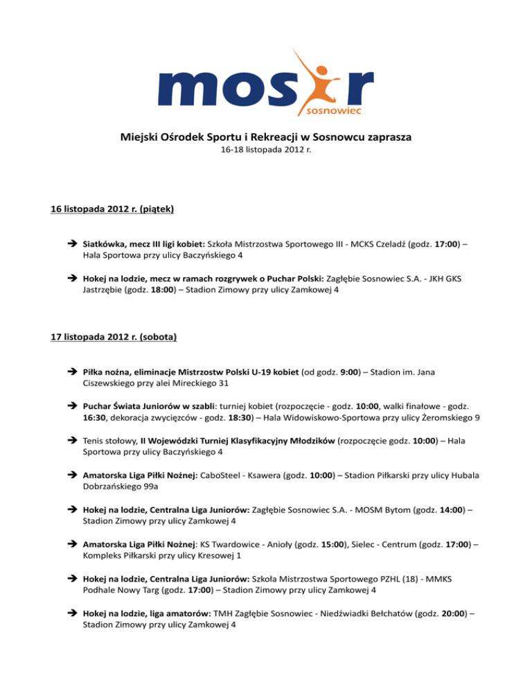 Miejski Ośrodek Sportu i Rekreacji w Sosnowcu zaprasza 16-18 listopada 2012 r. 16 listopada 2012 r. (piątek) ➔ Siatkówka, mecz III ligi kobiet: Szkoła Mistrzostwa Sportowego III - MCKS Czeladź (godz. 17:00) – Hala Sportowa przy ulicy Baczyńskiego 4 ➔ Hokej na lodzie, mecz w ramach rozgrywek o Puchar Polski: Zagłębie Sosnowiec S.A. - JKH GKS Jastrzębie (godz. 18:00) – Stadion Zimowy przy ulicy Zamkowej 4 17 listopada 2012 r. (sobota) ➔ Piłka nożna, eliminacje Mistrzostw Polski U-19 kobiet (od godz. 9:00) – Stadion im. Jana Ciszewskiego przy alei Mireckiego 31 ➔ Puchar Świata Juniorów w szabli: turniej kobiet (rozpoczęcie - godz. 10:00, walki finałowe - godz. 16:30, dekoracja zwycięzców - godz. 18:30) – Hala Widowiskowo-Sportowa przy ulicy Żeromskiego 9 ➔ Tenis stołowy, II Wojewódzki Turniej Klasyfikacyjny Młodzików (rozpoczęcie godz. 10:00) – Hala Sportowa przy ulicy Baczyńskiego 4 ➔ Amatorska Liga Piłki Nożnej: CaboSteel - Ksawera (godz. 10:00) – Stadion Piłkarski przy ulicy Hubala Dobrzańskiego 99a ➔ Hokej na lodzie, Centralna Liga Juniorów: Zagłębie Sosnowiec S.A. - MOSM Bytom (godz. 14:00) – Stadion Zimowy przy ulicy Zamkowej 4 ➔ Amatorska Liga Piłki Nożnej: KS Twardowice - Anioły (godz. 15:00), Sielec - Centrum (godz. 17:00) – Kompleks Piłkarski przy ulicy Kresowej 1 ➔ Hokej na lodzie, Centralna Liga Juniorów: Szkoła Mistrzostwa Sportowego PZHL (18) - MMKS Podhale Nowy Targ (godz. 17:00) – Stadion Zimowy przy ulicy Zamkowej 4 ➔ Hokej na lodzie, liga amatorów: TMH Zagłębie Sosnowiec - Niedźwiadki Bełchatów (godz. 20:00) – Stadion Zimowy przy ulicy Zamkowej 4 18 listopada 2012 r. (niedziela) ➔ Amatorska Liga Piłki Nożnej: Dąbrovia - Pogoń (godz. 8:30), Dynamo - Politechnika (godz. 10:30), Majnardi - Lechia (godz. 12:30) – Stadion im. Jana Ciszewskiego przy alei Mireckiego 31 ➔ Puchar Świata Juniorów w szabli: turniej mężczyzn (rozpoczęcie - godz. 10:00, walki finałowe godz. 16:30, dekoracja zwycięzców - godz. 18:30) – Hala Widowiskowo-Sportowa przy ulicy Żeromskiego 9 ➔ Tenis stołowy, II Wojewódzki Turniej Klasyfikacyjny Kadetów (rozpoczęcie godz. 10:00) – Hala Sportowa przy ulicy Baczyńskiego 4 ➔ Piłka nożna, mecz drużyn rocznika 1995: Zagłębie S.A. Sosnowiec - Śląsk Świętochłowice (godz. 10:00) – Kompleks Piłkarski przy ulicy Kresowej 1 ➔ Hokej na lodzie, Centralna Liga Juniorów: Zagłębie Sosnowiec S.A. - MOSM Bytom (godz. 14:00) – Stadion Zimowy przy ulicy Zamkowej 4 ➔ Amatorska Liga Piłki Nożnej: Kanonierzy - Pompa (godz. 15:00) – Kompleks Piłkarski przy ulicy Kresowej 1 ➔ Hokej na lodzie, Centralna Liga Juniorów: Szkoła Mistrzostwa Sportowego PZHL (18) - MMKS Podhale Nowy Targ (godz. 17:00) – Stadion Zimowy przy ulicy Zamkowej 4
