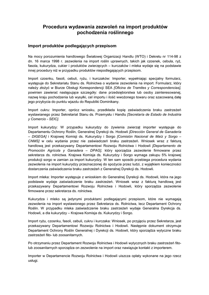 Procedura wydawania zezwoleń na import produktów pochodzenia roślinnego Import produktów podlegających przepisom Na mocy porozumienia handlowego Światowej Organizacji Handlu (WTO) i Dekretu nr 114-98 z dn. 16 marca 1998 r. zezwolenia na import roślin uprawnych, takich jak czosnek, cebula, ryŜ, fasola, kukurydza, cukier i produktów zwierzęcych – kurczaków i mleka wydaje się na podstawie innej procedury niŜ w przypadku produktów niepodlegających przepisom. Import czosnku, fasoli, cebuli, ryŜu, i kurczaków: Importer, wypełniając specjalny formularz, występuje do Sekretariatu Stanu ds. Rolnictwa o wydanie zezwolenia na import. Formularz, który naleŜy złoŜyć w Biurze Obsługi Korespondencji SEA [Oficina de Tramites y Correspondencias], powinien zawierać następujące szczegóły: dane przedsiębiorstwa lub osoby zainteresowanej, nazwę kraju pochodzenia lub wysyłki, cel importu i ilość wwoŜonego towaru oraz szacowaną datę jego przybycia do punktu wjazdu do Republiki Dominikany. Import cukru: Importer, oprócz wniosku, przedkłada kopię zaświadczenia braku zastrzeŜeń wystawianego przez Sekretariat Stanu ds. Przemysłu i Handlu [Secretaría de Estado de Industria y Comercio - SEIC]. Import kukurydzy: W przypadku kukurydzy do Ŝywienia zwierząt importer występuje do Departamentu Ochrony Roślin, Generalnej Dyrekcji ds. Hodowli [Dirección General de Ganadería – DIGEGA] i Krajowej Komisji ds. Kukurydzy i Sorgo [Comisión Nacional de Maíz y Sorgo – CNMS] w celu wydania przez nie zaświadczeń braku zastrzeŜeń. Wniosek wraz z fakturą handlową jest przekazywany Departamentowi Rozwoju Rolnictwa i Hodowli [Departamento de Promoción Agrícola y Ganadera – DPAG], który sporządza zezwolenie firmowane przez sekretarza ds. rolnictwa. Krajowa Komisja ds. Kukurydzy i Sorgo wymaga zakupu 5% krajowej produkcji sorgo w zamian za import kukurydzy. W ten sam sposób przebiega procedura wydania zezwolenia na import kukurydzy przeznaczonej do spoŜycia przez ludzi, z wyjątkiem konieczności dostarczenia zaświadczenia braku zastrzeŜeń z Generalnej Dyrekcji ds. Hodowli. Import mleka: Importer występuje z wnioskiem do Generalnej Dyrekcji ds. Hodowli, która na jego podstawie wydaje zaświadczenie braku zastrzeŜeń. Wniosek wraz z fakturą handlową jest przekazywany Departamentowi Rozwoju Rolnictwa i Hodowli, który sporządza zezwolenie firmowane przez sekretarza ds. rolnictwa. Kukurydza i mleko są jedynymi produktami podlegającymi przepisom, które nie wymagają zezwolenia na import wystawionego przez Sekretarza ds. Rolnictwa, lecz Departament Ochrony Roślin. W przypadku mleka zaświadczenie braku zastrzeŜeń wydaje Generalna Dyrekcja ds. Hodowli, a dla kukurydzy – Krajowa Komisja ds. Kukurydzy i Sorgo. Import ryŜu, czosnku, fasoli, cebuli, cukru i kurczaka: Wniosek, po przyjęciu przez Sekretarza, jest przekazywany Departamentowi Rozwoju Rolnictwa i Hodowli. Następnie dokument otrzymuje Departament Ochrony Roślin Generalnej i Dyrekcji ds. Hodowli, który sporządza wytyczne braku zastrzeŜeń fito- lub zoosanitarnych. Po otrzymaniu przez Departament Rozwoju Rolnictwa i Hodowli wytycznych braku zastrzeŜeń fitolub zoosanitarnych sporządza on zezwolenie na import oraz nawiązuje kontakt z importerem. Importer w Departamencie Rozwoju Rolnictwa i Hodowli uiszcza opłaty wykonane na jego rzecz usługi. Import towarów niepodlegających przepisom Grupę towarów niepodlegających przepisom tworzą produkty i półprodukty pochodzenia roślinnego lub zwierzęcego, których importu nie regulują porozumienia zawarte w ramach współpracy ze Światową Organizacją Handlu. 1. Procedura uzyskania zezwolenia na import produktów i półproduktów pochodzenia roślinnego: • Podmiot zainteresowany występuje pisemnie do Departamentu Ochrony Roślin o zaświadczenie braku zastrzeŜeń, wskazując we wniosku ilość importowanego towaru i jego kraj pochodzenia. Następnie podmiot zainteresowany przesyła zaświadczenie braku zastrzeŜeń wraz z fakturą handlową lub fakturą pro forma Departamentowi Rozwoju Rolnictwa i Hodowli, który sporządza zezwolenie firmowane przez sekretarza ds. rolnictwa. • Nasiona: Podmiot zainteresowany występuje pisemnie o wydanie zaświadczeń braku zastrzeŜeń w pierwszej kolejności do Departamentu Ochrony Roślin, a po jego otrzymaniu równieŜ do Departamentu Nasiennictwa [Departamento de Semillas – DS]. Następnie podmiot zainteresowany przesyła zaświadczenia braku zastrzeŜeń wraz z fakturą handlową Departamentowi Rozwoju Rolnictwa i Hodowli, który sporządza zezwolenie firmowane przez sekretarza ds. rolnictwa. • Rośliny i kwiaty: Podmiot zainteresowany występuje pisemnie do Departamentu Dzikiej Przyrody i Departamentu Ochrony Roślin o wydanie zaświadczenia braku zastrzeŜeń. Następnie podmiot zainteresowany przesyła zaświadczenie braku zastrzeŜeń wraz z fakturą handlową Departamentowi Rozwoju Rolnictwa i Hodowli, który sporządza zezwolenie firmowane przez sekretarza ds. rolnictwa. • Nawozy i surowce do ich produkcji: Wymagają zaświadczenia o braku zastrzeŜeń wydanego przez Departament ds. Gleb i Wód [Departamento de Tierras y Aguas – DTA]. Następnie podmiot zainteresowany przesyła zaświadczenie braku zastrzeŜeń wraz z fakturą handlową Departamentowi Rozwoju Rolnictwa i Hodowli, który sporządza zezwolenie firmowane przez sekretarza ds. rolnictwa. 2. Produkty i półprodukty pochodzenia zwierzęcego: Wymagają zaświadczenia braku zastrzeŜeń wydanego przez Dyrekcję Generalną ds. Zdrowia Zwierząt [Dirección General de Sanidad Animal – DIGESA]. Podmiot zainteresowany, po otrzymaniu zaświadczenia, przesyła je wraz z fakturą handlową Departamentowi Rozwoju Rolnictwa i Hodowli, który sporządza zezwolenie firmowane przez sekretarza ds. rolnictwa. • Produkty pochodzenia roślinnego przeznaczone do Ŝywienia zwierząt, takie jak mąka sojowa i lucerna: Wymagają zaświ