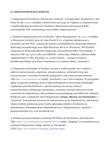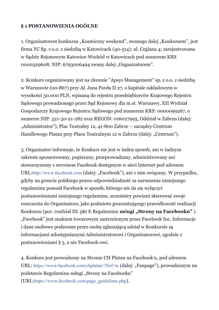 § 1 POSTANOWIENIA OGÓLNE 1. Organizatorem konkursu „Kosmiczny weekend”, zwanego dalej „Konkursem”, jest firma YC Sp. z o.o. z siedzibą w Katowicach (40-514); ul. Ceglana 4; zarejestrowana w Sądzie Rejonowym Katowice-Wschód w Katowicach pod numerem KRS 0000329608; NIP: 6793006494 zwany dalej „Organizatorem”. 2. Konkurs organizowany jest na zlecenie ''Apsys Management'' sp. z o.o. z siedzibą w Warszawie (00-867) przy Al. Jana Pawła II 27, o kapitale zakładowym w wysokości 50.000 PLN, wpisaną do rejestru przedsiębiorców Krajowego Rejestru Sądowego prowadzonego przez Sąd Rejonowy dla m.st. Warszawy, XII Wydział Gospodarczy Krajowego Rejestru Sądowego pod numerem KRS: 0000099267, o numerze NIP: 521-30-21-282 oraz REGON: 016027995, Oddział w Zabrzu (dalej: „Administrator”), Plac Teatralny 12, 41-800 Zabrze – zarządcy Centrum Handlowego Platan przy Placu Teatralnym 12 w Zabrzu (dalej: „Centrum”). 3. Organizator informuje, że Konkurs nie jest w żaden sposób, ani w żadnym zakresie sponsorowany, popierany, przeprowadzany, administrowany ani stowarzyszony z serwisem Facebook dostępnym w sieci Internet pod adresem URL:http://www.facebook.com (dalej: „Facebook”), ani z nim związany. W przypadku, gdyby na gruncie polskiego prawa odpowiedzialność za naruszenia niniejszego regulaminu ponosił Facebook w sposób, którego nie da się wyłączyć postanowieniami niniejszego regulaminu, uczestnicy powinni skierować swoje roszczenia do Organizatora, jako podmiotu gwarantującego prawidłowość realizacji Konkursu (por. rozdział III. pkt E Regulaminu usługi „Strony na Facebooku” ). „Facebook” jest znakiem towarowym zastrzeżonym przez Facebook Inc. Informacje i dane osobowe podawane przez osobę zgłaszającą udział w Konkursie są informacjami udostępnianymi Administratorowi i Organizatorowi, zgodnie z postanowieniami § 5, a nie Facebook-owi. 4. Konkurs jest prowadzony na Stronie CH Platan na Facebook’u, pod adresem URL: https://www.facebook.com/chplatan/?fref=ts (dalej: „Fanpage”), prowadzonym na podstawie Regulaminu usługi „Strony na Facebooku” (URL:https://www.facebook.com/page_guidelines.php). 5. Konkurs organizowany jest na terenie Rzeczypospolitej Polskiej. 6. Konkurs odbywać się będzie zgodnie z niniejszym Regulaminem („Regulamin”) i przepisami prawa polskiego. § 2 UCZESTNICY 1. Udział w Konkursie jest bezpłatny i dobrowolny. 2. Uczestnikiem Konkursu (dalej: „Uczestnik”) – z zastrzeżeniem postanowień ust. 3 i 4 poniżej – może być osoba fizyczna, która: a) jest fanem profilu CH Platan na Facebook'u b) ukończyła 13 rok życia; c) posiada przynajmniej ograniczoną zdolność do czynności prawnych; d) posiada dokument ze zdjęciem potwierdzający tożsamość; e) spełni warunki, o których mowa w § 3 ust. 2. 3. Osoba posiadająca ograniczoną zdolność do czynności prawnych może brać udział w Konkursie wyłącznie za zgodą przedstawiciela ustawowego, która powinna obejmować również zgodę na przetwarzanie danych osobowych. 4. W Konkursie nie mogą brać udziału pracownicy, współpracownicy lub przedstawiciele Organizatora, Administratora oraz innych podmiotów biorących bezpośredni udział w przygotowaniu i przeprowadzeniu Konkursu, ani członkowie ich rodzin. Przez członków rodziny rozumie się na potrzeby Konkursu: wstępnych, zstępnych, rodzeństwo, małżonków, rodziców współmałżonka oraz osoby pozostające w stosunku przysposobienia, zaś za pracowników uważa się: wszelkie osoby wykonujące pracę lub inne powtarzające się czynności na rzecz podmiotów wymienionych powyżej niezależnie od podstawy na jakiej ta współpraca jest wykonywana. 5. Organizator zastrzega sobie prawo do wykluczenia z udziału w Konkursie Uczestników, których działania są sprzeczne z prawem lub Regulaminem oraz regulaminem Facebooka, w szczególności uczestników, którzy: a) podejmują działania z wykorzystaniem konta/profilu utworzonego niezgodnie z zasadami Facebooka; b) podejmują działania z wykorzystaniem konta/profilu osób trzecich; c) tworzą fikcyjne konta/profile w serwisie Facebook w celu uniknięcia weryfikacji wieku; 6. Celem zapewnienia prawidłowej organizacji i przebiegu Konkursu, a w szczególności w celu dokonania oceny prawidłowości zgłoszeń do Konkursu oraz dokonania wyboru zwycięzców Konkursu, Organizator powoła Komisję Konkursową. W skład Komisji Konkursowej wejdą trzy osoby delegowane przez Organizatora. § 3 CZAS I WARUNKI KONKURSU 1. Konkurs trwa w dniu 30.01.2016r. do 02.02.2016 do godz. 22:00. Ogłoszenie wyników nastąpi do dnia 05.02.2016r. do godz. 16:00. 2. Warunkiem wzięcia udziału w Konkursie przez Uczestnika jest: a) bycie fanem profilu CH Platan w serwisie Facebook.com; b) wykonanie zadania konkursowego, polegającego na wgraniu pod postem konkursowym opublikowanym w dniu 29.01.2016 zdjęcia, przedstawiającego jak bawiliście się podczas eventu Star Wars Infinity w CH Platan w dniach 3031.01.2016r. (dalej „zgłoszenie konkursowe”); c) zapoznanie się z treścią niniejszego Regulaminu i zaakceptowanie go; d) udzielenie zgody i przesłanie Organizatorowi informacji, oświadczeń i danych – zgodnie z postanowieniami w § 5 oraz § 7 ust. 8. § 4 PRAWA AUTORSKIE 1. Wykonywanie zadania konkursowego określonego w § 3 ust. 2 pkt. a - zdjęcia jest równoznaczne z oświadczeniem, że Uczestnik jest wyłącznym twórcą zdjęcia i/lub że Uczestnikowi przysługują do zdjęcia (jako całości) nieograniczone osobiste i majątkowe prawa autorskie i prawa pokrewne, a także, iż nie naruszają one praw autorskich osób trzecich, uprawnień jakiejkolwiek osoby związanych z rozpowszechnianiem jej wizerunku, przepisów Ustawy z dnia 16 kwietnia 1993 r. o zwalczaniu nieuczciwej konkurencji (Dz. U. z 2003r., nr 153, poz. 1503 tj. ze zm.), są wolne od niedozwolonych zapożyczeń oraz nie mają miejsca żadne inne okoliczności, które m