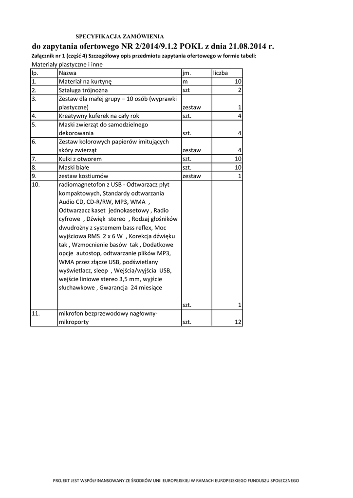 SPECYFIKACJA ZAMÓWIENIA do zapytania ofertowego NR 2/2014/9.1.2 POKL z dnia 21.08.2014 r. Załącznik nr 1 (część 4) Szczegółowy opis przedmiotu zapytania ofertowego w formie tabeli: Materiały plastyczne i inne lp. Nazwa 1. Materiał na kurtynę 2. Sztaluga trójnożna 3. Zestaw dla małej grupy – 10 osób (wyprawki plastyczne) 4. Kreatywny kuferek na cały rok 5. Maski zwierząt do samodzielnego dekorowania 6. Zestaw kolorowych papierów imitujących skóry zwierząt 7. Kulki z otworem 8. Maski białe 9. zestaw kostiumów 10. radiomagnetofon z USB - Odtwarzacz płyt kompaktowych, Standardy odtwarzania Audio CD, CD-R/RW, MP3, WMA , Odtwarzacz kaset jednokasetowy , Radio cyfrowe , Dźwięk stereo , Rodzaj głośników dwudrożny z systemem bass reflex, Moc wyjściowa RMS 2 x 6 W , Korekcja dźwięku tak , Wzmocnienie basów tak , Dodatkowe opcje autostop, odtwarzanie plików MP3, WMA przez złącze USB, podświetlany wyświetlacz, sleep , Wejścia/wyjścia USB, wejście liniowe stereo 3,5 mm, wyjście słuchawkowe , Gwarancja 24 miesiące 11. mikrofon bezprzewodowy nagłownymikroporty jm. m szt liczba 10 2 zestaw szt. 1 4 szt. 4 zestaw szt. szt. zestaw 4 10 10 1 szt. 1 szt. 12 PROJEKT JEST WSPÓŁFINANSOWANY ZE ŚRODKÓW UNII EUROPEJSKIEJ W RAMACH EUROPEJSKIEGO FUNDUSZU SPOŁECZNEGO