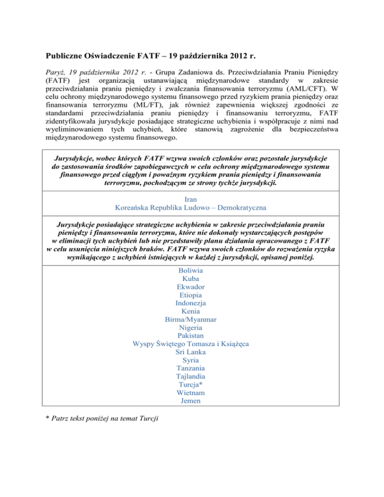Publiczne Oświadczenie FATF – 19 października 2012 r.