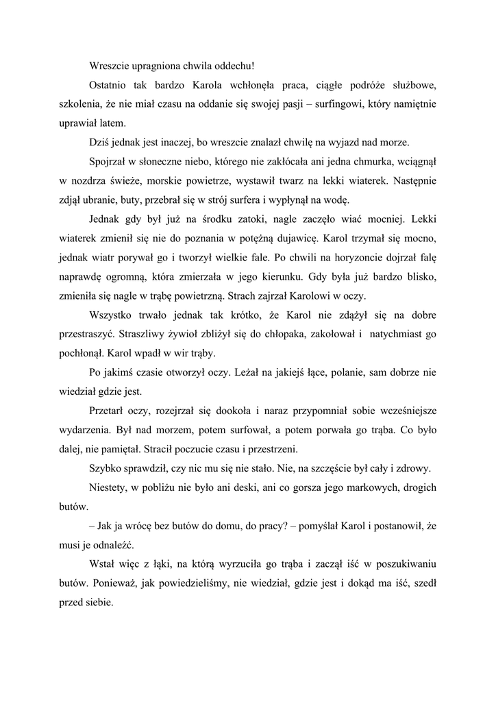 Wreszcie upragniona chwila oddechu! Ostatnio tak bardzo Karola wchłonęła praca, ciągłe podróże służbowe, szkolenia, że nie miał czasu na oddanie się swojej pasji – surfingowi, który namiętnie uprawiał latem. Dziś jednak jest inaczej, bo wreszcie znalazł chwilę na wyjazd nad morze. Spojrzał w słoneczne niebo, którego nie zakłócała ani jedna chmurka, wciągnął w nozdrza świeże, morskie powietrze, wystawił twarz na lekki wiaterek. Następnie zdjął ubranie, buty, przebrał się w strój surfera i wypłynął na wodę. Jednak gdy był już na środku zatoki, nagle zaczęło wiać mocniej. Lekki wiaterek zmienił się nie do poznania w potężną dujawicę. Karol trzymał się mocno, jednak wiatr porywał go i tworzył wielkie fale. Po chwili na horyzoncie dojrzał falę naprawdę ogromną, która zmierzała w jego kierunku. Gdy była już bardzo blisko, zmieniła się nagle w trąbę powietrzną. Strach zajrzał Karolowi w oczy. Wszystko trwało jednak tak krótko, że Karol nie zdążył się na dobre przestraszyć. Straszliwy żywioł zbliżył się do chłopaka, zakołował i natychmiast go pochłonął. Karol wpadł w wir trąby. Po jakimś czasie otworzył oczy. Leżał na jakiejś łące, polanie, sam dobrze nie wiedział gdzie jest. Przetarł oczy, rozejrzał się dookoła i naraz przypomniał sobie wcześniejsze wydarzenia. Był nad morzem, potem surfował, a potem porwała go trąba. Co było dalej, nie pamiętał. Stracił poczucie czasu i przestrzeni. Szybko sprawdził, czy nic mu się nie stało. Nie, na szczęście był cały i zdrowy. Niestety, w pobliżu nie było ani deski, ani co gorsza jego markowych, drogich butów. – Jak ja wrócę bez butów do domu, do pracy? – pomyślał Karol i postanowił, że musi je odnaleźć. Wstał więc z łąki, na którą wyrzuciła go trąba i zaczął iść w poszukiwaniu butów. Ponieważ, jak powiedzieliśmy, nie wiedział, gdzie jest i dokąd ma iść, szedł przed siebie. Szedł tak i szedł z parę godzin. Mijał wioski, miasta, rzeki, jeziora. Naraz krajobraz zaczął się zmieniać. Z płaskich nizin robiły się pagórki, a następnie góry. Nagle przystanął przed jedną z nich i pomyślał, że chyba już tu kiedyś był. Ale nie mógł sobie niczego przypomnieć, więc postanowił się wspiąć na sam szczyt. Kiedy już był na wierzchołku góry, powiedział na głos do samego siebie: – Całkiem podobna do Czantorii... Rzeczywiście góry przypominały te z Beskidu Śląskiego. Nagle nie wiadomo skąd, bo nikogo koło niego przecież nie było, usłyszał głosy ostrzeżenia. „Uważaj, powoli, trzymaj się za rękę mamusi” i tym podobne. Ale, też nie wiadomo dlaczego, postanowił sobie „pobiegać” i wbrew przestrogom, które go zewsząd dopadały, pędem rzucił się w dół zbocza. Rozpędził się, ale nie mógł się zatrzymać. Przewrócił się, zaczął koziołkować. W końcu poobracał się tak z kilka razy i zatrzymał się w jeżynach. Po chwili zjawił się przy nim tata i postawił go wolno na nogi. Żyje, połamał się? Nie, miał tylko klika otarć. Tak jak wtedy, gdy miał sześć lat... Rozejrzał się dookoła. Nigdzie nie było taty, ani przerażonej mamy, ani siostry. Nie słyszał też żadnych głosów. Pomyślał, że mu się jednak wszystko wydawało. Karol był na siebie trochę zły, że zachowuje się jak dziecko, a nie jak na poważnego pracownika Poważnej Firmy przystało. – Co ja najlepszego wyrabiam? Przecież międzynarodowymi projektami się zajmuję!!! – karcił sam siebie. Z drugiej jednak – czuł jakąś niesamowitą frajdę z tego biegania, koziołkowania i poobijanych boków. Jakby się cofnął w czasie...