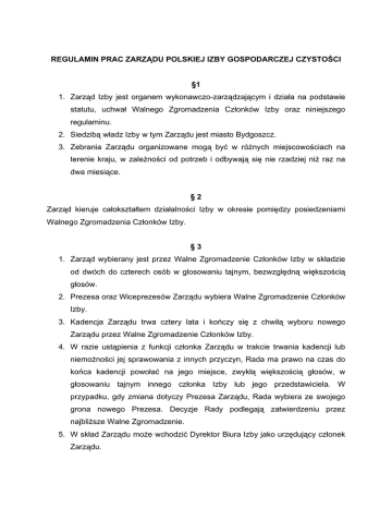 REGULAMIN PRAC ZARZĄDU POLSKIEJ IZBY GOSPODARCZEJ CZYSTOŚCI §1 1. Zarząd Izby jest organem wykonawczo-zarządzającym i działa na podstawie statutu, uchwał Walnego Zgromadzenia Członków Izby oraz niniejszego regulaminu. 2. Siedzibą władz Izby w tym Zarządu jest miasto Bydgoszcz. 3. Zebrania Zarządu organizowane mogą być w różnych miejscowościach na terenie kraju, w zależności od potrzeb i odbywają się nie rzadziej niż raz na dwa miesiące. §2 Zarząd kieruje całokształtem działalności Izby w okresie pomiędzy posiedzeniami Walnego Zgromadzenia Członków Izby. §3 1. Zarząd wybierany jest przez Walne Zgromadzenie Członków Izby w składzie od dwóch do czterech osób w glosowaniu tajnym, bezwzględną większością głosów. 2. Prezesa oraz Wiceprezesów Zarządu wybiera Walne Zgromadzenie Członków Izby. 3. Kadencja Zarządu trwa cztery lata i kończy się z chwilą wyboru nowego Zarządu przez Walne Zgromadzenie Członków Izby. 4. W razie ustąpienia z funkcji członka Zarządu w trakcie trwania kadencji lub niemożności jej sprawowania z innych przyczyn, Rada ma prawo na czas do końca kadencji powołać na jego miejsce, zwykłą większością głosów, w głosowaniu tajnym innego członka Izby lub jego przedstawiciela. W przypadku, gdy zmiana dotyczy Prezesa Zarządu, Rada wybiera ze swojego grona nowego Prezesa. Decyzje Rady podlegają zatwierdzeniu przez najbliższe Walne Zgromadzenie. 5. W skład Zarządu może wchodzić Dyrektor Biura Izby jako urzędujący członek Zarządu. 6. Jeśli praca Zarządu ma charakter odpłatny wówczas Rada Izby określa jego wynagrodzenie oraz Przewodniczący Rady Izby zawiera umowy o pracę z członkami Zarządu. §4 1. Zarząd do prowadzenia swoich spraw zatrudnia pracowników i tworzy biuro, którym kieruje Dyrektor Biura. 2. Umowę o pracę z Dyrektorem Biura zawiera Zarząd reprezentowany przez dwóch jego członków w tym Prezesa. §5 1. Do składania oświadczeń woli w imieniu Izby wymagane jest współdziałanie dwóch członków Zarządu lub umocowanego przez Zarząd pełnomocnika. 2. Dla ważności innych pism i dokumentów wymagany jest podpis Prezesa lub innego członka Zarządu bądź upoważnionego do tego pracownika biura. 3. W trybie określonym w ust. 1 zaciąga się również zobowiązania w zakresie praw i obowiązków majątkowych Izby nieprzekraczających wartości 100 tysięcy złotych. 4. W odniesieniu do zobowiązań równych bądź przekraczających wartość 100 tysięcy złotych wymagana jest decyzja Rady Izby zatwierdzająca działania Zarządu. 5. Jeśli Rada Izby nie zatwierdzi działań Zarządu określonych w ust. 4, Zarządowi przysługuje prawo odwołania się do Walnego Zgromadzenia Członków Izby. §6 1. Zarząd używa podłużnej pieczęci z określeniem nazwy i siedziby Izby. 2. Członkowie pełniący funkcje w Zarządzie posługują się pieczątkami imiennymi: prezes, wiceprezes, członek Zarządu i inne określone przez Zarząd. §7 1. Do zadań Zarządu należy: a) wykonywanie uchwał Walne Zgromadzenie Członków Izby; b) występowanie z inicjatywą uchwałodawczą oraz opracowywanie projektów uchwał i innych aktów normatywnych w tym regulaminów; c) opracowywanie i przedstawianie Walnemu Zgromadzeniu Członków Izby sprawozdania ze swojej działalności po zakończeniu roku obrachunkowego; d) prowadzenie spraw związanych z bieżącą działalnością Izby w zakresie zwykłego zarządu; e) realizacja programu i celów Izby; f) określanie szczegółowych kierunków działania Izby; g) opracowywanie preliminarza budżetowego do uchwalenia przez Walne Zgromadzenie Członków Izby; h) podejmowanie uchwał w sprawach nabycia lub zbycia majątku nieruchomego i ruchomego; i) organizowanie i prowadzenie działalności gospodarczej; j) występowanie z wnioskami do Walnego Zgromadzenia Członków Izby w sprawie ustalenia wysokości wpisowego i składek członkowskich; k) zawieranie porozumień o współpracy z organami administracji państwowej i władzami naczelnymi innych organizacji; l) powoływanie na okres swojej kadencji specjalistów z danej dziedziny, zespołów problemowych oraz określenie ich zadań; m) zarządzanie majątkiem i sprawami Izby oraz spełnianie swoich obowiązków ze starannością wymaganą w obrocie gospodarczo finansowym, przy ścisłym przestrzeganiu przepisów prawa oraz postanowień statutu, uchwał Walnego Zgromadzenia Członków Izby i regulaminów; n) wykonywanie zaleceń pokontrolnych organu przeprowadzającego kontrolę; o) udzielanie kontrolującym oraz Walnemu Zgromadzeniu Członków Izby wyczerpujących wyjaśnień wraz z przedstawieniem wszelkich dokumentów i innych materiałów dotyczących przedmiotu kontroli Izby; p) sporządzanie/opracowywanie pisemnych sprawozdań z działalności Izby za okres sprawozdawczy Zgromadzeniu Członków Izby; i składanie ich na Walnemu q) zawieranie umów z RAI Amsterdam oraz nadzór nad ich prawidłową realizacją; r) nadzór nad wydawaniem „Forum Czystości”; s) przedkładanie corocznie Walnemu Zgromadzeniu Członków Izby do rozpatrzenia i zatwierdzenia planu finansowo - ekonomicznego oraz programu działalności gospodarczej Izby; t) realizowanie innych czynności wynikających zez statutu. §8 1. Do kompetencji Zarządu należy w szczególności: A. w sprawach członkowskich: a) przyjmowanie członków Izby na zasadach określonych w statucie; - wzór deklaracji członkowskiej stanowi załącznik nr 1 niniejszego regulaminu; b) przyjmowanie oświadczeń członków o wystąpieniu z Izby; c) składanie informacji Walnemu Zgromadzeniu Członków Izby o wykreśleniu członków z Izby lub podjęciu uchwały o pozbawieniu członkostwa w Izbie w oparciu o postanowienia § 9 ust. 3 i 4 statutu Izby; d) występowanie do Walnego Zgromadzenia Członków Izby z wnioskiem we wszystkich innych sprawach członków Izby. B. w sprawie Walnego Zgromadzenia Członków Izby: a) zwoływanie Walnych Zgromadzeń C