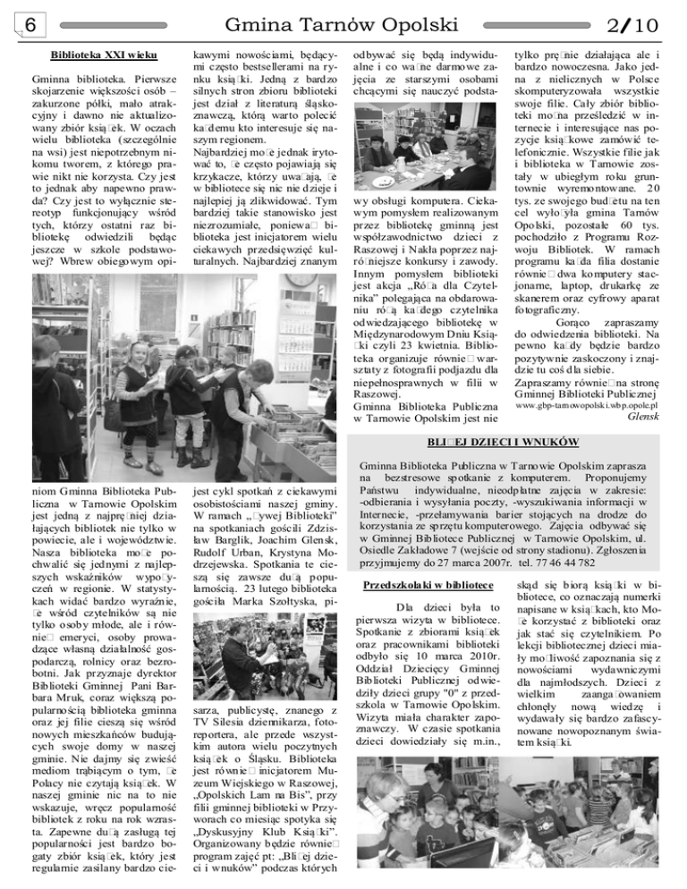 Gmina Tarnow Opolski 6 Biblioteka XXI wieku Gminna biblioteka. Pierwsze skojarzenie większości osób – zakurzone półki, mało atrakcyjny i dawno nie aktualizowany zbiór książek. W oczach wielu biblioteka (szczególnie na wsi) jest niepotrzebnym nikomu tworem, z którego prawie nikt nie korzysta. Czy jest to jednak aby napewno prawda? Czy jest to wyłącznie stereotyp funkcjonujący wśród tych, którzy ostatni raz bibliotekę odwiedzili będąc jeszcze w szkole podstawowej? Wbrew obiegowym opi- kawymi nowościami, będącymi często bestsellerami na rynku książki. Jedną z bardzo silnych stron zbioru biblioteki jest dział z literaturą śląskoznawczą, którą warto polecić każdemu kto interesuje się naszym regionem. Najbardziej może jednak irytować to, że często pojawiają się krzykacze, którzy uważają, że w bibliotece się nic nie dzieje i najlepiej ją zlikwidować. Tym bardziej takie stanowisko jest niezrozumiałe, ponieważ biblioteka jest inicjatorem wielu ciekawych przedsięwzięć kulturalnych. Najbardziej znanym odbywać alne i co jęcia ze chcącymi się będą indywiduważne darmowe zastarszymi osobami się nauczyć podsta- wy obsługi komputera. Ciekawym pomysłem realizowanym przez bibliotekę gminną jest współzawodnictwo dzieci z Raszowej i Nakła poprzez najróżniejsze konkursy i zawody. Innym pomysłem biblioteki jest akcja „Róża dla Czytelnika” polegająca na obdarowaniu różą każdego czytelnika odwiedzającego bibliotekę w Międzynarodowym Dniu Książki czyli 23 kwietnia. Biblioteka organizuje również warsztaty z fotografii podjazdu dla niepełnosprawnych w filii w Raszowej. Gminna Biblioteka Publiczna w Tarnowie Opolskim jest nie 2 10 tylko prężnie działająca ale i bardzo nowoczesna. Jako jedna z nielicznych w Polsce skomputeryzowała wszystkie swoje filie. Cały zbiór biblioteki można prześledzić w internecie i interesujące nas pozycje książkowe zamówić telefonicznie. Wszystkie filie jak i biblioteka w Tarnowie zostały w ubiegłym roku gruntownie wyremontowane. 20 tys. ze swojego budżetu na ten cel wyłożyła gmina Tarnów Opolski, pozostałe 60 tys. pochodziło z Programu Rozwoju Bibliotek. W ramach programu każda filia dostanie również dwa komputery stacjonarne, laptop, drukarkę ze skanerem oraz cyfrowy aparat fotograficzny. Gorąco zapraszamy do odwiedzenia biblioteki. Na pewno każdy będzie bardzo pozytywnie zaskoczony i znajdzie tu coś dla siebie. Zapraszamy również na stronę Gminnej Biblioteki Publicznej www.gbp-tarn owopolsk i.wb p.opole.pl Glensk BLIŻEJ DZIECI I WNUKÓW niom Gminna Biblioteka Publiczna w Tarnowie Opolskim jest jedną z najprężniej działających bibliotek nie tylko w powiecie, ale i województwie. Nasza biblioteka może pochwalić się jednymi z najlepszych wskaźników wypożyczeń w regionie. W statystykach widać bardzo wyraźnie, że wśród czytelników są nie tylko osoby młode, ale i również emeryci, osoby prowadzące własną działalność gospodarczą, rolnicy oraz bezrobotni. Jak przyznaje dyrektor Biblioteki Gminnej Pani Barbara Mruk, coraz większą popularnością biblioteka gminna oraz jej filie cieszą się wśród nowych mieszkańców budujących swoje domy w naszej gminie. Nie dajmy się zwieść mediom trąbiącym o tym, że Polacy nie czytają książek. W naszej gminie nic na to nie wskazuje, wręcz popularność bibliotek z roku na rok wzrasta. Zapewne dużą zasługą tej popularności jest bardzo bogaty zbiór książek, który jest regularnie zasilany bardzo cie- jest cykl spotkań z ciekawymi osobistościami naszej gminy. W ramach „Żywej Biblioteki” na spotkaniach gościli Zdzisław Barglik, Joachim Glensk, Rudolf Urban, Krystyna Modrzejewska. Spotkania te cieszą się zawsze dużą popularnością. 23 lutego biblioteka gościła Marka Szołtyska, pi- sarza, publicystę, znanego z TV Silesia dziennikarza, fotoreportera, ale przede wszystkim autora wielu poczytnych książek o Śląsku. Biblioteka jest również inicjatorem Muzeum Wiejskiego w Raszowej, „Opolskich Lam na Bis”, przy filii gminnej biblioteki w Przyworach co miesiąc spotyka się „Dyskusyjny Klub Książki”. Organizowany będzie również program zajęć pt: „Bliżej dzieci i wnuków” podczas których Gminna Biblioteka Publiczna w Tarnowie Opolskim zaprasza na bezstresowe spotkanie z komputerem. Proponujemy Państwu indywidualne, nieodpłatne zajęcia w zakresie: -odbierania i wysyłania poczty, -wyszukiwania informacji w Internecie, -przełamywania barier stojących na drodze do korzystania ze sprzętu komputerowego. Zajęcia odbywać się w Gminnej Bibliotece Publicznej w Tarnowie Opolskim, ul. Osiedle Zakładowe 7 (wejście od strony stadionu). Zgłoszenia przyjmujemy do 27 marca 2007r. tel. 77 46 44 782 Przedszkolaki w bibliotece Dla dzieci była to pierwsza wizyta w bibliotece. Spotkanie z zbiorami książek oraz pracownikami biblioteki odbyło się 10 marca 2010r. Oddział Dziecięcy Gminnej Biblioteki Publicznej odwiedziły dzieci grupy "0" z przedszkola w Tarnowie Opolskim. Wizyta miała charakter zapoznawczy. W czasie spotkania dzieci dowiedziały się m.in., skąd się biorą książki w bibliotece, co oznaczają numerki napisane w książkach, kto Może korzystać z biblioteki oraz jak stać się czytelnikiem. Po lekcji bibliotecznej dzieci miały możliwość zapoznania się z nowościami wydawniczymi dla najmłodszych. Dzieci z wielkim zaangażowaniem chłonęły nową wiedzę i wydawały się bardzo zafascynowane nowopoznanym światem książki.