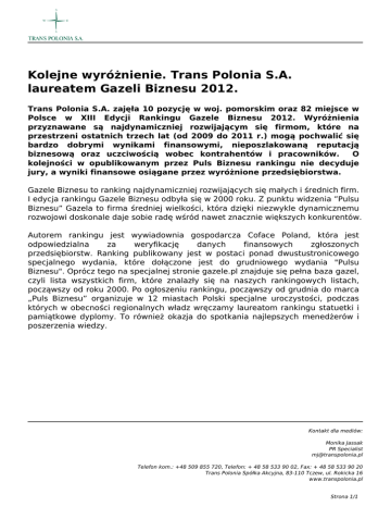 Kolejne wyróżnienie. Trans Polonia S.A. laureatem Gazeli Biznesu 2012. Trans Polonia S.A. zajęła 10 pozycję w woj. pomorskim oraz 82 miejsce w Polsce w XIII Edycji Rankingu Gazele Biznesu 2012. Wyróżnienia przyznawane są najdynamiczniej rozwijającym się firmom, które na przestrzeni ostatnich trzech lat (od 2009 do 2011 r.) mogą pochwalić się bardzo dobrymi wynikami finansowymi, nieposzlakowaną reputacją biznesową oraz uczciwością wobec kontrahentów i pracowników. O kolejności w opublikowanym przez Puls Biznesu rankingu nie decyduje jury, a wyniki finansowe osiągane przez wyróżnione przedsiębiorstwa. Gazele Biznesu to ranking najdynamiczniej rozwijających się małych i średnich firm. I edycja rankingu Gazele Biznesu odbyła się w 2000 roku. Z punktu widzenia ”Pulsu Biznesu” Gazela to firma średniej wielkości, która dzięki niezwykle dynamicznemu rozwojowi doskonale daje sobie radę wśród nawet znacznie większych konkurentów. Autorem rankingu jest wywiadownia gospodarcza Coface Poland, która jest odpowiedzialna za weryfikację danych finansowych zgłoszonych przedsiębiorstw. Ranking publikowany jest w postaci ponad dwustustronicowego specjalnego wydania, które dołączone jest do grudniowego wydania "Pulsu Biznesu". Oprócz tego na specjalnej stronie gazele.pl znajduje się pełna baza gazel, czyli lista wszystkich firm, które znalazły się na naszych rankingowych listach, począwszy od roku 2000. Po ogłoszeniu rankingu, począwszy od grudnia do marca „Puls Biznesu” organizuje w 12 miastach Polski specjalne uroczystości, podczas których w obecności regionalnych władz wręczamy laureatom rankingu statuetki i pamiątkowe dyplomy. To również okazja do spotkania najlepszych menedżerów i poszerzenia wiedzy. Kontakt dla mediów: Monika Jassak PR Specialist [email protected] Telefon kom.: +48 509 855 720, Telefon: + 48 58 533 90 02, Fax: + 48 58 533 90 20 Trans Polonia Spółka Akcyjna, 83-110 Tczew, ul. Rokicka 16 www.transpolonia.pl Strona 1/1 Powered by TCPDF (www.tcpdf.org)