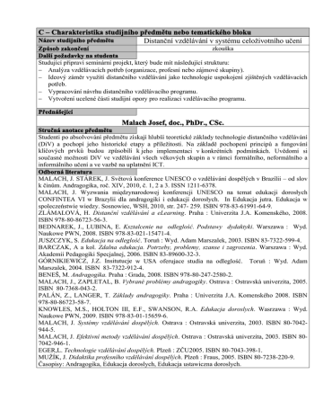 C – Charakteristika studijního předmětu nebo tematického bloku Název studijního předmětu Distanční vzdělávání v systému celoživotního učení zkouška Způsob zakončení Další požadavky na studenta Studující připraví seminární projekt, který bude mít následující strukturu: Analýza vzdělávacích potřeb (organizace, profesní nebo zájmové skupiny). Ideový záměr využití distančního vzdělávání jako technologie uspokojení zjištěných vzdělávacích potřeb. Vypracování návrhu distančního vzdělávacího programu. Vytvoření ucelené části studijní opory pro realizaci vzdělávacího programu. Přednášející Malach Josef, doc., PhDr., CSc. Stručná anotace předmětu Studenti po absolvování předmětu získají hlubší teoretické základy technologie distančního vzdělávání (DiV) a pochopí jeho historické etapy a příležitosti. Na základě pochopení principů a fungování klíčových prvků budou způsobilí k jeho implementaci v konkrétních podmínkách. Uvědomí si současné možnosti DiV ve vzdělávání všech věkových skupin a v rámci formálního, neformálního a informálního učení a ve vazbě na uplatnění ICT. Odborná literatura MALACH, J. STÁREK, J. Světová konference UNESCO o vzdělávání dospělých v Brazílii – od slov k činům. Andragogika, roč. XIV, 2010, č. 1, 2 a 3. ISSN 1211-6378. MALACH, J. Wyzwania międzynarodowej konferencji UNESCO na temat edukacji dorosłych CONFINTEA VI w Brazylii dla andragogiki i edukacji dorosłych. In Edukacja jutra. Edukacja w spoleczeństwie wiedzy. Sosnowiec, WSH, 2010, str. 247- 259. ISBN 978-83-61991-64-9. ZLÁMALOVÁ, H. Distanční vzdělávání a eLearning. Praha : Univerzita J.A. Komenského, 2008. ISBN 978-80-86723-56-3. BEDNAREK, J., LUBINA, E. Ksztalcenie na odleglość. Podstawy dydaktyki. Warszawa : Wyd. Naukowe PWN, 2008. ISBN 978-83-021-15471-4. JUSZCZYK, S. Edukacja na odleglość. Toruń : Wyd. Adam Marszalek, 2003. ISBN 83-7322-599-4. BARCZAK, A a kol. Zdalna edukacja. Potrzeby, problemy, szanse i zagrozenia. Warszawa : Wyd. Akademii Pedagogiki Specjalnej, 2006. ISBN 83-89600-32-3. GÓRNIKIEWICZ, J.Z. Insitutucje w USA oferujace studia na odleglość. Toruń : Wyd. Adam Marszalek, 2004. ISBN 83-7322-912-4. BENEŠ, M. Andragogika. Praha : Grada, 2008. ISBN 978-80-247-2580-2. MALACH, J., ZAPLETAL, B. Vybrané problémy andragogiky. Ostrava : Ostravská univerzita, 2005. ISBN 80-7368-043-2. PALÁN, Z., LANGER, T. Základy andragogiky. Praha : Univerzita J.A. Komenského 2008. ISBN 978-80-86723-58-7. KNOWLES, M.S., HOLTON III, E.F., SWANSON, R.A. Edukacja doroslych. Wasrzawa : Wyd. Naukowe PWN, 2009. ISBN 978-83-01-15659-6. MALACH, J. Systémy vzdělávání dospělých. Ostrava : Ostravská univerzita, 2003. ISBN 80-7042944-5. MALACH, J. Efektivní metody vzdělávání dospělých. Ostrava : Ostravská univerzita, 2003. ISBN 807042-946-1. EGER,L. Technologie vzdělávání dospělých. Plzeň : ZČU2005. ISBN 80-7043-398-1. MUŽÍK, J. Didaktika profesního vzdělávání dospělých. Plzeň : Fraus, 2005. ISBN 80-7238-220-9. Časopisy: Andragogika, Edukacja doroslych, Edukacja ustawiczna doroslych.