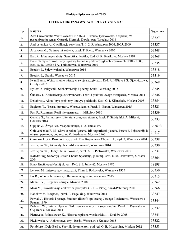 Biuletyn lipiec-wrzesień 2015 LITERATUROZNAWSTWO: RUSYCYSTYKA: Książka Acta Universitatis Wratislaviensis Nr 3624 : Elżbieta Tyszkowska-Kasprzak, W poszukiwaniu sensu. O prozie Siergieja Dowłatowa, Wrocław 2014 Sygnatura 2. Andrusiewicz A., Cywilizacja rosyjska, T. 1, 2, 3, Warszawa 2004, 2005, 2009 33337 3. Arbatowa M., Na imię mi kobieta, przeł. T. Kiełb, Warszawa 2005 33348 4. Bart R., Izbrannye raboty. Semiotika. Poetika, Red. G. K. Kosikova, Moskva 1994 33368 5. Białe plamy – czarne plany. Sprawy trudne w posko-rosyjksich stosunkach 1918 – 2008, Red. A. D. Rotfeld i A. Torkumowa, Warszawa 2010 33335 6. Brodski J., Śpiew wahadła, Warszawa 2014 33318 7. Brodski J., Urania, Warszawa 2015 33319 Lp. 1. 33327 9. Iwan Bunin. Wciąż smutno wierzę w swoje szczęście…. Red. A. NDiaye i G. Ojcewiczowa, Olsztyn 2013 Bykov D., Prizyvnik. Stichotvorenija i poemy, Sankt-Peterburg 2002 10. Čubarov I., Kollektivnaja čuvstvennost’. Teorii i praktiki levogo avangarda, Moskva 2014 33346 11. Dekabristy. Aktual’nye problemy i novye podchody, Sost. O. I. Kijanskaja, Moskva 2008 33354 12. Eagleton T., Teoria literatury. Wprowadzenie, Przeł. B. Baran, Warszawa 2015 33321 13. Fast P., Rozumem Rosji nie ogarniesz…, Mikołów 2010 Genette G., Palimpsesty. Literatura drugiego stopnia, Przeł. T. Stróżyński, A. Milecki, Gdański 2014 33339 15. Gippius Z., Živye lica. Vospominanija, T. 2, Tbilisi 1991 33367/2 16. Golovenčenko F. M., Slovo o polku Igoreve. Bibliografičeskij očerk. Perevod. Pojasnenija k tekstu i perevodu, pod red. A. V. Pozdneeva, Moskva 1963 14917 17. Gumilow L., Od Rusi do Rosji, przeł. Ewa Rojewska – Olejarczuk, wyd. 2, Warszawa 2004 33338 18. Jerofiejew W., Akimudy. Nieludzka opowieść, Warszawa 2014 33330 19. Jerofiejew W., Dobry Stalin. Powieść, przeł. A. L. Piotrowska, Warszawa 2012 33331 20. Kafedral’nyj Sobornyj Chram Christa Spasitelja, [album], sost. E. M. Jakovleva, Moskva 2004 33364 21. Kino. Enciklopedičeskij slovar’, Red. S. I. Jutkevič, Moskva 1986 19198 22. Leskow M., Interesujący mężczyźni, Tłum. I. Bojkowska, Warszawa 1975 33350 23. Lis R., W lodach Prowansji. Bunin na wygnaniu, Warszawa 2015 33315 24. Mann J. V., Turgenev i drugie, Moskva 2008 33362 25. Moss V., Pravoslavnaja cerkov’ na pereput’e (1917 – 1999), Sankt-Peterburg 2001 33366 26. Nabokov V., Rozpacz, przeł. L. Engelking, Warszawa 2014 33347 8. 14. 27. 28. Pawlak J., Historia i postęp. Studium filozofii społecznej Jerzego Plechanova, Warszawa ; Poznań 1990 Pielewin W., Batman Apollo. Nadczłowiek – to brzmi supermodnie! Przeł. E. Rojewska – Olejarczuk, Kraków 2014 33369 33345 33333 33344 33332 29. Pietrzycka-Bohosiewicz K., Historia zapisana w człowieku…, Kraków 2008 33341 30. Piwkowska A., Achmatowa, czyli Rosja, Warszawa ; Kraków 2015 33322 31. Politbjuro i Delo Berija. Sbornik dokumentom pod red. O. B. Mozochina, Moskva 2012 33353 32. 33. 34. 35. 36. 37. 38. Postmodernizm rosyjski i jego antycypacje, Red. A. Gildner, M. Ochniak. H. Waszkielewicz, Kraków 2007 Pravoslavnaja enciklopedija pod red. Patriarcha Kirilla, T. 37 : Konstantin – Korin, Moskva 2015 Pravoslavnaja enciklopedija pod red. Patriarcha Kirilla, T. 38 : Korinf - Kriskentija, Moskva 2015 Propp V., Russkie agrarnye prazdniki (Opyt istoriko-etnografičeskogo issledovanija), Moskva 2000 Radziwinowicz W., Gogol w czasach Google’a. Korespondencje z Rosji 1998 – 2012, Warszawa 2013 Rydzewski W., Dylematy rosyjskiej idei. Artykuły, szkice, recenzje. Wybór pism, pod red. L. Augustyna i M. Bohuna, Kraków 2014 Sadowski J., Rewolucje i kontrrewolucje obyczajów, Łódź 2005 33340 29460/37 29460/38 33358 33355 33329 33336 39. Siniawski A., Rosyjska inteligencja, przeł. M. Bieniek, wstęp M. Sutkowski, Warszawa 2014 33316 40. Słowo – kontekst – przekład, pod red. I. Dybiec-Gajer i A. Tereszkiewicz, Kraków 2014 33324 41. Smirnov V., Padenije Tret’ego Rima. Duchovnye osnowy vozroždenija Russkogo Pravoslavnogo Carstva Cerkovnaja reforma Nikona v netradicionnom rakurse, SanktPeterburg 2011 33357 42. Sołogub F., Mały Bies, Przeł i posł. R. Śliwoski, Poznań 2015 33325 33326 33317 43. Szczere opowiadania pielgrzyma jego ojcu duchownemu, Oprac. G. Hagioryta, Hajnówka brw 33343 44. Szczere opowiadania pielgrzyma jego ojcu duchownemu, Poznań 1988 33342 45. Tołstoj L., Droga życia, Przeł. A. Kunicka, Warszawa 2014 33323 46. Twardowski A., Poezje wybrane, Warszawa 1974 33349 47. Tyszkowska-Kasprzak E., W poszukiwaniu sensu. O prozie Siergieja Dowłatowa, Wrocław 2014 33327 48. Uglik J., Dostojewski czyli rzecz o dramacie człowieka, Warszawa 2014 33320 49. Vodolazkin E., Lavr. Neistoričeskij roman, Moskva 2015 33370 50. Wat A., Mój wiek, T. 1, 2, Kraków 2011 33352 51. Weir J., Leo Tolstoy and the Alibi of Narrative, London 2011 33351 52. Wellesz E., Historia muzyki i hymnografii bizantyjskiej, przeł. M. Kaziński, Kraków 2006 33356 53. Williams B., Lenin, Przeł. A. Tuszyńska, Wrocław 2002 33334 54. Wodołazkin J., Laur, Tłum. E. Skórska, Poznań 2015 33328 UKRAINISTYKA: 55. 56. 57. 58. Andruchovyč J., Leksykon miast intymnych: swobodny podręcznik do geopoetyki i kosmopolityki / przeł. Katarzyna Kotyńska, Wołowiec 2014 Andruchovyč J., Moscoviada: powieść grozy / przełożył Przemysław Tomanek; [przekł. przejrzała Tatiana Hołyńska]. Wyd. 3. Wołowiec 2015 Andruhovyč J., Leksykon ìntymnych mìst: dovìl'nyj posìbnyk z geopoetyky ta kosmopolìtyky. Kam'ânec'-Podil’s’kyj 2012 Andruhovyč J., Szcze Ne merla i nie umrze: rozmowa z Jurijem Andruchowyczem, P. Smoleński, Wołowiec 2014 U 5138 U 5136 U 5145 U 5151 U 5137 59. Butnyk-sìvers'kyj B. S, Ukraïns'ke radjans'ke narodne mystectvo. Kyïv 1966 [album] U 2889 60. Etymologičnyj slovnyk ukraïns’koï movy, T. 6: U – Ja. Kyïv 2012 U 1583/6 61. 62. Geo-Karpaty: utworzenie polsko-ukraińskiego szlaku turystycznego / red. nauk. Ihor Bubniak, Andrzej Solecki. Krosno 2014 [album] Glinianowic