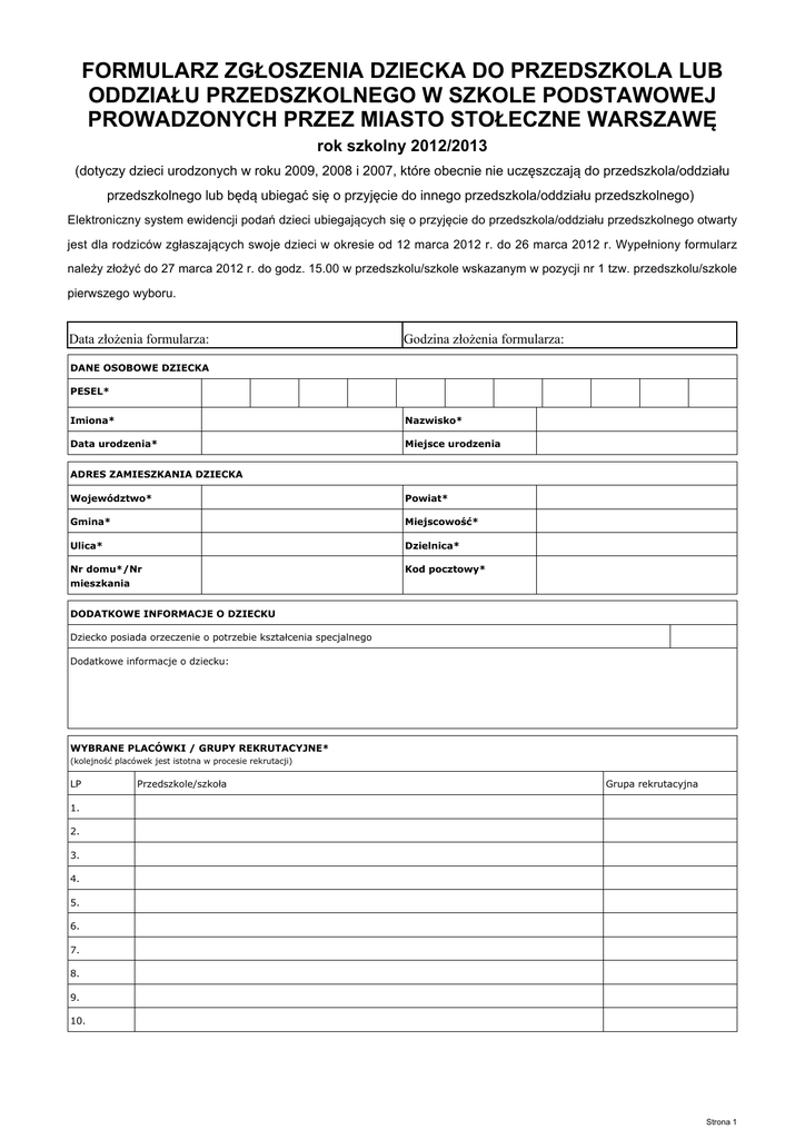FORMULARZ ZGŁOSZENIA DZIECKA DO PRZEDSZKOLA LUB ODDZIAŁU PRZEDSZKOLNEGO W SZKOLE PODSTAWOWEJ PROWADZONYCH PRZEZ MIASTO STOŁECZNE WARSZAWĘ rok szkolny 2012/2013 (dotyczy dzieci urodzonych w roku 2009, 2008 i 2007, które obecnie nie uczęszczają do przedszkola/oddziału przedszkolnego lub będą ubiegać się o przyjęcie do innego przedszkola/oddziału przedszkolnego) Elektroniczny system ewidencji podań dzieci ubiegających się o przyjęcie do przedszkola/oddziału przedszkolnego otwarty jest dla rodziców zgłaszających swoje dzieci w okresie od 12 marca 2012 r. do 26 marca 2012 r. Wypełniony formularz należy złożyć do 27 marca 2012 r. do godz. 15.00 w przedszkolu/szkole wskazanym w pozycji nr 1 tzw. przedszkolu/szkole pierwszego wyboru. Data złożenia formularza: Godzina złożenia formularza: DANE OSOBOWE DZIECKA PESEL* Imiona* Nazwisko* Data urodzenia* Miejsce urodzenia ADRES ZAMIESZKANIA DZIECKA Województwo* Powiat* Gmina* Miejscowość* Ulica* Dzielnica* Nr domu*/Nr mieszkania Kod pocztowy* DODATKOWE INFORMACJE O DZIECKU Dziecko posiada orzeczenie o potrzebie kształcenia specjalnego Dodatkowe informacje o dziecku: WYBRANE PLACÓWKI / GRUPY REKRUTACYJNE* (kolejność placówek jest istotna w procesie rekrutacji) LP Przedszkole/szkoła Grupa rekrutacyjna 1. 2. 3. 4. 5. 6. 7. 8. 9. 10. Strona 1 DANE OSOBOWE MATKI/OPIEKUNKI PRAWNEJ Opiekun Jest rodzicem (niepotrzebne skreślić) Jest opiekunem prawnym Imiona* Nie udzielił informacji Nie żyje Nieznany Nie żyje Nieznany Nazwisko* ADRES ZAMIESZKANIA MATKI/OPIEKUNKI PRAWNEJ Województwo* Powiat* Gmina* Miejscowość* Ulica* Nr domu*/Nr mieszkania Kod pocztowy* DANE KONTAKTOWE MATKI/OPIEKUNKI PRAWNEJ Telefon dom/komórka* Adres e-mail** DANE OSOBOWE OJCA/OPIEKUNA PRAWNEGO Opiekun Jest rodzicem (niepotrzebne skreślić) Jest opiekunem prawnym Imiona* Nie udzielił informacji Nazwisko* ADRES ZAMIESZKANIA OJCA/OPIEKUNA PRAWNEGO Województwo* Powiat* Gmina* Miejscowość* Ulica* Nr domu*/Nr mieszkania Kod pocztowy* DANE KONTAKTOWE OJCA/OPIEKUNA PRAWNEGO Telefon dom/komórka* Adres e-mail** * oznaczone pola wymagane ** adres email jest wykorzystywany do przesłania nowego hasła w przypadku zgubienia oraz poinformowania o wynikach kwalifikacji. Nadawca informacji przesłanej pocztą internetową nie gwarantuje jej skutecznego dostarczenia do skrzynki pocztowej adresata KRYTERIA PRZYJĘĆ (przy spełnianych kryteriach proszę postawić znak "X") Kryteria podstawowe Wynikające z Rozporządzenia Ministra Edukacji Narodowej i Sportu z 20 lutego 2004 r. 1 Dzieci matek lub ojców samotnie je wychowujących 2 Dzieci matek lub ojców, wobec których orzeczono znaczny lub umiarkowany stopień niepełnosprawności bądź całkowitą niezdolność do pracy oraz niezdolność do samodzielnej egzystencji 3 Dzieci umieszczone w rodzinach zastępczych Kryteria lokalne (kryterium obowiązuje tylko w przedszkolach przygotowujących żywienie dzieci wg indywidualnych zaleceń lekarskich wykaz tych placówek opublikowany jest w serwisie internetowym Biura Edukacji) 4 Dziecko, u którego stwierdzono alergię pokarmową potwierdzoną zaświadczeniem lekarza specjalisty Strona 2 Kryteria dodatkowe 5 Status zatrudnienia rodziców/prawnych opiekunów Należy wybrać jedną opcję Dziecko, którego oboje rodzice (prawni opiekunowie) pracują, wykonują pracę na podstawie umowy cywilnoprawnej, uczą się w trybie dziennym lub prowadzą pozarolniczą działalność gospodarczą Dziecko wychowywane przez samotnego, pracującego lub uczącego się rodzica (opiekuna prawnego) Dziecko, którego tylko jedno z dwojga rodziców (prawnych opiekunów) pracuje, wykonuje pracę na podstawie umowy cywilnoprawnej, uczy się w trybie dziennym lub prowadzi pozarolniczą działalność gospodarczą 6 Dziecko, którego rodzic/rodzice (prawny opiekun/prawni opiekunowie) rozliczają podatek dochodowy od osób fizycznych w urzędzie skarbowym na terenie m.st. Warszawy 7 Dziecko z placówki opiekuńczo-wychowawczej oraz dziecko z rodziny objętej nadzorem kuratorskim lub wsparciem asystenta rodziny 8 Dziecko, które ma rodzeństwo z orzeczonym średnim lub znacznym stopniem niepełnosprawności 9 Dziecko, którego rodzeństwo ubiega się jednocześnie po raz pierwszy o przyjęcie do tego samego przedszkola 10 Dziecko posiadające dwoje i więcej rodzeństwa poniżej 14 roku życia 1. .................................... 1 Dziecko, którego rodzeństwo kontynuuje w roku szkolnym 2012/2013 edukację w przedszkolu pierwszego wyboru Sposób dokumentowania spełniania kryteriów podstawowych (dokumenty, które rodzice przedkładają do wglądu dyrektora przedszkola pierwszego wyboru): Za osobę samotnie wychowującą dziecko uważa się jednego z rodziców albo opiekuna prawnego stanu wolnego, osobę pozostającą w separacji orzeczonej prawomocnym wyrokiem sądu, osobę rozwiedzioną, chyba że wychowuje wspólnie co najmniej jedno dziecko z jego rodzicem (definicja zawarta w art. 3 pkt 17a ustawy z dnia 28 listopada 2003 r. o świadczeniach rodzinnych - Dz. U. z 2006 r. Nr 139, poz. 992 z późn. zm.). Za osobę samotnie wychowującą dziecko uważa się także osobę pozostającą w związku małżeńskim, jeżeli jej małżonek został pozbawiony praw rodzicielskich lub odbywa karę pozbawienia wolności. Dla "dziecka samotnej matki lub ojca" potwierdzeniem jest jeden z dokumentów: - zaświadczenie z Urzędu Stanu Cywilnego potwierdzające aktualny stan cywilny (np. zupełny odpis aktu urodzenia dziecka, skrócony odpis aktu małżeństwa z adnotacją o rozwodzie) lub inne dokumenty potwierdzające stan cywilny, - wyrok sądu rodzinnego o pozbawieniu praw rodzicielskich lub separacji, - zaświadczenie z Zakładu Karnego o odbywaniu kary pozbawienia wolności, - oświadczenie rodzica o samotnym wychowywaniu dziecka. Dla "dziecka rodzica, wobec którego orzeczono znaczny lub umiarkowany stopień niepełnosprawności bądź całkowitą niezdolność do pracy oraz niezdolno