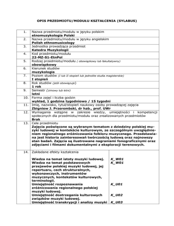 OPIS PRZEDMIOTU/MODUŁU KSZTAŁCENIA (SYLABUS) 1. 2. 3. 4. 5. 6. 7. 8. 9. 10. 11. 12. 13. Nazwa przedmiotu/modułu w języku polskim etnomuzykologia Polski Nazwa przedmiotu/modułu w języku angielskim Polish ethnomusicology Jednostka prowadząca przedmiot Katedra Muzykologii Kod przedmiotu/modułu 22-MZ-S1-EtnPol Rodzaj przedmiotu/modułu ( obowiązkowy lub fakultatywny) obowiązkowy Kierunek studiów muzykologia Poziom studiów (I lub II stopień lub jednolite studia magisterskie) I stopień Rok studiów (jeśli obowiązuje) 1 rok Semestr (zimowy lub letni) letni Forma zajęć i liczba godzin wykład, 1 godzina tygodniowo / 15 tygodni Imię, nazwisko, tytuł/stopień naukowy osoby prowadzącej zajęcia Zbigniew J. Przerembski, dr hab., prof. UWr Wymagania wstępne w zakresie wiedzy, umiejętności i kompetencji społecznych dla przedmiotu/modułu oraz zrealizowanych przedmiotów Brak Cele przedmiotu Zajęcia poświęcone są wybranym tematom z dziedziny polskiej muzyki ludowej w kontekście kulturowym, ze szczególnym uwzględnieniem regionalnego zróżnicowania folkloru muzycznego. Przedstawiana jest historia zainteresowań twórczością ludową oraz najnowszy stan badań. Zajęcia są ilustrowane nagraniami fonograficznymi oraz zdjęciami i filmami dokumentalnymi z eksploracji terenowych. 14. Zakładane efekty kształcenia Wiedza na temat istoty muzyki ludowej. Wiedza na temat podstawowych przejawów polskiej muzyki ludowej, jej repertuaru, cech strukturalnych, wykonawczych, instrumentów muzycznych, kontekstów kulturowych, terminologii. Umiejętność rozpoznawania zróżnicowania regionalnego polskiej muzyki ludowej. Umiejętność dostrzegania kulturowych związków muzyki ludowej. Umiejętność transkrypcji i analizy muzyki K_W01 K_W01 K_U01 K_U02 K_U03 ludowej. Świadomość potrzeby badania, kultywoK_K01 wania i ochrony polskiej muzyki ludowej. 15. Treści programowe Wykłady dotyczą takich zagadnień jak: muzyka ludowa – istota, podstawowe pojęcia, cechy strukturalne i wykonawcze, styl, repertuar, funkcja; metodologia i metodyka badań etnomuzykologicznych; miejsce muzyki ludowej w cyklu ludzkiego życia i kalendarza; formy niezwrotkowe; melodyka, style i formy melodyczne; systemy tonalne; systemy metrorytmiczne; instrumenty muzyczne; metody transkrypcji pieśni i muzyki ludowej; folklor, folkloryzm, tradycyjny i nowy byt muzyki ludowej. Szczególna uwaga poświęcona jest zróżnicowaniu etnomuzycznemu Polski – folklor wybranych regionów rozpatrywany pod względem repertuaru, cech stylistycznych i wykonawczych, sylwetek wybitnych wykonawców, a także jako źródło inspiracji kompozytorów muzyki klasycznej. 16. Zalecana literatura (podręczniki) Ludwik Bielawski, Rytmika polskich pieśni ludowych, Kraków 1970. Ludwik Bielawski, Tradycje ludowe w kulturze muzycznej, Warszawa 1999. Jadwiga Romana Bobrowska, Pieśni ludowe regionu żywieckiego, Kraków, 1981. Jadwiga Romana Bobrowska, Polska folklorystyka muzyczna, Katowice, 2000. Adolf Chybiński, O polskiej muzyce ludowej, red. Ludwik Bielawski, Kraków 1961. Anna Czekanowska, Pieśni biłgorajskie. Przyczynek do interpretacji polskiego pogranicza południowo-wschodniego. Wrocław 1961. Anna Czekanowska, Etnografia muzyczna. Metodologia i metodyka, Warszawa, 1971. Dahlig, Ewa, Ludowa gra skrzypcowa w Kieleckiem, Kraków, 1991. Piotr Dahlig, Muzyka ludowa we współczesnym społeczeństwie, Warszawa 1987. Piotr Dahlig, Ludowa praktyka muzyczna w komentarzach i opiniach wykonawców ludowych, Warszawa 1993. Adolf Dygacz, Pieśni górnicze. Studium i materiały, Katowice 1960. Adolf Dygacz, Rzeka Odra w polskiej pieśni ludowej. Studium folklorystyczne, Katowice, 1966. W. Witosława Frankowska, Muzyka Kaszub. Materiały encyklopedyczne, Gdańsk-Wejherowo 2005. Alina Kopoczek, Folklor muzyczny Beskidu Śląskiego. Materiały pomocnicze do analizy pieśni ludowych, Katowice 1993. Alojzy Kopoczek, Instrumenty muzyczne Beskidu Śląskiego i Żywieckiego. Aerofony proste i ich repertuar, Bielsko-Biała, 1984. Alojzy Kopoczek, Ludowe instrumenty muzyczne polskiego obszaru karpackiego. Instrumenty dęte, Rzeszów 1966. Włodzimierz Kotoński, „Uwagi o muzyce ludowej Podhala”, Muzyka (1953), 5-6, 7-8, 11-12, (1954), 1-2. Bożena Lewandowska, Józef Kąś, Wesele orawskie, dawniej i dziś, Wrocław 2010. Bogusław Linette, Obrzędowe pieśni weselne w Rzeszowskiem. Typologia wątków muzycznych jako kryterium wyznaczania regionu etnograficznego, Rzeszów 1981. Józef Majchrzak, Polska pieśń ludowa na Dolnym Śląsku, Warszawa – Wrocław 1983. Tomasz M. Nowak, Tradycje muzyczne społeczności polskiej na Wileńszczyźnie, Warszawa, 2005. Stanisław Olędzki, Zbigniew Kamykowski, Polskie instrumenty ludowe, Kraków 1978. Aleksander Pawlak, Folklor muzyczny Kujaw, Kraków 1981. Przerembski, Zbigniew Jerzy, Do interpretacji skali góralskiej, „Muzyka” 1987 nr 2. Przerembski, Zbigniew Jerzy, Regionalna zmienność wysokości śpiewu ludowego w Polsce, „Muzyka”, 1993 nr 3-4. Zbigniew J. Przerembski, Style i formy melodyczne polskich pieśni ludowych, Warszawa 1994. Zbigniew J. Przerembski, „Siesieńki na Krupówkach – przemieszanie czy synteza tradycji?”, Muzykologia u progu trzeciego tysiąclecia. Teoria i praktyka, red. Ludwik Bielawski, J. Katarzyna Kozicka, Agnieszka Leszczyńska, Warszawa 2000. Zbigniew J. Przerembski, „Ludowa kultura muzyczna – tradycja modyfikowana”, Muzyka, 2006, nr 1-2. Zbigniew J. Przerembski, „The muzykant as a product of nature and of culture”, Interdisciplinary Studies in Musicology, 2009, t. 8, s. 119-136. Zbigniew J. Przerembski, „Współczesna praktyka folklorystyczna: problemy funkcji, repertuaru, stylu wykonawczego, instrumentarium muzycznego”, w: Przekaz tradycji ludowej we współczesnej kulturze, Zakopane 2011. Zbigniew J. Przerembski, „O sygnałowych funkcjach ludowych instrumentów muzycznych”, w: Instrumentarium Muzyki Ludowej, Zakopane 2011. Dorota Sim