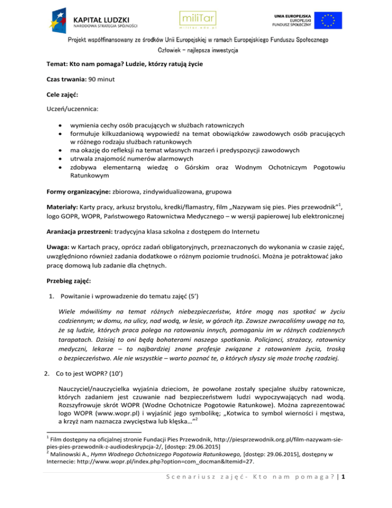 Temat: Kto nam pomaga? Ludzie, którzy ratują życie Czas trwania: 90 minut Cele zajęć: Uczeń/uczennica: wymienia cechy osób pracujących w służbach ratowniczych formułuje kilkuzdaniową wypowiedź na temat obowiązków zawodowych osób pracujących w różnego rodzaju służbach ratunkowych ma okazję do refleksji na temat własnych marzeń i predyspozycji zawodowych utrwala znajomość numerów alarmowych zdobywa elementarną wiedzę o Górskim oraz Wodnym Ochotniczym Pogotowiu Ratunkowym Formy organizacyjne: zbiorowa, zindywidualizowana, grupowa Materiały: Karty pracy, arkusz brystolu, kredki/flamastry, film „Nazywam się pies. Pies przewodnik”1, logo GOPR, WOPR, Państwowego Ratownictwa Medycznego – w wersji papierowej lub elektronicznej Aranżacja przestrzeni: tradycyjna klasa szkolna z dostępem do Internetu Uwaga: w Kartach pracy, oprócz zadań obligatoryjnych, przeznaczonych do wykonania w czasie zajęć, uwzględniono również zadania dodatkowe o różnym poziomie trudności. Można je potraktować jako pracę domową lub zadanie dla chętnych. Przebieg zajęć: 1. Powitanie i wprowadzenie do tematu zajęć (5’) Wiele mówiliśmy na temat różnych niebezpieczeństw, które mogą nas spotkać w życiu codziennym; w domu, na ulicy, nad wodą, w lesie, w górach itp. Zawsze zwracaliśmy uwagę na to, że są ludzie, których praca polega na ratowaniu innych, pomaganiu im w różnych codziennych tarapatach. Dzisiaj to oni będą bohaterami naszego spotkania. Policjanci, strażacy, ratownicy medyczni, lekarze – to najbardziej znane profesje związane z ratowaniem życia, troską o bezpieczeństwo. Ale nie wszystkie – warto poznać te, o których słyszy się może trochę rzadziej. 2. Co to jest WOPR? (10’) Nauczyciel/nauczycielka wyjaśnia dzieciom, że powołane zostały specjalne służby ratownicze, których zadaniem jest czuwanie nad bezpieczeństwem ludzi wypoczywających nad wodą. Rozszyfrowuje skrót WOPR (Wodne Ochotnicze Pogotowie Ratunkowe). Można zaprezentować logo WOPR (www.wopr.pl) i wyjaśnić jego symbolikę; „Kotwica to symbol wierności i męstwa, a krzyż nam naznacza zwycięstwa lub klęska…”2 1 Film dostępny na oficjalnej stronie Fundacji Pies Przewodnik, http://piesprzewodnik.org.pl/film-nazywam-siepies-pies-przewodnik-z-audiodeskrypcja-2/, [dostęp: 29.06.2015] 2 Malinowski A., Hymn Wodnego Ochotniczego Pogotowia Ratunkowego, [dostęp: 29.06.2015], dostępny w Internecie: http://www.wopr.pl/index.php?option=com_docman&Itemid=27. Scenariusz zajęć- Kto nam pomaga?|1 Uczniowie i uczennice wymieniają obowiązki ratowników WOPR. 3. Co to jest GOPR? (10’) Nauczyciel/nauczycielka poleca dzieciom rozszyfrowanie skrótu GOPR (Górskie Ochotnicze Pogotowie Ratunkowe). W razie trudności nawiązuje do wcześniej wprowadzonej nazwy WOPR i wyjaśnia, że analogicznie do służb wodnych, aby czuwać nad bezpieczeństwem turystów przemierzających górskie szlaki i w razie potrzeby prowadzić akcje ratownicze, również powołano specjalne służby ratownicze. Prezentuje logo GOPR (www.gopr.pl) i wyjaśnia jego symbolikę: „…równoramienny krzyż - symbol nadziei, ratunku i pomocy. Owalny kształt odznaki GOPR nawiązuje kształtem do zwoju liny wspinaczkowej. Białe tło symbolizuje kolor zimy górskiej, śniegu i lodu. Kolor błękitny to odniesienie do koloru nieba nad górami oraz przestrzeni. Ostatnim elementem jest gałązka kosodrzewiny – symbol gór. Srebrny kolor gałązki ma przypominać, że w górach często pojawiają się mgła i szron.”3 Uczniowie wymieniają zadania zawodowe GOPR-owców. 4. Co to jest PRM? (10’) Najczęściej możemy spotkać ratowników medycznych – należą oni do służb Państwowego Ratownictwa Medycznego - stanowią załogę popularnych „karetek pogotowia", ambulansów. Ich zadaniem jest ratowanie życia ludzi poprzez udzielanie im pierwszej pomocy. Nauczyciel/nauczycielka prezentuje logo PRM oraz wyjaśnia znaczenie liter umieszczonych na ambulansach. Tłumaczy, że współcześnie możemy spotkać karetki oznaczone symbolami S, P oraz T (Encyklopedia internetowa – Wikipedia, http://pl.wikipedia.org/wiki/Ambulans). Nauczyciel/nauczycielka wprowadza adres do wyszukiwarki, podkreślając możliwość szybkiego odnalezienia potrzebnych informacji w wirtualnej sieci. 5. Karta pracy „Służby ratownicze” (15’) (zadanie zróżnicowane ze względu na stopień trudności) Uczniowie i uczennice, na podstawie rozmowy z nauczycielem/nauczycielką, wypełniają Kartę pracy. Niezbędne jest do tego udzielenie odpowiedzi na następujące pytania: Jakie cechy powinna posiadać osoba, która chce ratować innych? Które z wymienionych cech są wspólne dla wszystkich ratowników i pracowników służb? Jakie cechy szczególne powinni posiadać: policjanci, strażacy, ratownicy wodni, ratownicy górscy, ratownicy medyczni? 6. Gdybym był(a) ratownikiem? (15’) Rozmowa na temat „Czy chciałbym/chciałabym pracować w służbach ratowniczych?”. Każdy/każda z uczniów/uczennic zastanawia się nad tym, praca którego rodzaju służb ratowniczych jest mu/jej najbliższa. Chętni zabierają głos na forum. Każdy/każda z uczniów/uczennic rysuje siebie jako ratownika – wykorzystują do tego sylwetki zamieszczone w Karcie pracy. Uzupełniają kontur o atrybuty niezbędne w pracy poszczególnych osób, podpisują w razie konieczności poszczególne elementy. 3 Młocka M., Historia odznaki GOPR, [online], 2013, [dostęp: 29.06.2015], dostępny w Internecie: http://www.portalgorski.pl/artykuly/recenzje/1904-historia-odznaki-gopr. Scenariusz zajęć- Kto nam pomaga?|2 7. Ratownicy – nie tylko ludzie (10’) Nauczyciel/nauczycielka zwraca uwagę uczniów na fakt, iż w ratowaniu ludzi z różnych opresji biorą również udział specyficzni ratownicy – zwierzęta. Pomagają ratownikom-ludziom, odnajdują zaginionych, tropią, ale również ostrzegają przed niebezpieczeństwami, np.: zao