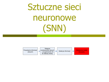 Sztuczne sieci neuronowe (SNN) Pozyskanie informacji (danych) Wstępne przetwarzanie danych – przygotowanie ich do dalszej analizy Selekcja informacji Ostateczny model decyzyjny SSN - podstawy Sieci neuronowe stosowane są do rozwiązywania problemów typu uczenie maszyn: rozpoznawanie obrazów Rozpoznawanie mowy itp. Cecha: Zdolność automatycznego uczenia się poprzez adaptację swojej struktury i jej właściwości do stawianego sieci zadania Podział sieci ze względu na charakter problemu Uczenie nienadzorowane, Uczenie z krytykiem Uczenie nadzorowane Autoasocjacja Uczenie nienadzorowane analiza skupień, klasteryzacja, grupowanie danych Ucząc model nie wiemy nic o tym czego czego mamy się nauczyć przykład: sieci samoorganizujące się Kochonena, Przykład: Czytając różne książki nie wiemy co się na ich podstawi nauczymy ale na pewno czegoś się nauczymy. Przykład: Mając dane dotyczące różnych kwiatów np. irysów (długości i szerokości kielicha oraz długości i szerokości płatka) chcemy się dowiedzieć iloma różnymi odmianami irysa dysponujemy Uczenie nienadzorowane analiza skupień, klasteryzacja, grupowanie danych Ucząc model nie wiemy nic o tym czego czego mamy się nauczyć przykład: sieci samoorganizujące się Kochonena, Przykład: Czytając różne książki nie wiemy co się na ich podstawi nauczymy ale na pewno czegoś się nauczymy. Przykład: Mając dane dotyczące różnych kwiatów np. irysów (długości i szerokości kielicha oraz długości i szerokości płatka) chcemy się dowiedzieć iloma różnymi odmianami irysa dysponujemy Uczenie nadzorowane Uczymy się na przykładach które już ktoś rozwiązał i próbujemy zrozumieć jak zostały rozwiązane, by później samemu móc rozwiązywać podobne zadania Problemy regresyjne – gdy nasz cel uczenia daje się zapisać jako liczba rzeczywista (np.. Cena itp) Na podstawie położenia lokalu, jego powierzchni, wieku itp. Dokonać automatycznej wyceny tegoż lokalu (Boston houses) Na podstawie analiz rynku przewidzieć zmiany wartości akcji przedsiębiorstwa Problemy klasyfikacyjne – gdy nasz celu uczenia jest czymś co nie jest liczbą, jest symbolem (np. typ choroby, gatunek roślin itp) Uczenie nadzorowane Uczymy się na przykładach które już ktoś rozwiązał i próbujemy zrozumieć jak zostały rozwiązane, by później samemu móc rozwiązywać podobne zadania Problemy regresyjne – gdy nasz cel uczenia daje się zapisać jako liczba rzeczywista (np.. Cena itp) Na podstawie położenia lokalu, jego powierzchni, wieku itp. Dokonać automatycznej wyceny tegoż lokalu (Boston houses) Na podstawie analiz rynku przewidzieć zmiany wartości akcji przedsiębiorstwa Problemy klasyfikacyjne – gdy nasz celu uczenia jest czymś co nie jest liczbą, jest symbolem (np. typ choroby, gatunek roślin itp) Uczenie nadzorowane Uczymy się na przykładach które już ktoś rozwiązał i próbujemy zrozumieć jak zostały rozwiązane, by później samemu móc rozwiązywać podobne zadania Problemy regresyjne – gdy nasz cel uczenia daje się zapisać jako liczba rzeczywista (np.. Cena itp) Na podstawie położenia lokalu, jego powierzchni, wieku itp. Dokonać automatycznej wyceny tegoż lokalu (Boston houses) Na podstawie analiz rynku przewidzieć zmiany wartości akcji przedsiębiorstwa Problemy klasyfikacyjne – gdy nasz celu uczenia jest czymś co nie jest liczbą, jest symbolem (np. typ choroby, gatunek roślin itp) Na podstawie zawartości alkoholu, kwasowości, zawartości fenoli, intensywności koloru itp. odgadnąć producenta wina spośród trzech producentów z tego samego regionu Włoch (wine) Na podstawie analiz medycznych przewidzieć czy pacjentka cierpi na raka piersi czy nie Uczenie nadzorowane Uczymy się na przykładach które już ktoś rozwiązał i próbujemy zrozumieć jak zostały rozwiązane, by później samemu móc rozwiązywać podobne zadania Problemy regresyjne – gdy nasz cel uczenia daje się zapisać jako liczba rzeczywista (np.. Cena itp) Na podstawie położenia lokalu, jego powierzchni, wieku itp. Dokonać automatycznej wyceny tegoż lokalu (Boston houses) Na podstawie analiz rynku przewidzieć zmiany wartości akcji przedsiębiorstwa Problemy klasyfikacyjne – gdy nasz celu uczenia jest czymś co nie jest liczbą, jest symbolem (np. typ choroby, gatunek roślin itp) Na podstawie zawartości alkoholu, kwasowości, zawartości fenoli, intensywności koloru itp. odgadnąć producenta wina spośród trzech producentów z tego samego regionu Włoch (wine) Na podstawie analiz medycznych przewidzieć czy pacjentka cierpi na raka piersi czy nie Uczenie z krytykiem Uczenie gdy jedyną dostępną informacja o tym co nauczyliśmy się jest typu „nagroda/kara”. W pewnym sensie odmiana uczenia pod nadzorem gdzie nie jest znana wielkość popełnionego błędu a jedynie informacja typu „prawda – fałsz” Przykład: Uczenie robota chodzenia – przewróci się (-) nie przewrócił się (+) Strategie przetrwania dla systemów agentowych – przeżył (+), zginął (-) Uczenie z krytykiem Uczenie gdy jedyną dostępną informacja o tym co nauczyliśmy się jest typu „nagroda/kara”. W pewnym sensie odmiana uczenia pod nadzorem gdzie nie jest znana wielkość popełnionego błędu a jedynie informacja typu „prawda – fałsz” Przykład: Uczenie robota chodzenia – przewróci się (-) nie przewrócił się (+) Strategie przetrwania dla systemów agentowych – przeżył (+), zginął (-) Analiza koszykowa -> asocjacja Problemy asocjacyjne to problem typu „co wiąże się z czym” przykład – sieci Hopfielda Przykładowe zastosowania – socjo-marketing idąc do sklepu co jeszcze kupujemy kupując paluszki słone. Innymi słowy z czym wiążą się paluszki podczas zakupów np. piwo Analiza koszykowa -> asocjacja Problemy asocjacyjne to problem typu „co wiąże się z czym” przykład – sieci Hopfielda Przykładowe zastosowania – socjo-market