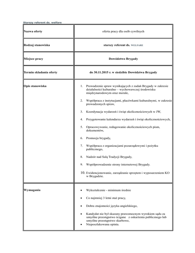 Starszy referent ds. welfare oferta pracy dla osób cywilnych Nazwa oferty Rodzaj stanowiska starszy referent ds. WELFARE Dowództwo Brygady Miejsce pracy Termin składania oferty Opis stanowiska do 30.11.2015 r. w siedzibie Dowództwa Brygady 1. Prowadzenie spraw wynikających z zadań Brygady w zakresie działalności kulturalno – wychowawczej środowisku międzynarodowym oraz morale, 2. Współpraca z instytucjami, placówkami kulturalnymi, w zakresie prowadzonych spraw, 3. Koordynacja wydarzeń i świąt okolicznościowych w JW, 4. Przygotowanie kalendarza wydarzeń i świąt okolicznościowych, 5. Opracowywanie, redagowanie okolicznościowych pism, dokumentów, 6. Promocja brygady, 7. Współpraca z organizacjami pozarządowymi i pożytku publicznego, 8. Nadzór nad Salą Tradycji Brygady, 9. Współprowadzenie strony internetowej Brygady. 10. Ewidencjonowanie, zarządzanie sprzętem i wyposarzeniem KO w Brygadzie. Wymagania Wykształcenie - minimum średnie Co najmniej 3 letni staż pracy, Dobra znajomości języka angielskiego, Kandydat nie był skazany prawomocnym wyrokiem sądu za umyślne przestępstwo ścigane z oskarżenia publicznego lub umyślne przestępstwo skarbowe, Nieposzlakowana opinia. Dodatkowe wymagania doświadczenie zawodowe w administracji publicznej, dyspozycyjność, samodzielność, odpowiedzialność, dobra organizacja pracy, znajomość przepisów z zakresu: rachunkowości, podatku dochodowego od osób fizycznych, znajomość obsługi komputera: Microsoft Windows, Microsoft Word, Microsoft Excel, poczta elektroniczna, obsługa faxu, kserokopiarki i innych urządzeń biurowych, umiejętność współpracy w zespole. Jak się ubiegać oferty CV (w języku angielskim), dokumenty potwierdzające posiadane kwalifikacje, list motywacyjny można przesyłać listownie lub faxem. Inne Do oferty wskazanym jest dołączenie opinii z poprzednich miejsc pracy Informacje kontaktowe adres Dowództwo Wielonarodowej Brygady Sekcja Personalna (S-1) ul. Radziszewskiego 4 20-400 Lublin (81) 261 183011 telefon miejski fax (81) 261 183019 fax miejski osoba upoważniona do kontaktów Data dodania oferty kpt. Marek CISŁO 19.11.2015 r. Zastrzegamy sobie możliwość kontaktu tylko z wybranymi kandydatami. Zainteresowanych informujemy, że nadesłanych ofert nie zwracamy.