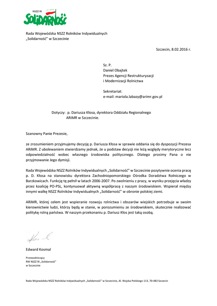 Rada Wojewódzka NSZZ Rolników Indywidualnych „Solidarność” w Szczecinie Szczecin, 8.02.2016 r. Sz. P. Daniel Obajtek Prezes Agencji Restrukturyzacji i Modernizacji Rolnictwa Sekretariat: e-mail: [email protected] Dotyczy: p. Dariusza Kłosa, dyrektora Oddziału Regionalnego ARiMR w Szczecinie. Szanowny Panie Prezesie, ze zrozumieniem przyjmujemy decyzję p. Dariusza Kłosa w sprawie oddania się do dyspozycji Prezesa ARiMR. Z ubolewaniem stwierdzamy jednak, że u podstaw decyzji nie leżą względy merytoryczne lecz odpowiedzialność wobec własnego środowiska politycznego. Dlatego prosimy Pana o nie przyjmowanie Jego dymisji. Rada Wojewódzka NSZZ Rolników Indywidualnych „Solidarność” w Szczecinie pozytywnie ocenia pracę p. D. Kłosa na stanowisku dyrektora Zachodniopomorskiego Ośrodka Doradztwa Rolniczego w Barzkowicach. Funkcję tę pełnił w latach 2006-2007. Po zwolnieniu z pracy, w wyniku przejęcia władzy przez koalicję PO-PSL, kontynuował aktywną współpracę z naszym środowiskiem. Wspierał między innymi walkę NSZZ Rolników Indywidualnych „Solidarność” w obronie polskiej ziemi. ARiMR, której celem jest wspieranie rozwoju rolnictwa i obszarów wiejskich potrzebuje w swoim kierownictwie ludzi, którzy będą w stanie, w porozumieniu ze środowiskiem, skutecznie realizować politykę rolną państwa. W naszym przekonaniu p. Dariusz Kłos jest taką osobą. Edward Kosmal Przewodniczący RW NSZZ RI „Solidarność” w Szczecinie Rada Wojewódzka NSZZ Rolników Indywidualnych „Solidarność” w Szczecinie, Al. Wojska Polskiego 113, 70-483 Szczecin